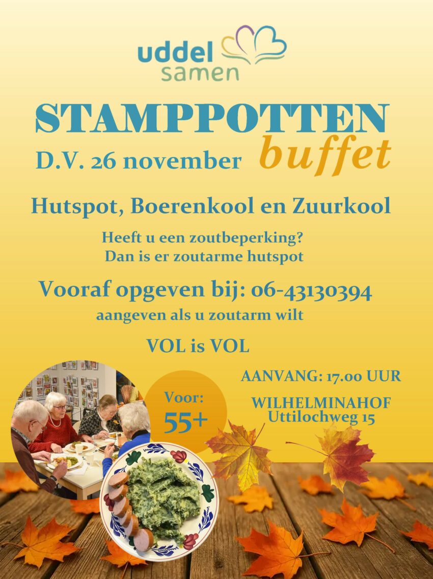UDDEL – D.V. 26 november bent u weer welkom voor het stamppotbuffet van Uddel Samen. U kunt zich daarvoor opgeven…