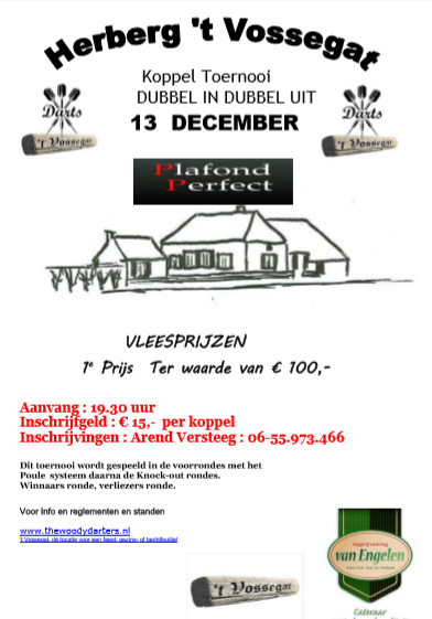 UDDEL – 13 december wordt een koppeltoernooi gehouden bij Herberg ’t Vossegat in Uddel. De aanvang van dit toernooi zal zijn om 19.30 en inschrijfgeld zal €15 per koppel bedragen.
