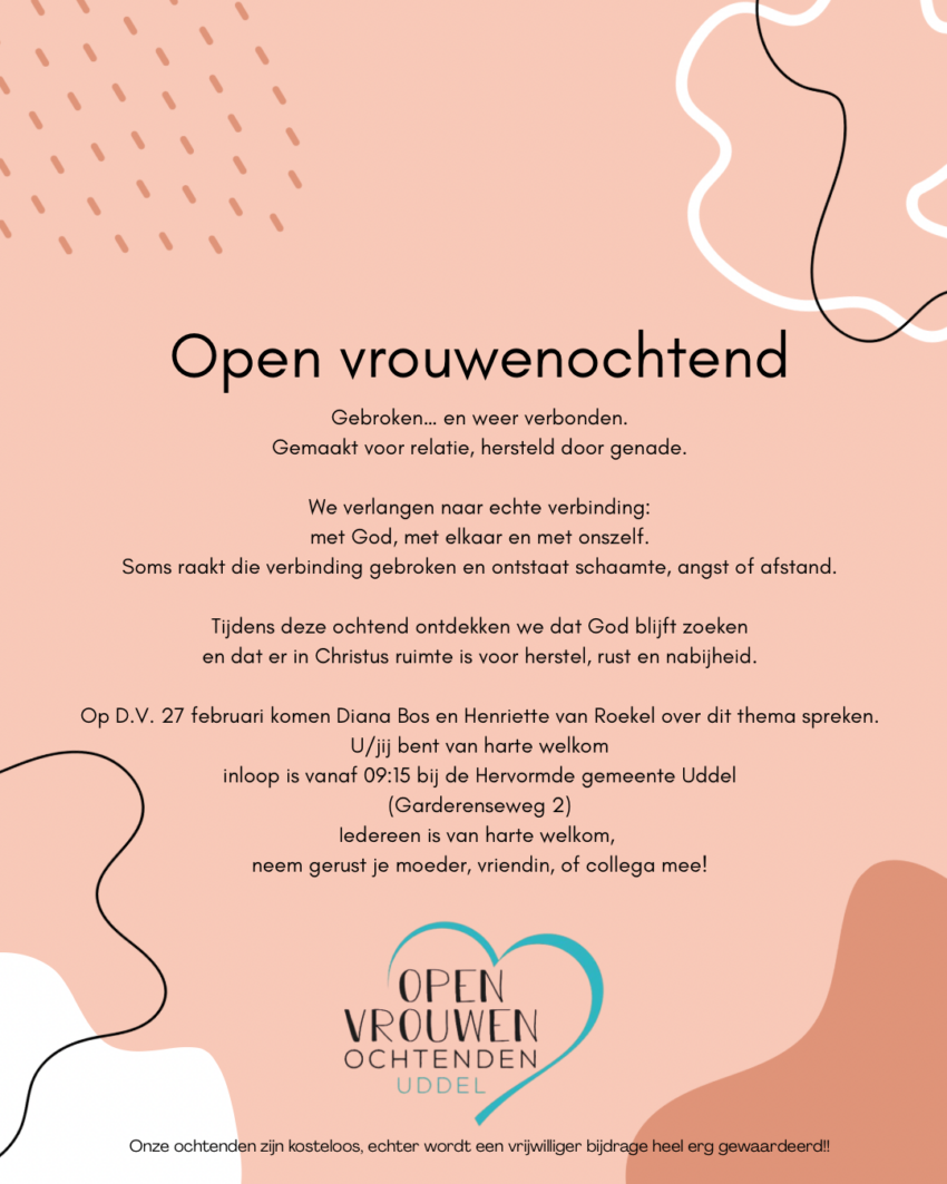 UDDEL – D.V. 27 februari is er weer een open vrouwenochtend. Informatie over het thema treft u op bovenstaande flyer…