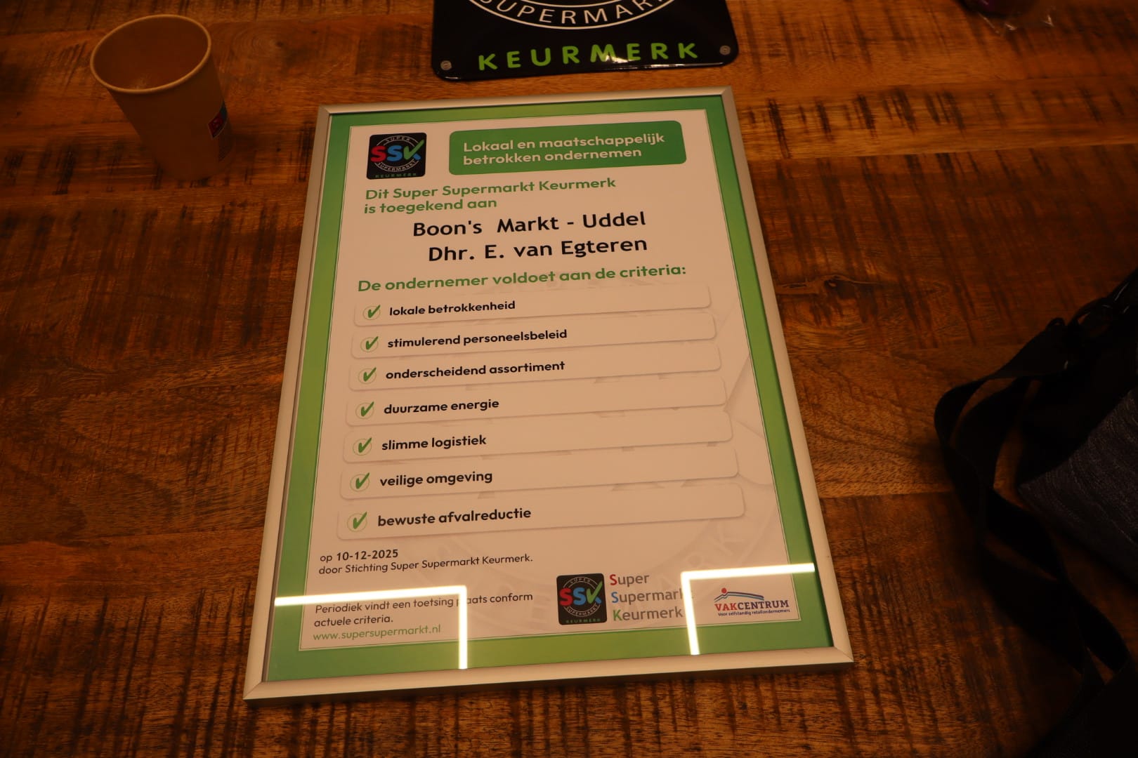 Bram de Jong, voorzitter Stichting Super Supermarkt Keurmerk, reikte het keurmerk uit. Hij benadrukte dat het SSK geen eenvoudig te behalen keurmerk is. Ondernemer Van Egteren is dan ook supertrots op het behaalde resultaat: ‘Dit is een waardering voor de onderscheidende aspecten van ons bedrijf. Klanten vinden het bovendien prettig om boodschappen te doen bij een supermarkt die lokaal verantwoordelijk onderneemt.’