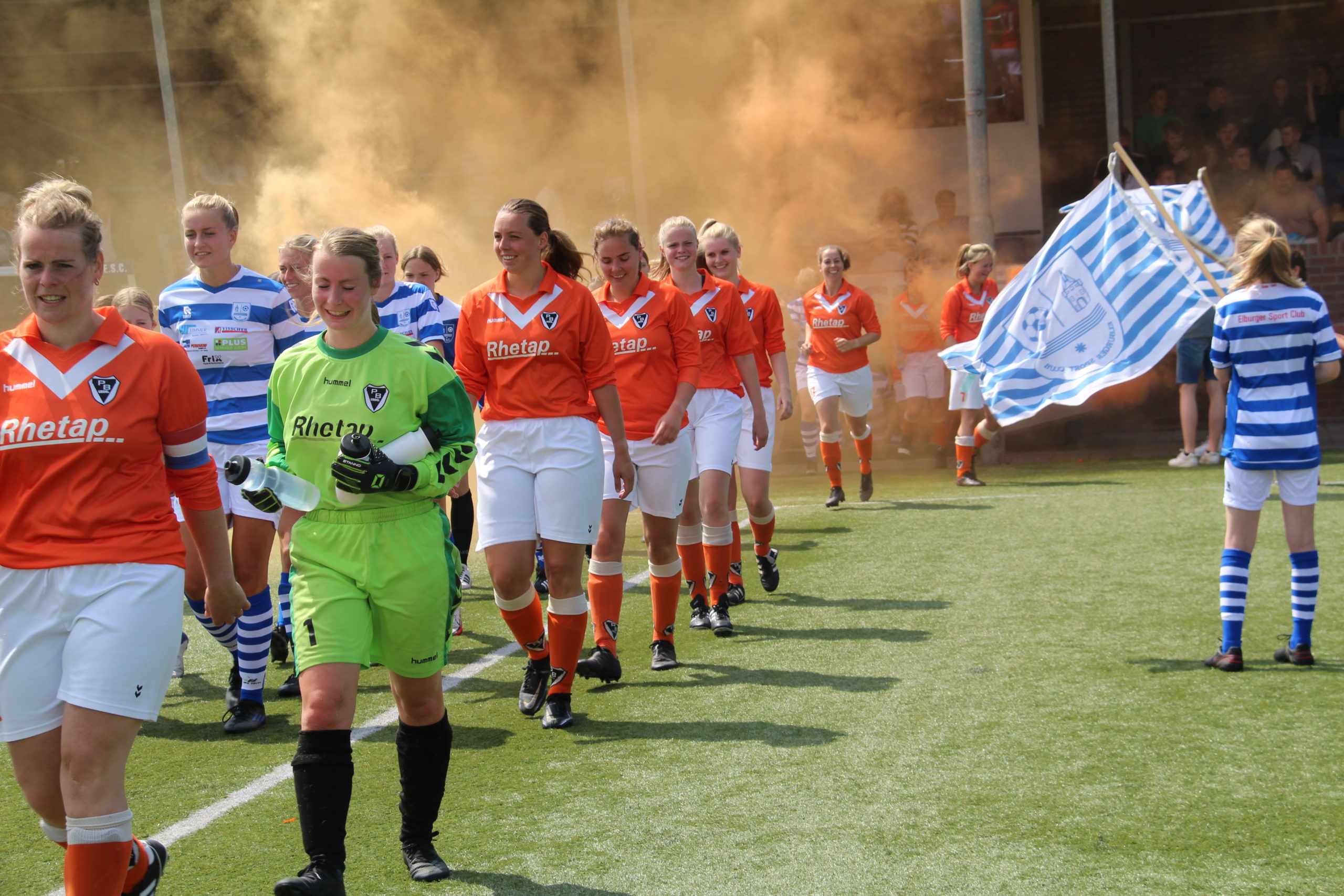 Na de rust een aanvallend ESC en PB werd teruggedrongen. Er ontstonden enkele hachelijke situaties voor de goalie Ineke wist haar doel schoon te houden. Tot de 83e minuut…. Een situatie op het middenveld waar een speelster van ESC en Samantha van Essen naar de bal gingen. De scheidsrechter stond echter in het midden en liep pardoes Samantha omver. De speelster van ESC schoot de bal richting doel van PB echter floot de scheidsrechter. Toen hij constateerde dat de bal in het doel verdween gaf hij uiteindelijk een doelpunt. Meiden (als ook begeleiding) over de zeik omdat er reeds gefloten was voordat de bal in het doel lag. Protesten mochten echter niet baten. Tijd voor teleurstelling was er niet. Kopjes bij elkaar gestoken en elkaar nog één keer opgepept. Met de steun van de supporters de laatste minuten vol de aanval gezocht. Tot we ver in de blessuretijd een corner mochten nemen. Marlou gaf deze strak voor en na slecht wegwerken van ESC gaf Amber het laatste zetje…… 3 – 4!!!Wat was de ontlading groot. Speelsters/begeleiding en zelfs supporters renden het veld op. Echter moest er nog wel afgetrapt worden en je wist niet hoelang de scheidsrechter nog zou laten doorspelen. De voorsprong werd vastgehouden en zo kon de feestvreugde beginnen.