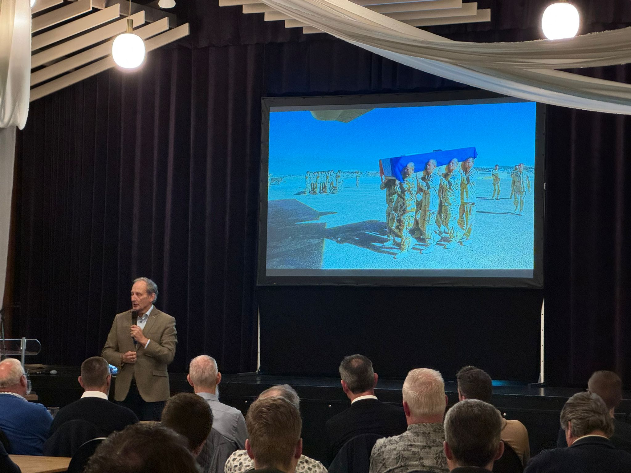 Tot slot sprak hij over weerbaarheid. De oorlog in Oekraïne wordt volgens hem niet gewonnen door de Russen, omdat de wil van de Oekraïners niet te breken is. “Een soldaat in de loopgraaf vecht niet om te winnen, maar om te overleven — voor zichzelf en voor zijn buddy”. Dat omzien naar elkaar is iets wat ook in Nederland broodnodig is.”