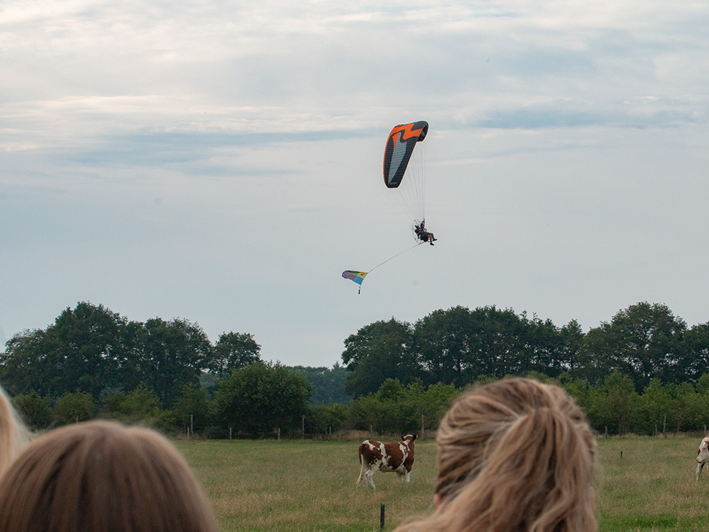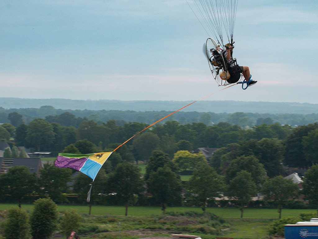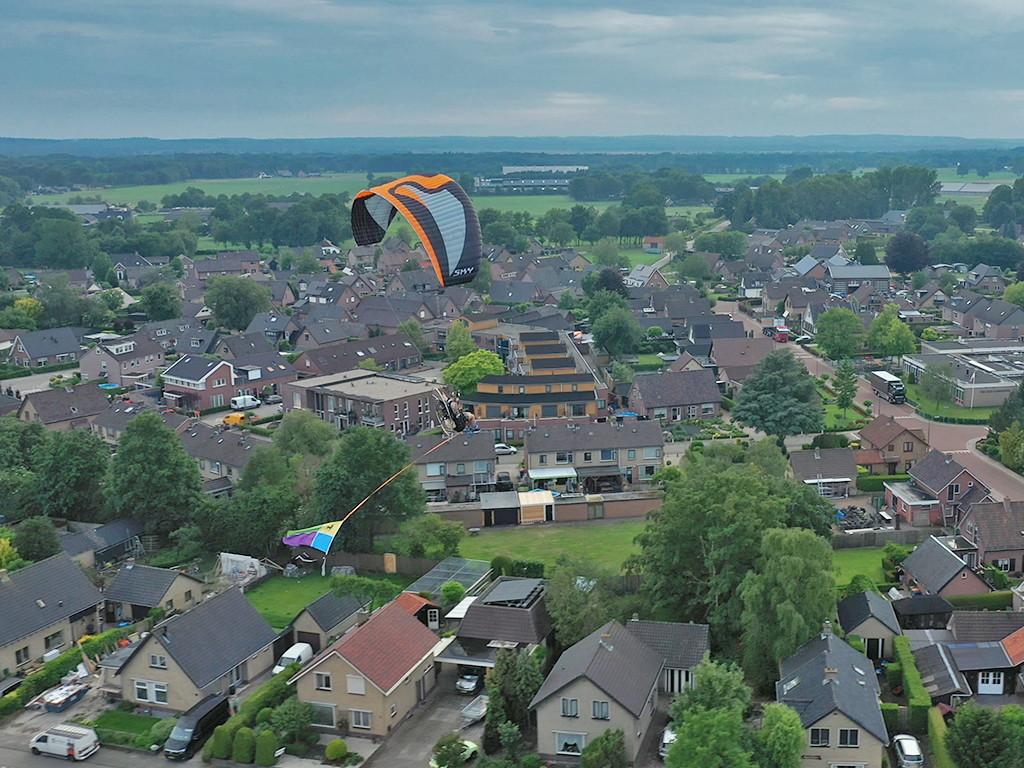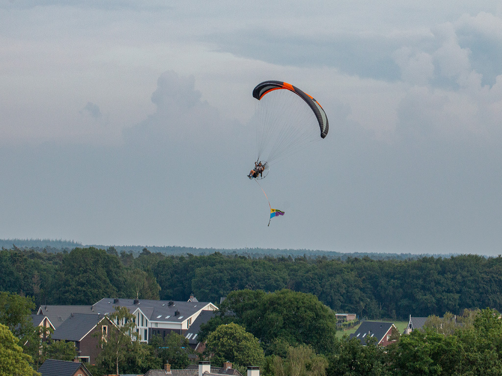 UDDEL – De nieuwe Uddelse vlag is dinsdagavond op spectaculaire wijze onthuld. De vlag werd geruime tijd gesleept door een paramotorvlieger boven het dorp.
