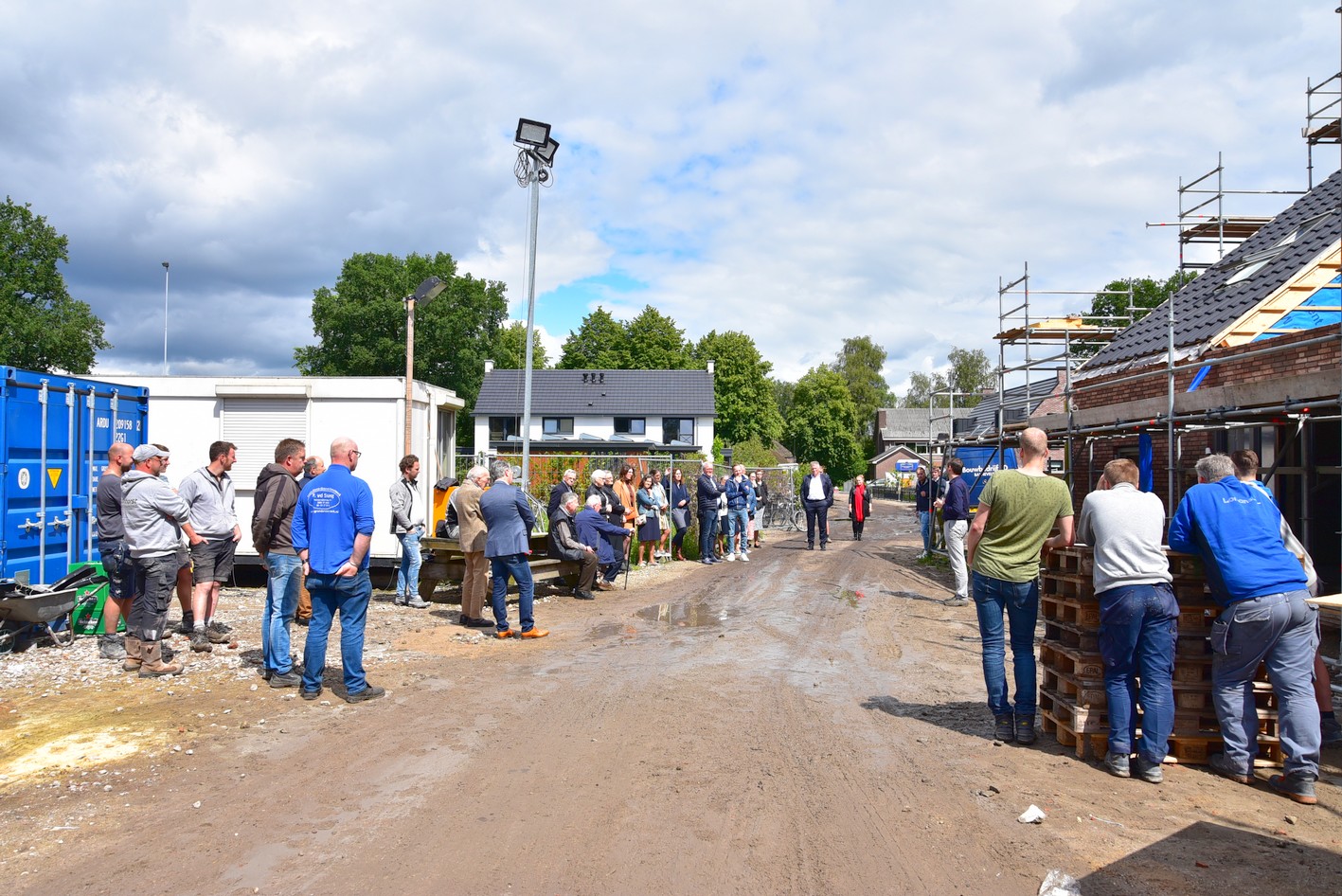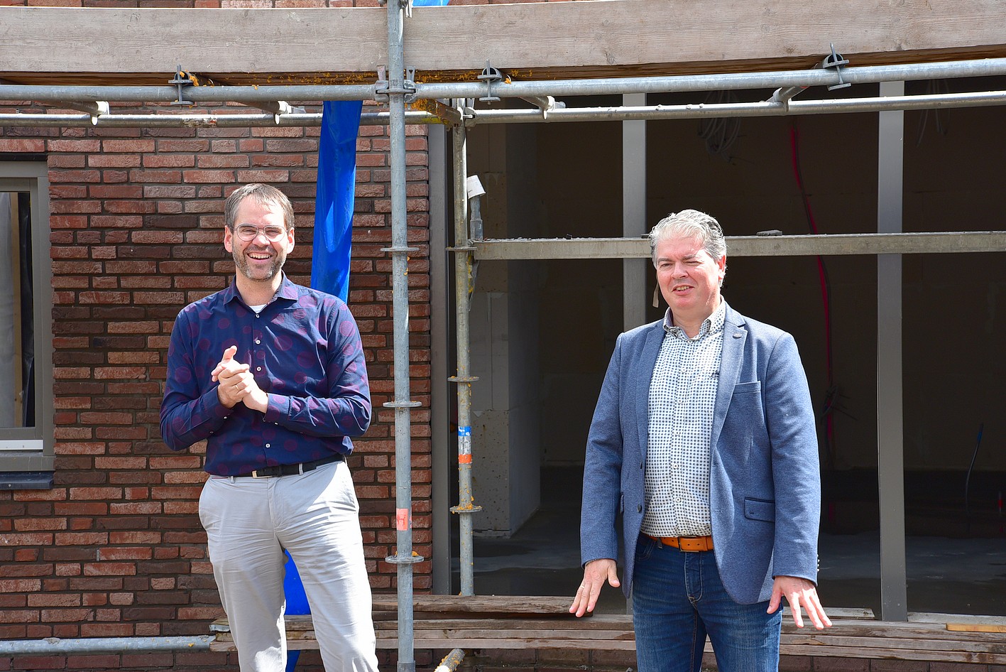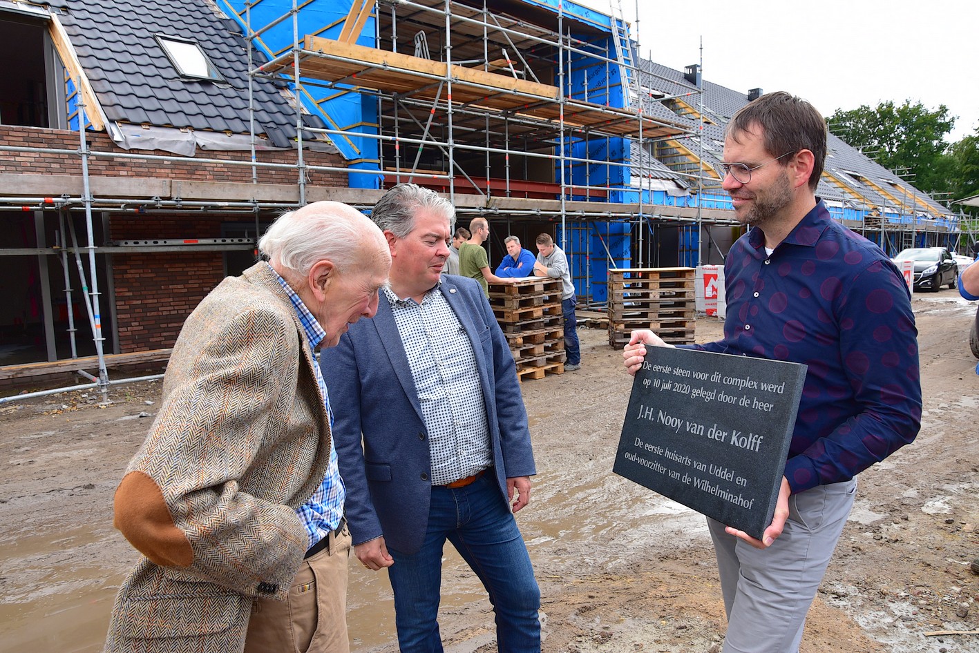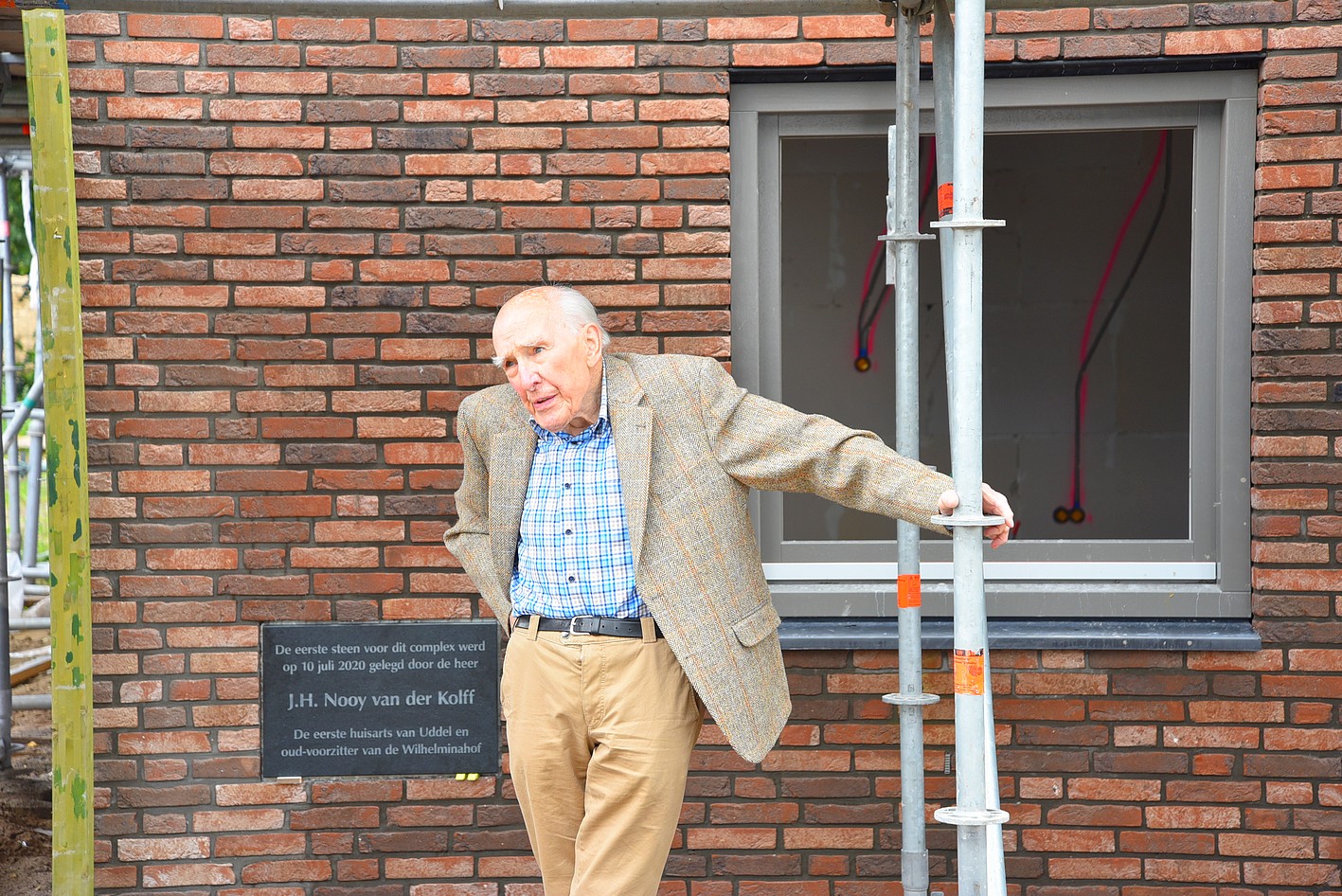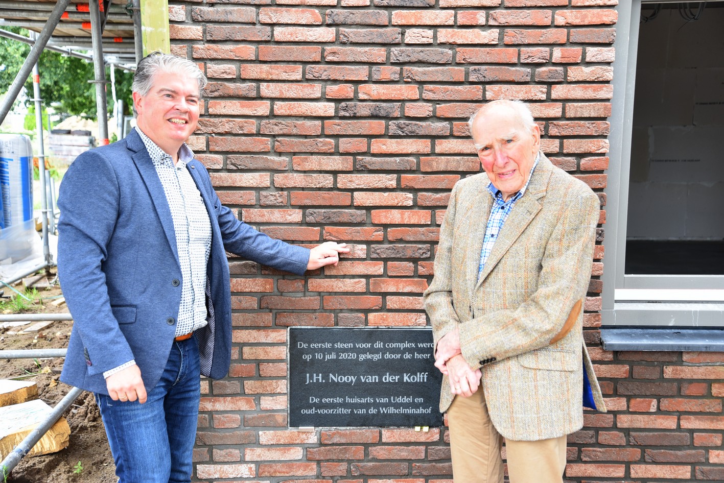 Vrijdag 10 juli was er een bijzonder moment, de eerste steenlegging vond plaats. Die eer viel te beurt aan de bijna 95-jarige J.H. Nooy van der Kolff, oud huisarts te Uddel. Dr. Nooy van der Kolff is ook oud voorzitter van de Stichting Ontmoetingcentrum Koningin Wilhelminahof en heeft in 1998 ook de eerste steen gelegd aan de Essenkamp. Dat hij, 22 jaar later, ook de eerste steen mocht leggen aan de Uttilochweg was een bijzonder moment. Zo’n steen weegt wel iets en hij kreeg dan ook steun van de huidige voorzitter van SKWH, de heer Kees Zwaan. “Een belangrijke pijler voor wie zijn of haar zetel krijgt in dit nieuwe complex is samenhorigheid. Ik wens ieder een gezegende tijd toe in dit prachtige gebouw”, zei dr. Nooy van der Kolff.
