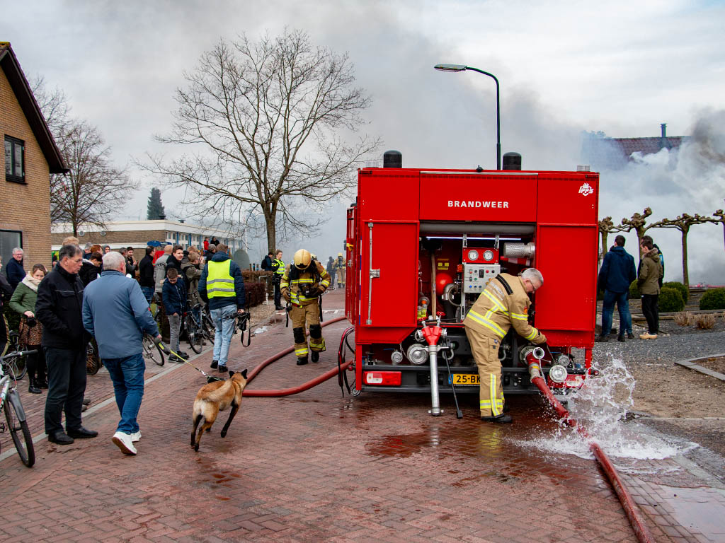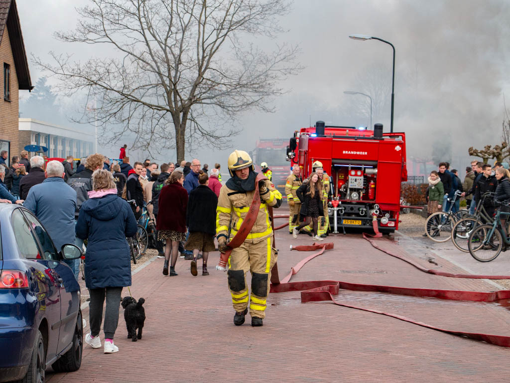 Toen de brandweer ter plaatse kwam sloegen de vlammen al uit het dak. Grote rookwolken trokken door en over het dorp. De brand trok veel bekijks. De schuur is volledig uitgebrand.