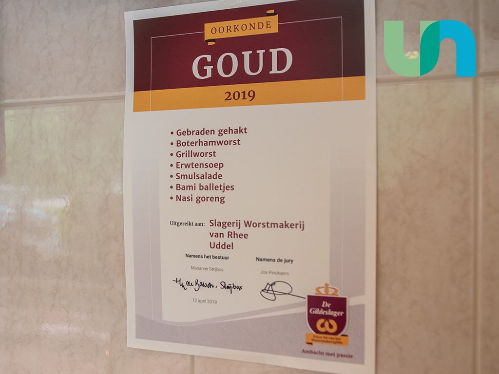UDDEL – Slagerij van Rhee heeft voor maar liefst zeven producten een gouden oorkonde ontvangen van De Gildeslager. Van Rhee behoort daarmee tot de beste twintig Gildeslagerijen van Nederland.