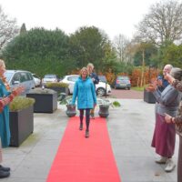 Met de versierde auto bracht Gijs ze naar de Wilhelminahof. Daar lag de rode loper uit en werd Gretha opgewacht door een groot aantal mensen. Ook twee kinderen en een kleinkind waren aanwezig bij deze bijzondere dag.