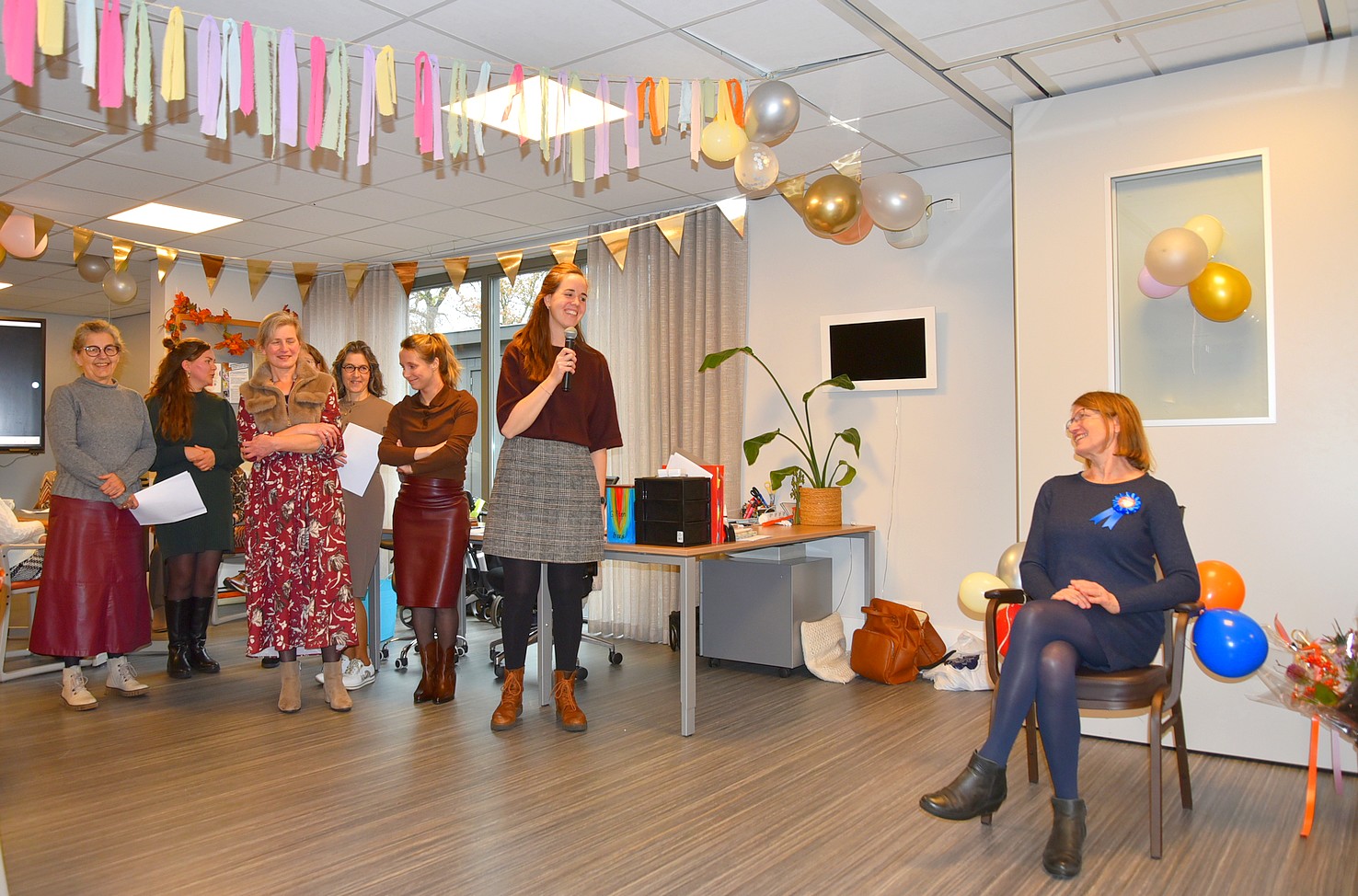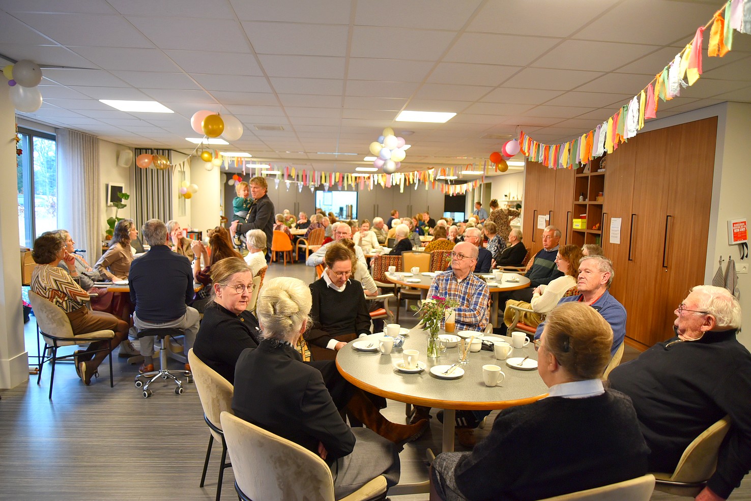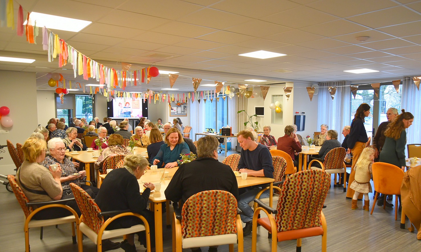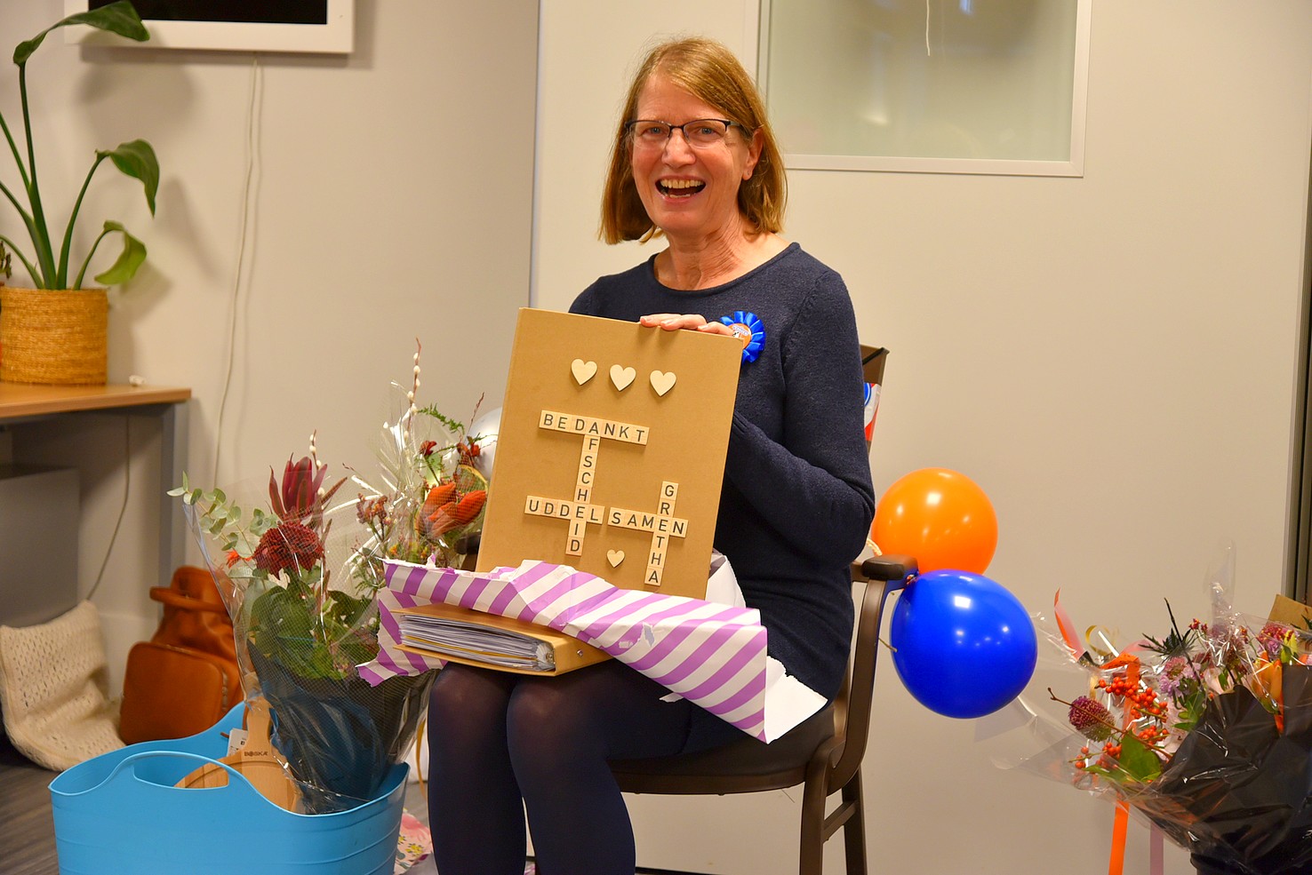 De zaal was versierd met ballonnen en slingers en zat vol met zo’n 70 enthousiaste mensen. Onder het genot van koffie met wat lekkers kon Gretha genieten van hun aanwezigheid en belangstelling.