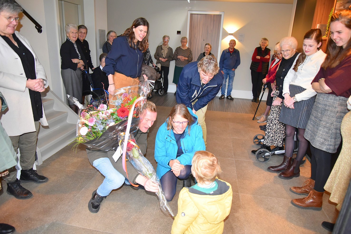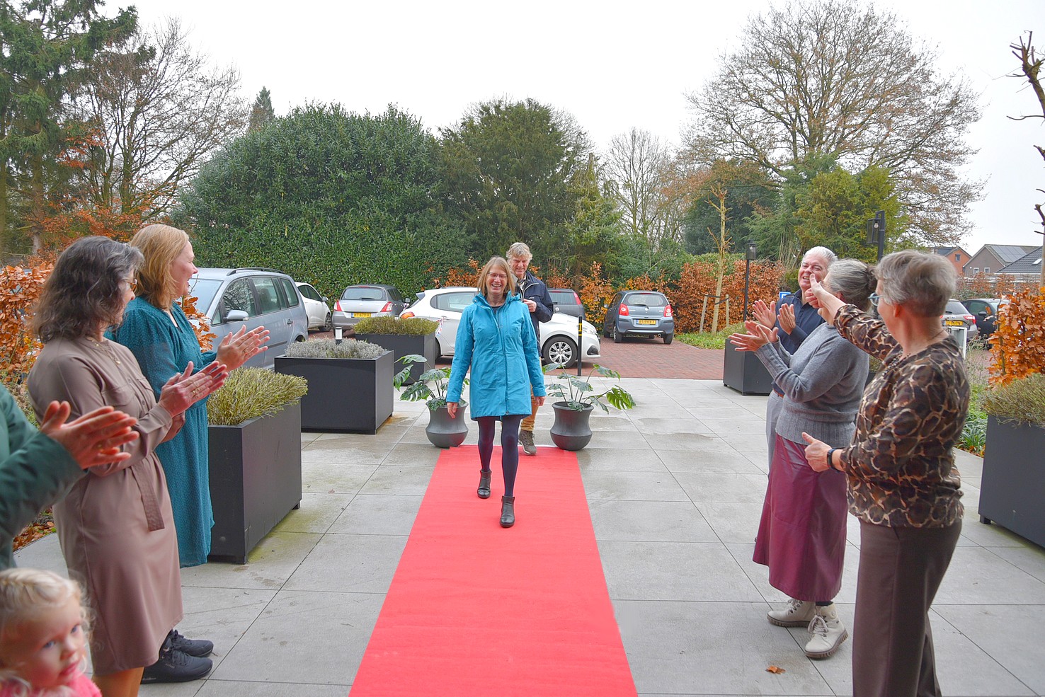 Met de versierde auto bracht Gijs ze naar de Wilhelminahof. Daar lag de rode loper uit en werd Gretha opgewacht door een groot aantal mensen. Ook twee kinderen en een kleinkind waren aanwezig bij deze bijzondere dag.