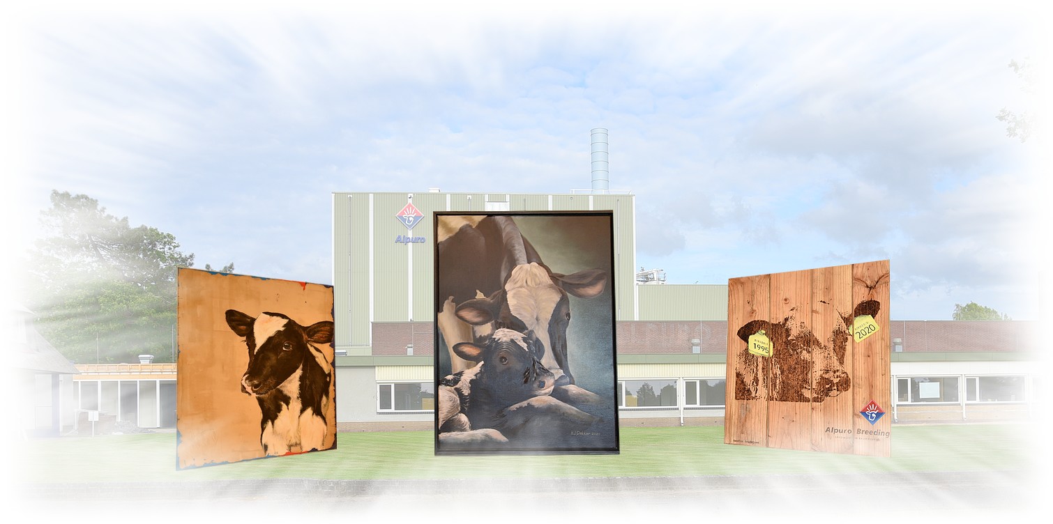 Het derde kunstwerk van Gerry Stoffer, ‘het kalf’ hierin zit vooral de symboliek met de kleuren van het oude logo van Alpuro en de krokusjes in de cement, de cementen vloer die in de stallen zit.