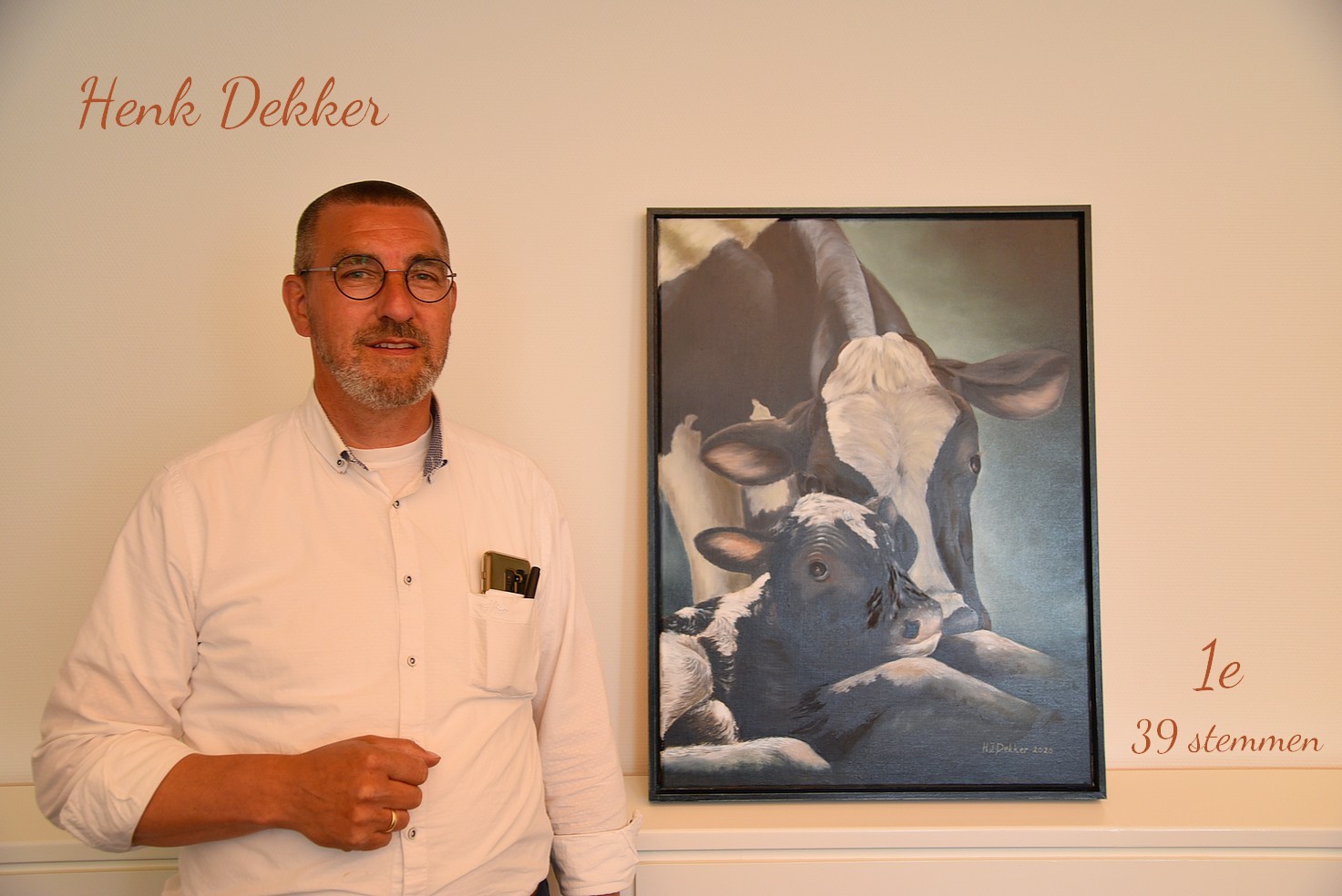 Het kunstwerk ‘moeder met kalf’ van Henk Dekker werd ook heel mooi gevonden een schilderij waar de moederliefde naar het pasgeboren kalf treffend in beeld is gebracht. “Het is een beetje een donker schilderij, geen vrolijke kleuren. Wij zijn een vrolijk bedrijf”, zei de heer Bouwers.