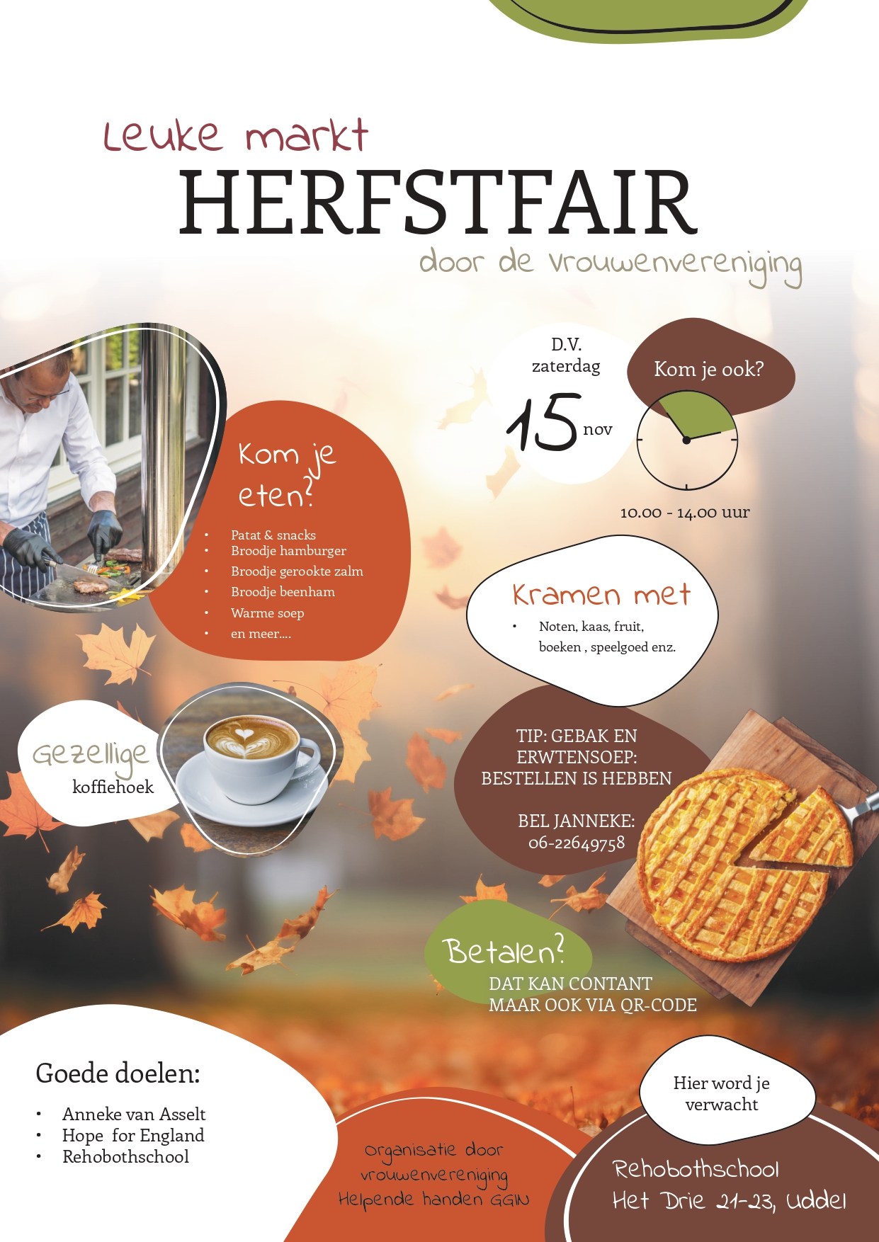 UDDEL – D.V. zaterdag 15 november houdt vrouwenvereniging Helpende Handen een herfstfair voor het goede doel. Van harte welkom bij de Rehobothschool, Het Drie 21-23.
