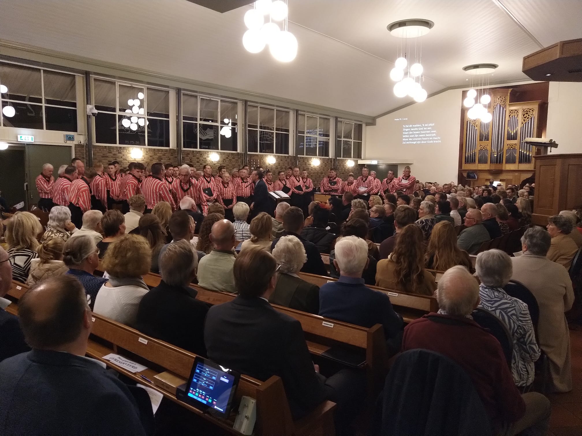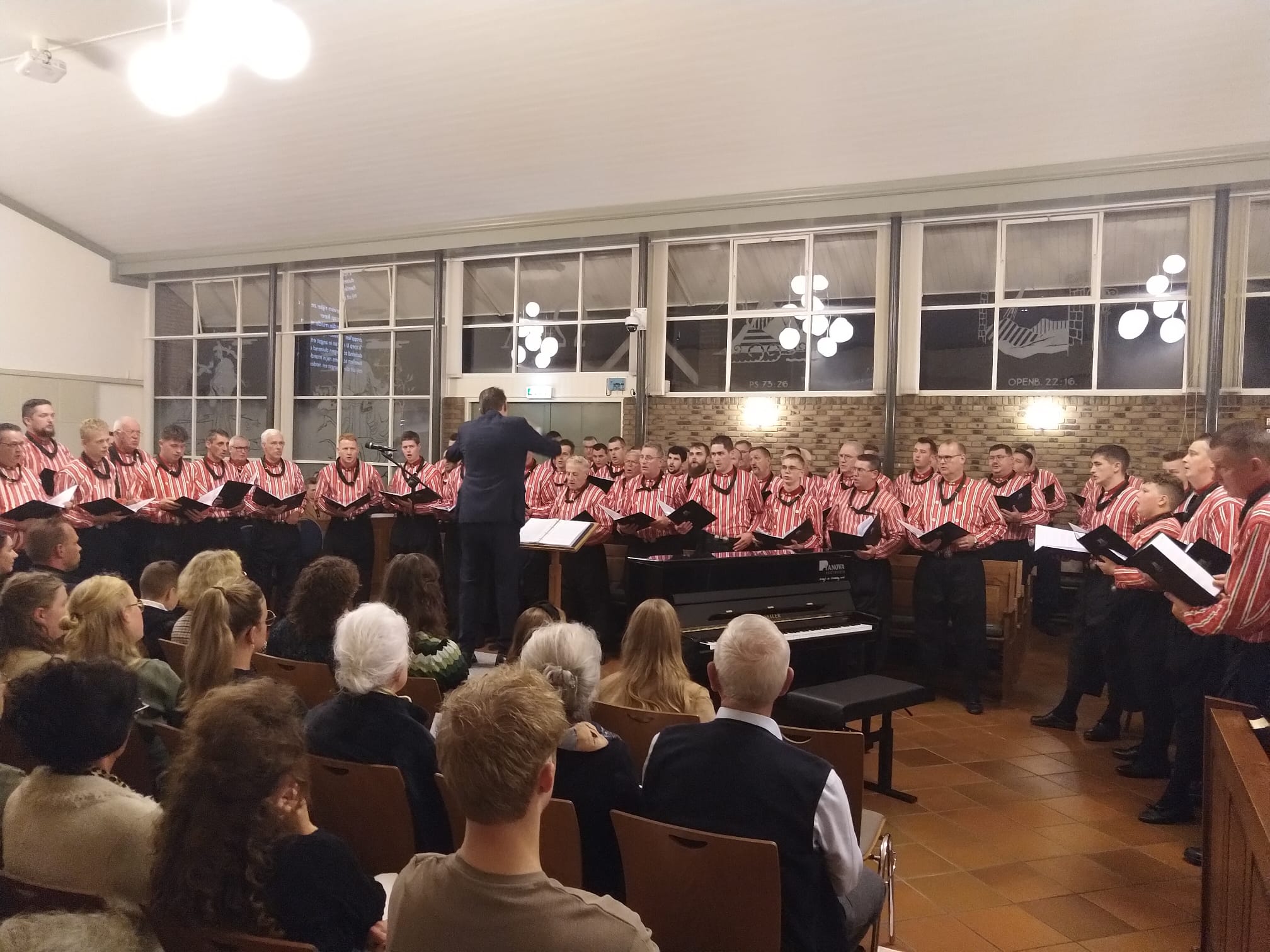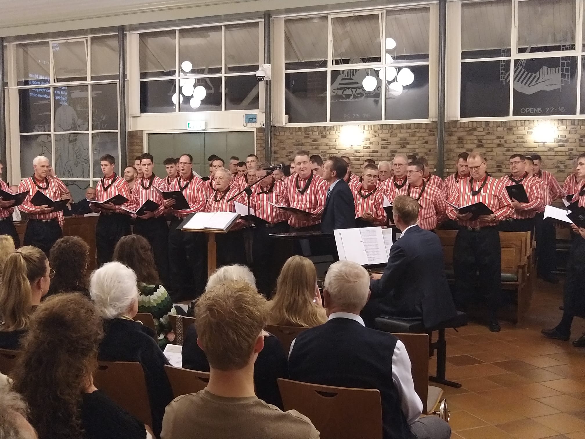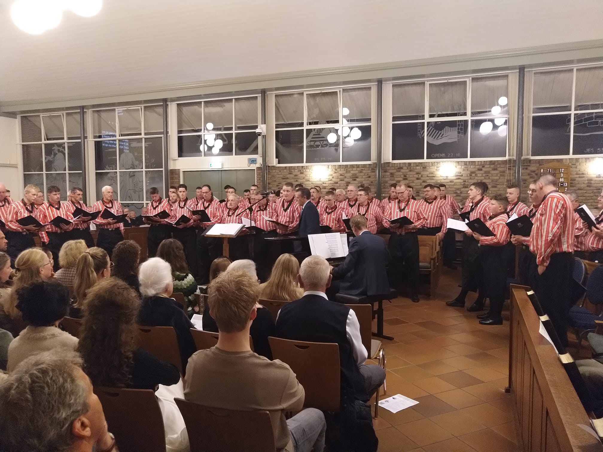 Mannenkoor “Eiland Urk” o.l.v. Gerrit Schinkel met begeleiding op het orgel en piano Hugo van der Meij. Om 18.45 uur stond er al een hele rij mensen voor de deur. Om 19.30 uur zat de kerk dan ook afgeladen vol. Meer dan 600 mensen waren die avond afgekomen om “Eiland Urk” te horen en te zien zingen.
