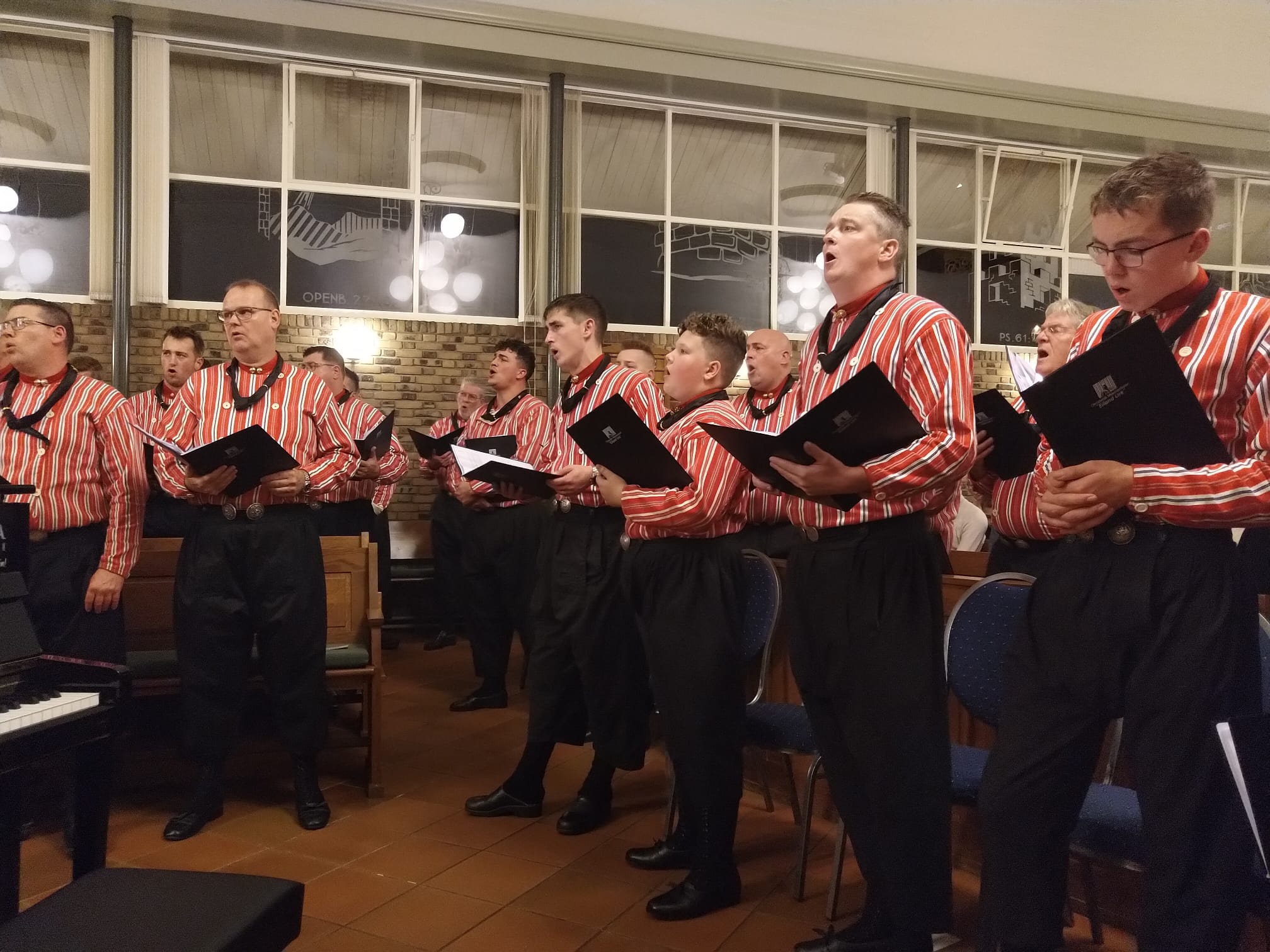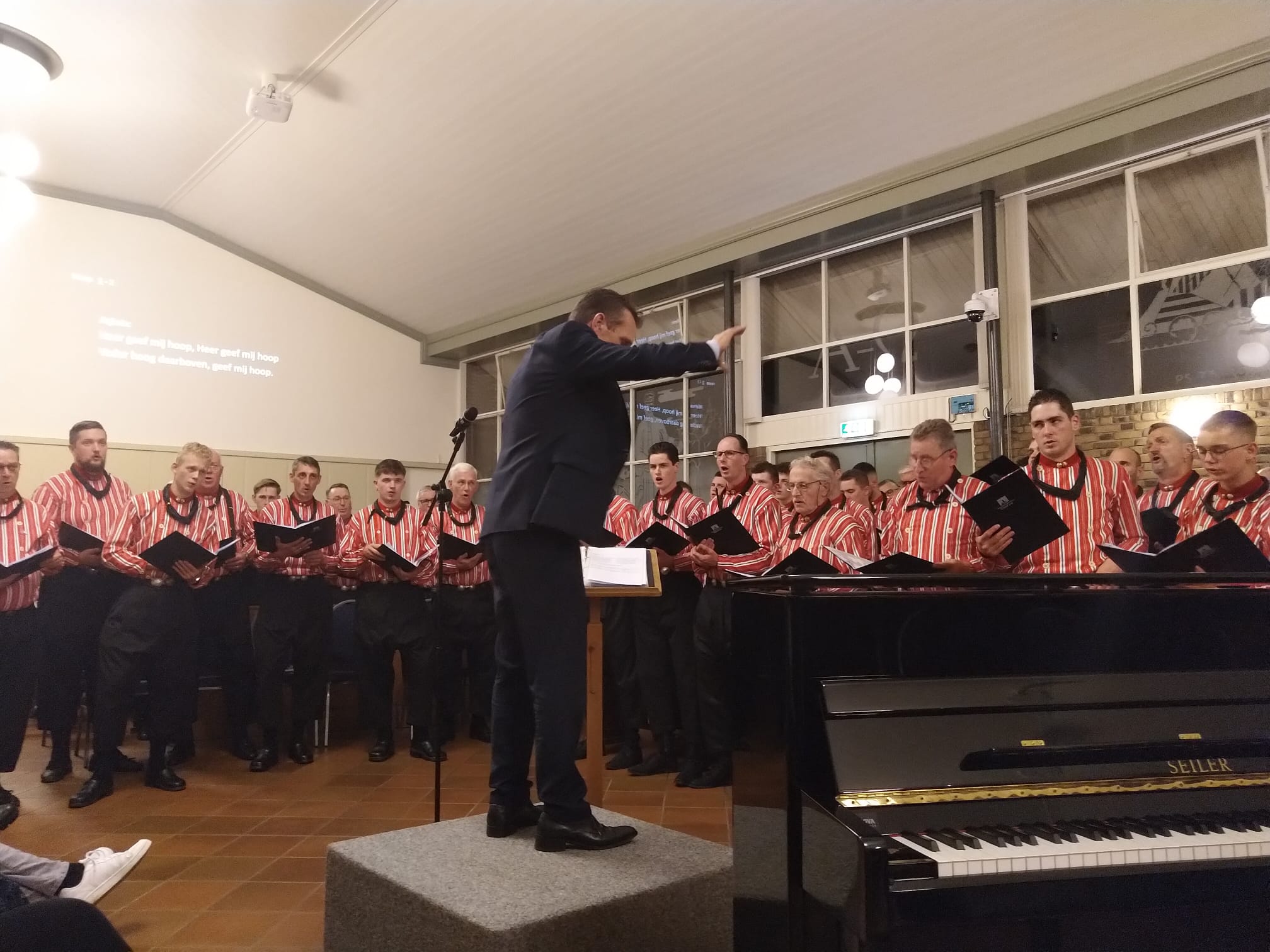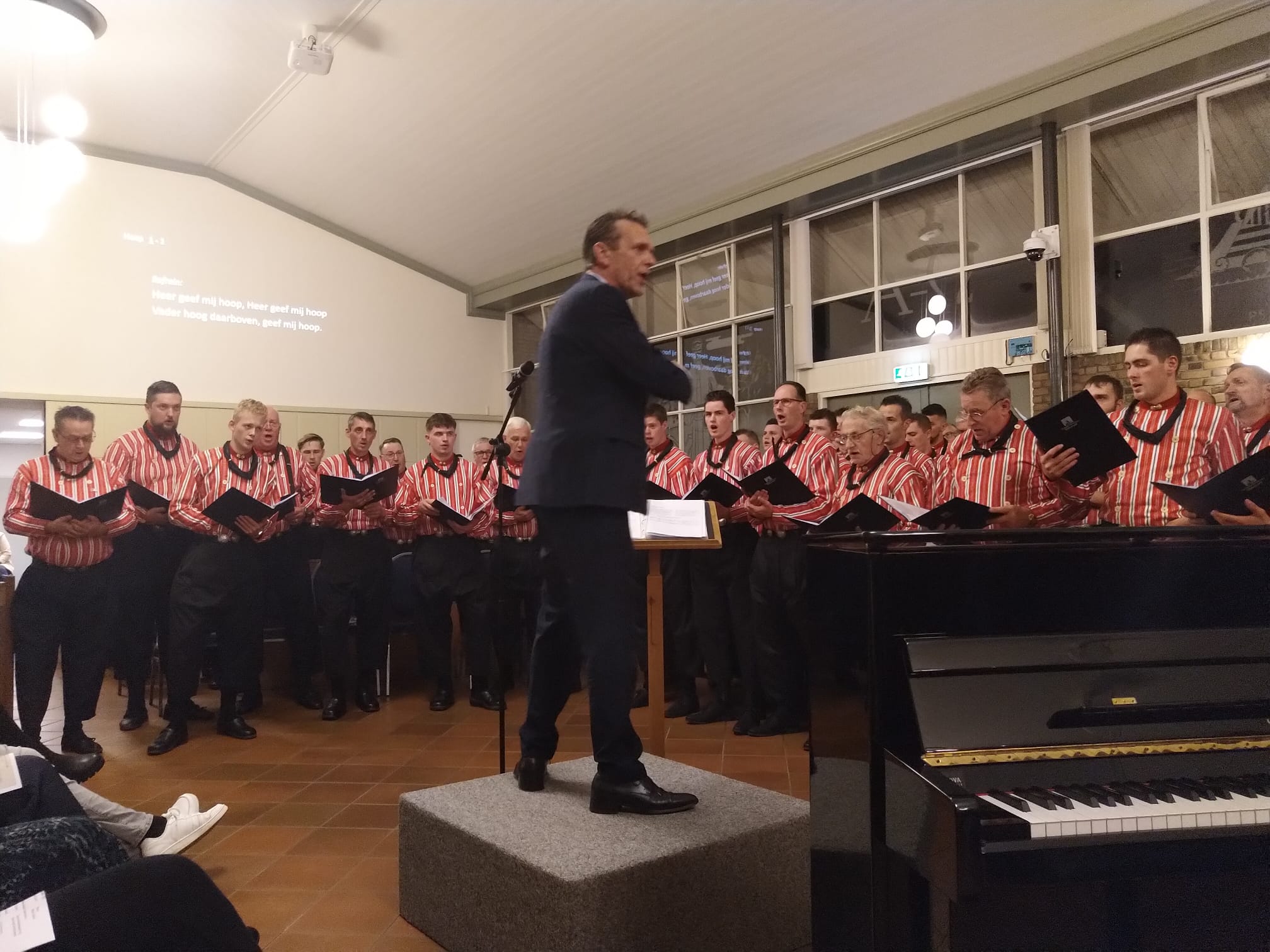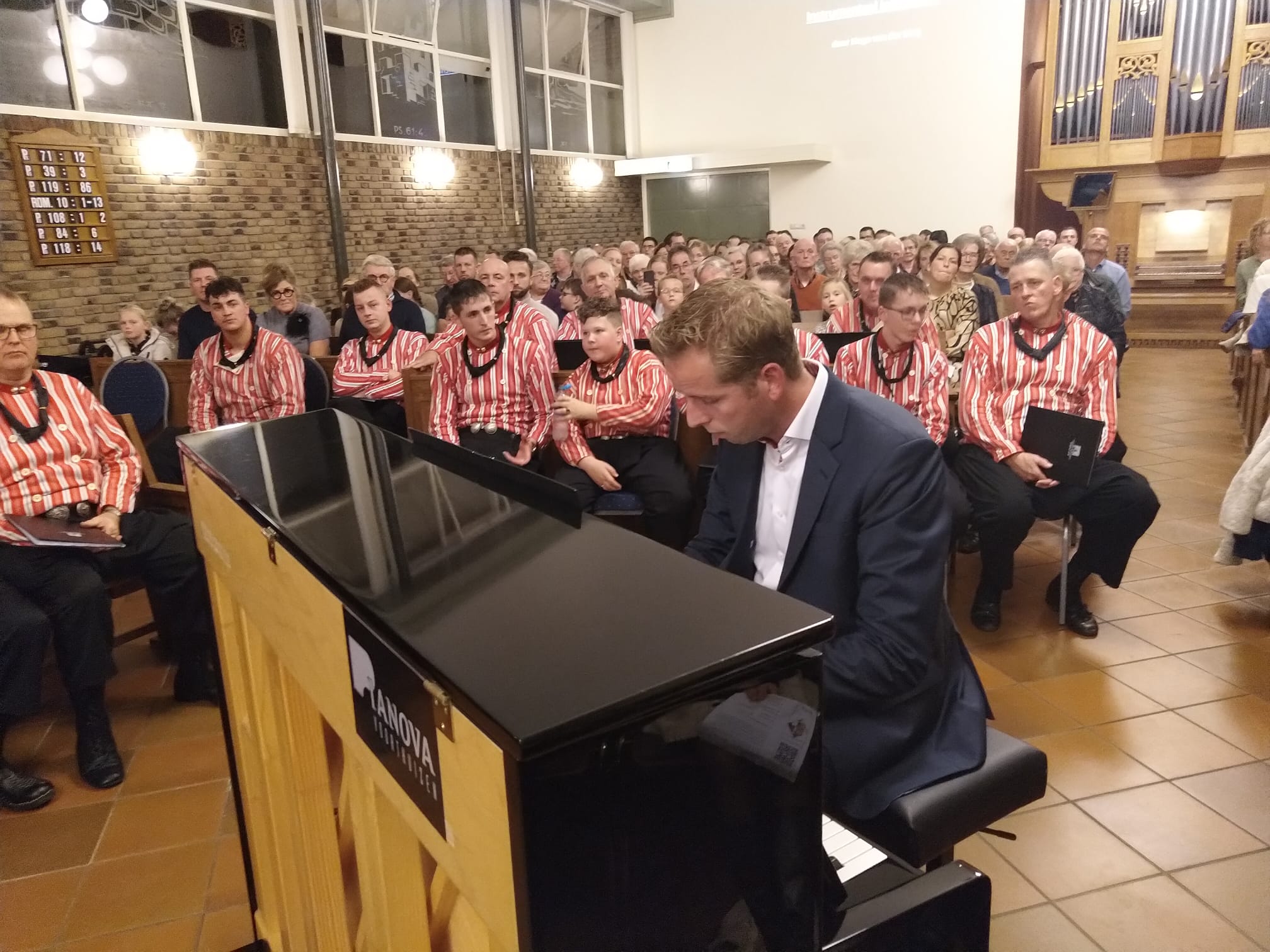Mannenkoor “Eiland Urk” o.l.v. Gerrit Schinkel met begeleiding op het orgel en piano Hugo van der Meij. Om 18.45 uur stond er al een hele rij mensen voor de deur. Om 19.30 uur zat de kerk dan ook afgeladen vol. Meer dan 600 mensen waren die avond afgekomen om “Eiland Urk” te horen en te zien zingen.