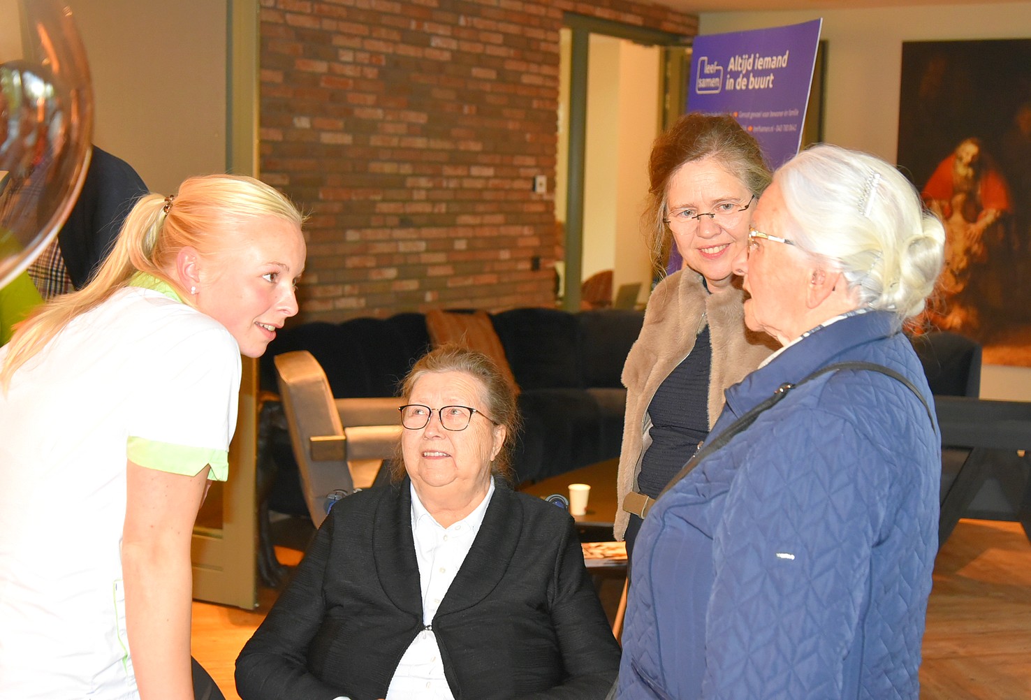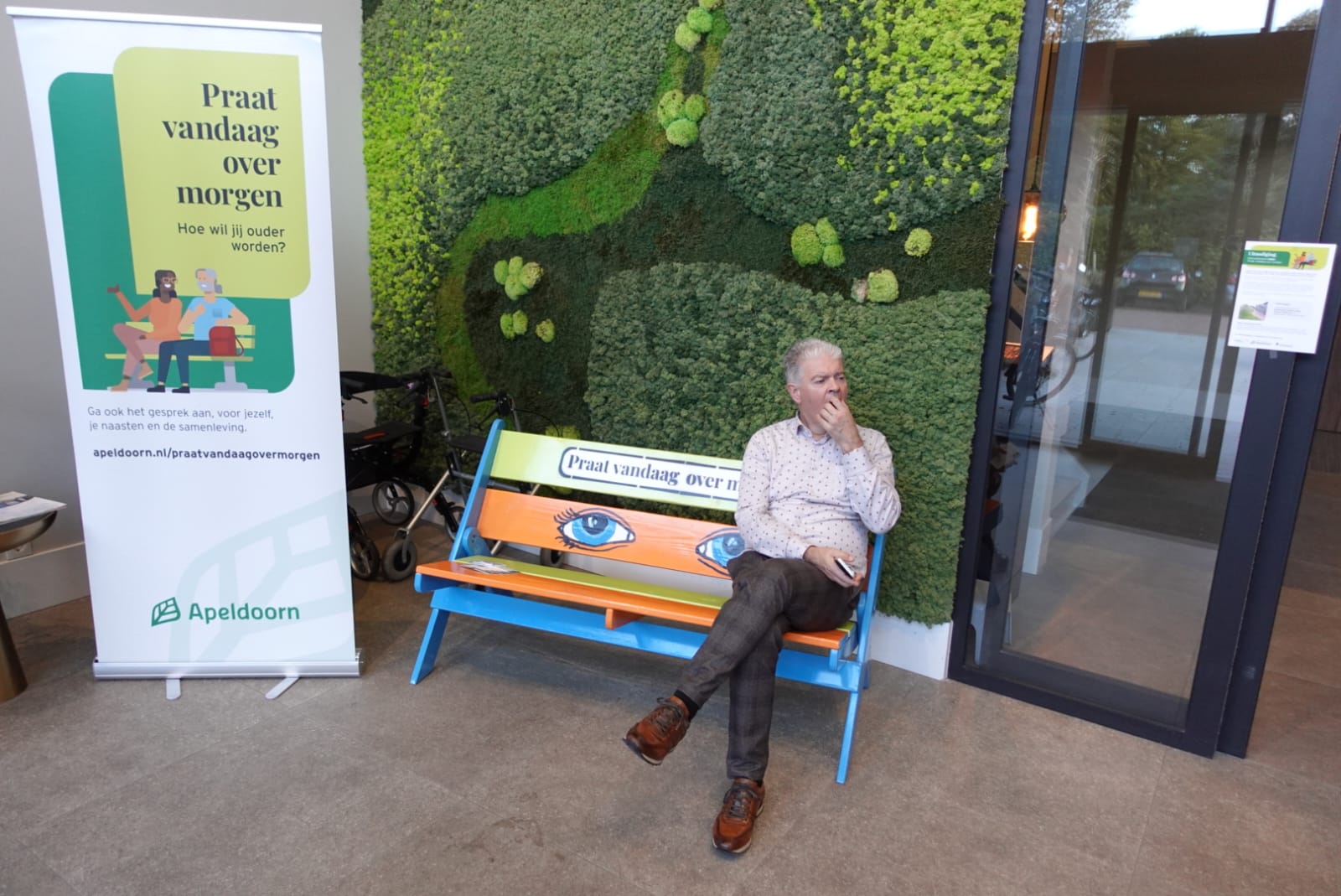 Op één van de foto’s gaat ondergetekende op het bankje “Praat vandaag over morgen” in gesprek met de 15-jarige Marc Bronkhorst (Marc van André van Aart van Gaart van Marten).