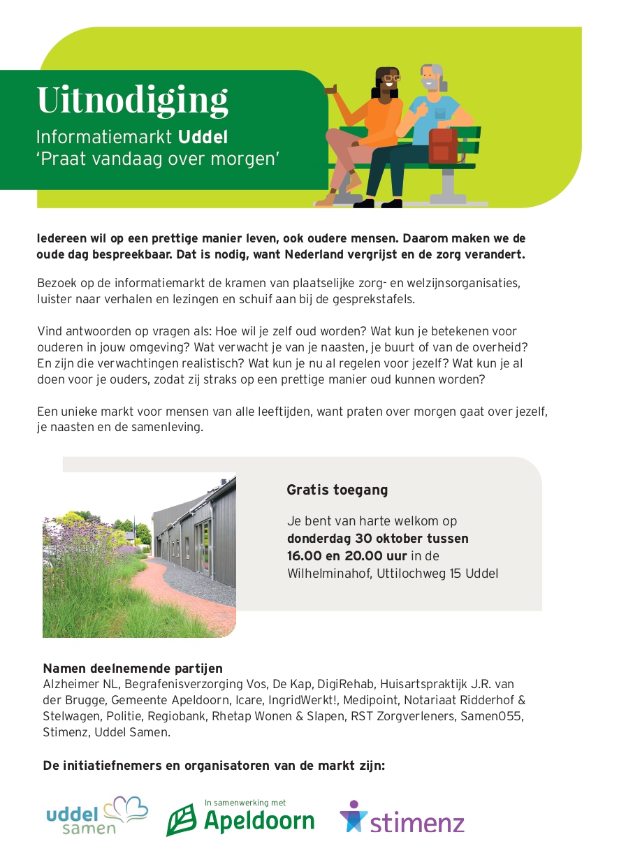 Op donderdag 30 oktober van 16.00 tot 20.00 uur in de Wilhelminahof (Uttilochweg 15 in Uddel) organiseren Uddel Samen, gemeente Apeldoorn en Stimenz een informatiemarkt onder de naam Praat vandaag over morgen.