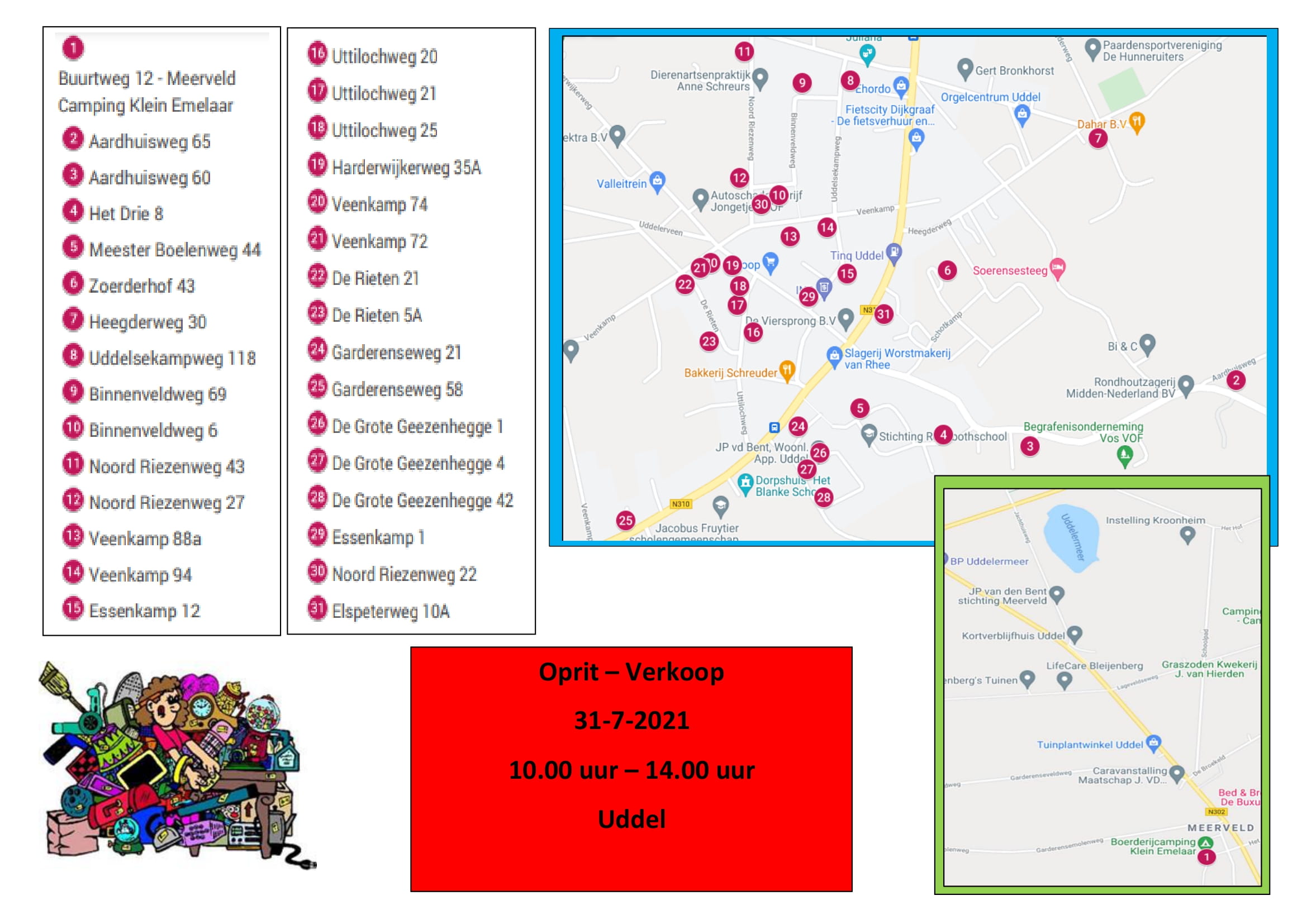 Wij zijn alleen initiatiefnemers, maar dragen geen verantwoordelijkheid. Het gaat hierbij alleen om het verzamelen van adressen van deelnemers en promotie maken. Bekijk voor meer informatie de flyer: Oprit – verkoop Uddel 31-07-2021