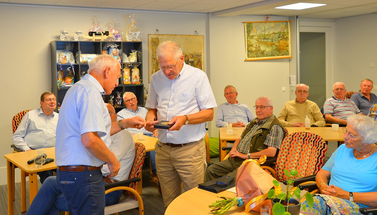 Op maandag 1 juli jl. is Kees Roos, samen met zijn vrouw, in het zonnetje gezet door Dries de Bruin en ook door de voorzitter van Uddel Samen, Kees Zwaan. Hij werd bedankt voor al het werk en de uren die hij heeft gestoken in de manneninloop. Ze gingen niet met lege handen naar huis.