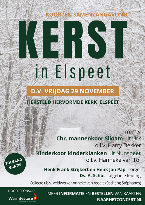ELSPEET – D.V. vrijdag 29 november vindt er een koor- en samenzangavond plaats in Elspeet. Aan deze avond werken mee het Chr. Mannenkoor Siloam uit Urk en het kinderkoor Kinderklanken uit Nunspeet. Het mannenkoor en het kinderkoor zullen ook gezamenlijk optreden. Er is veel ruimte voor samenzang, deze wordt begeleid door Henk Frank Strijkert. Ds. A. Schot uit Nunspeet heeft de algehele leiding.