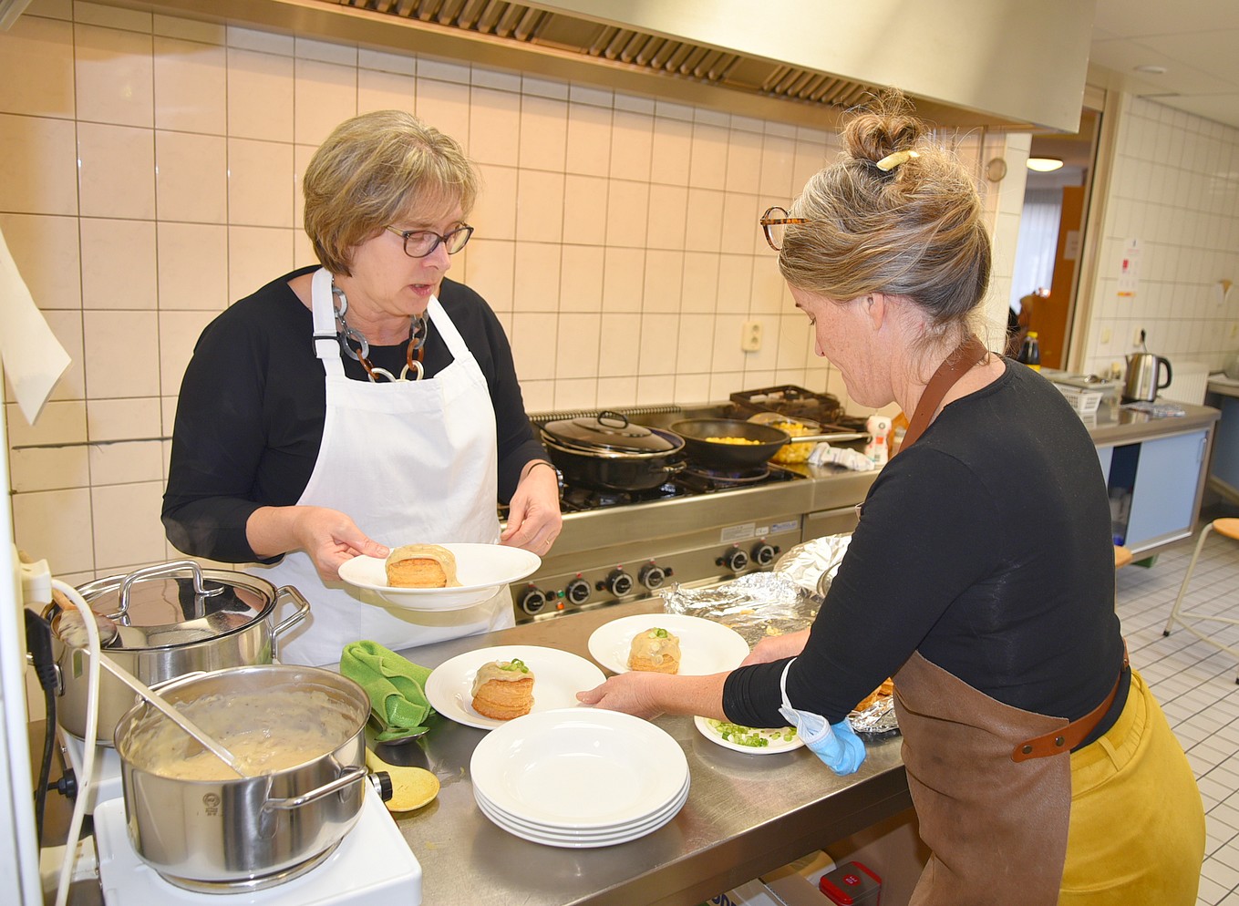 Met in acht neming van de coronaregels werd er drie dagen gebraden en gekookt voor een kleinere groep in de Wilhelminahof aan de Essenkamp. De stemming was al die dagen opperbest en wat wil je ook, er wordt voor je gekookt door een stel fantastische kooksters, die het met veel liefde doen, en dat proefde men in het eten.