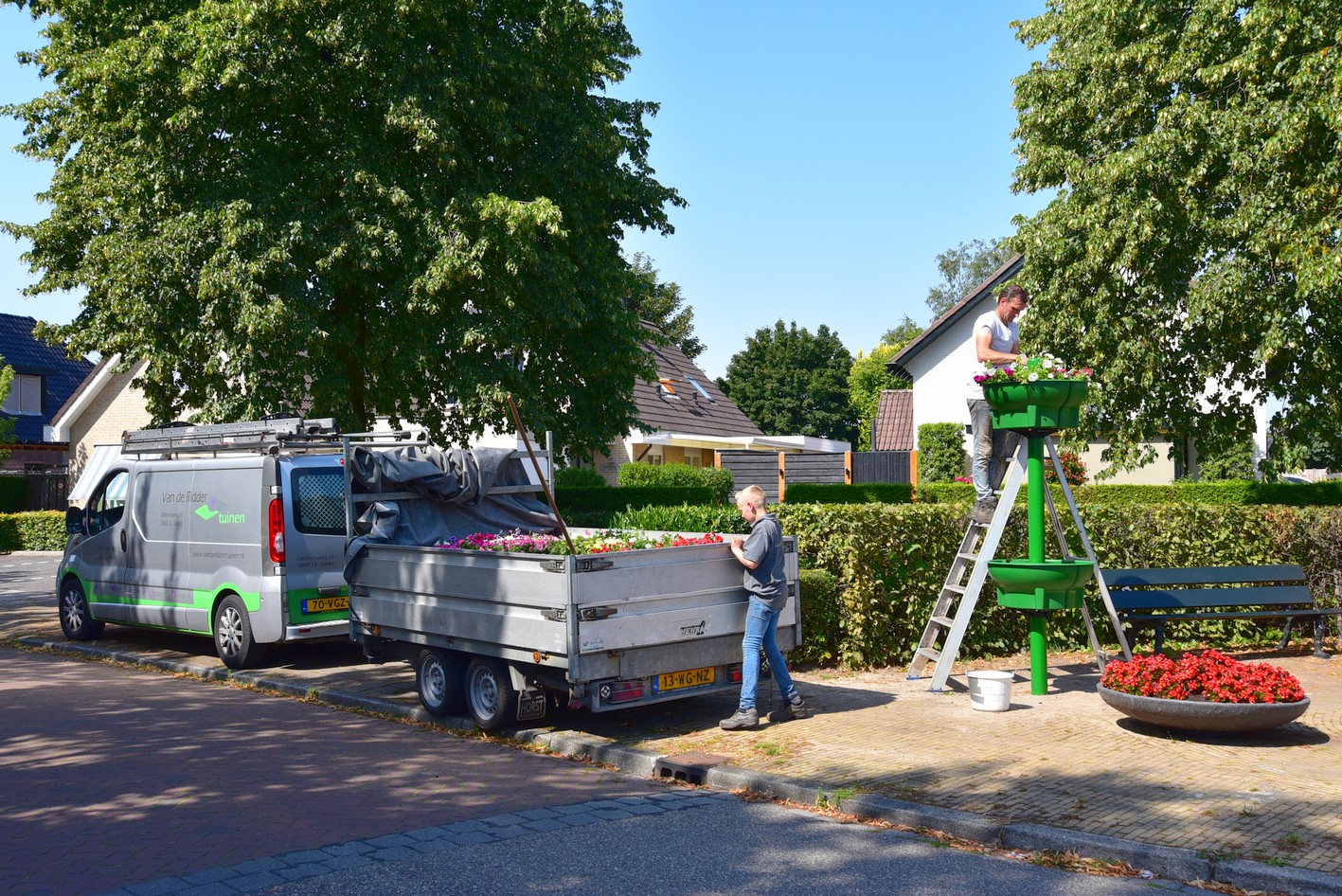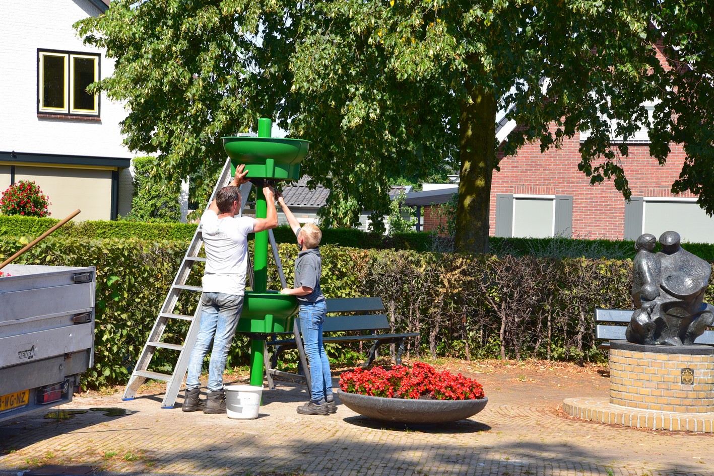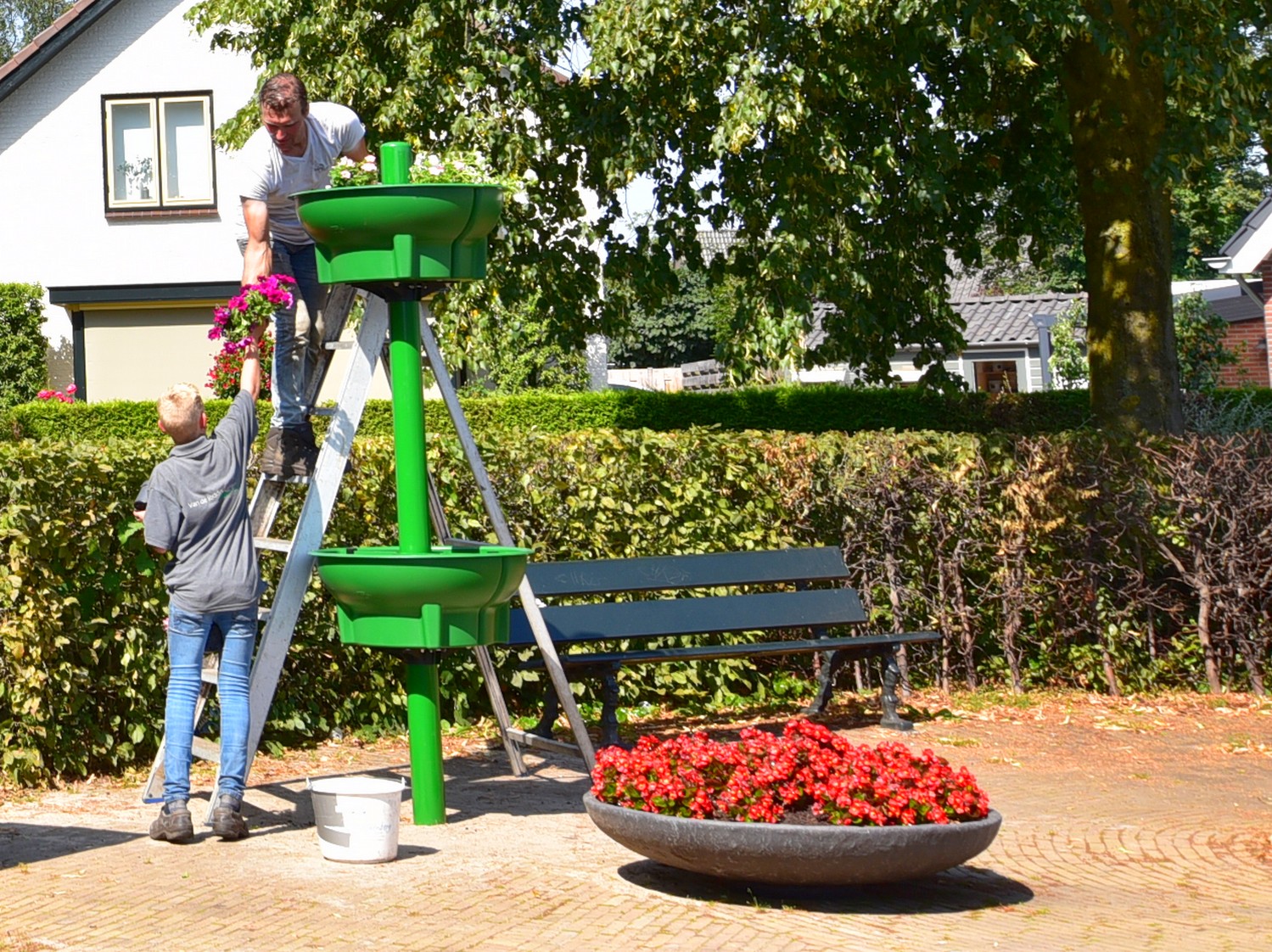 UDDEL – Zoals enige weken terug al geschreven, bij de plaatsing van de eerste bloemenschalen, heeft Uddels Belang met gemeente Apeldoorn een project Kleur in de Dorpen. Als vervolg hierop zijn deze week een vijftal zuilen geplaatst met bloemenschalen eraan.