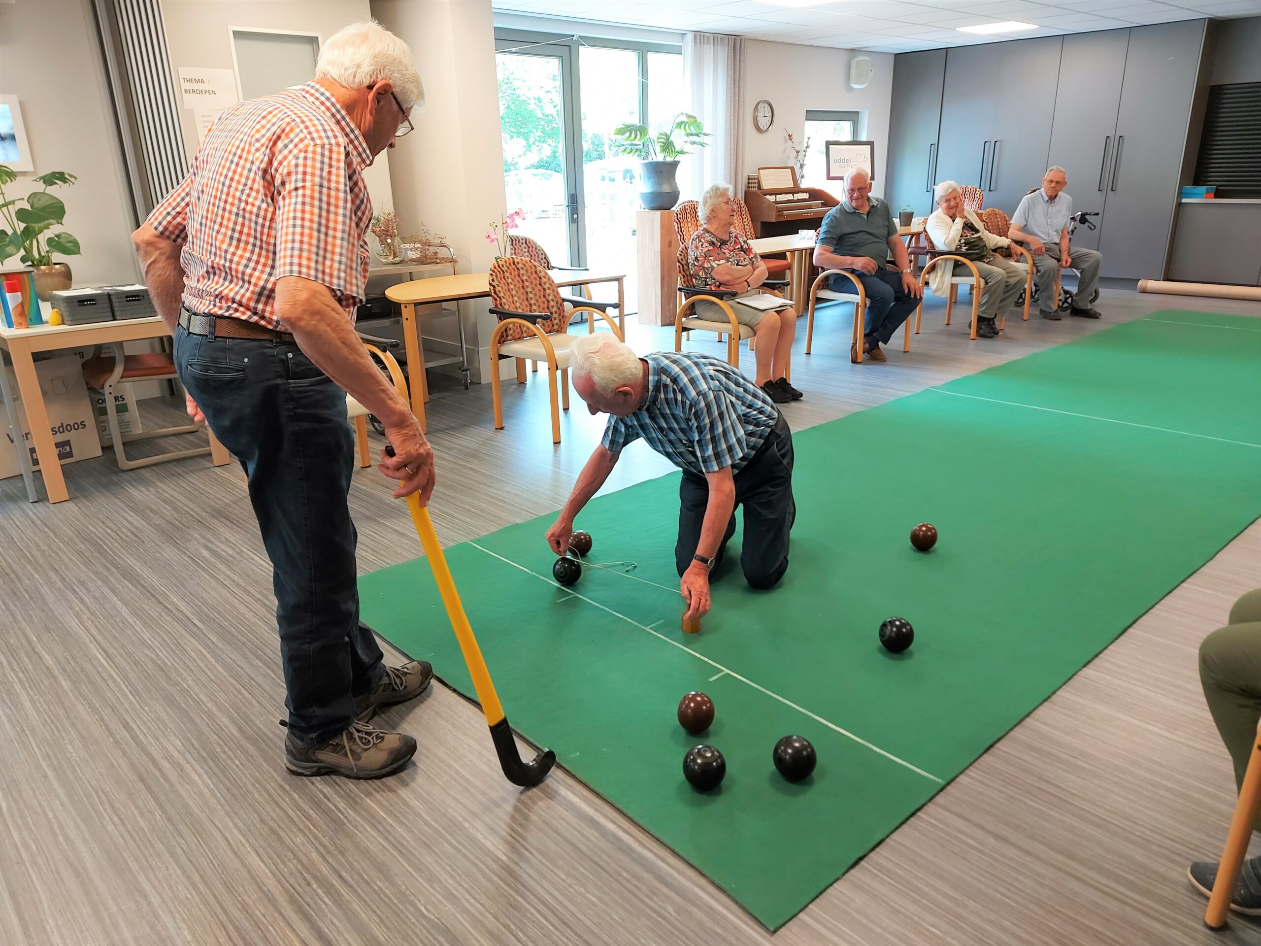 De Koersbalclub ‘Voor ons Plezier’ organiseert elke week (behalve in juli en augustus) in de Wilhelminahof, op maandagmiddag koersballen voor ouderen uit Uddel en directe omgeving. Van 14.00 tot 16.00 uur, met tussendoor een pauze, wordt dit spel enthousiast gespeeld. Het is een gezond spel, je moet van de stoel af om de ballen te laten rollen. Niet alleen de been- en armspieren komen aan bod, ook de lachspieren worden vaak en veel gebruikt. Deelname is gratis, koffie en thee kosten slechts 50 cent per kopje. Vanaf maandag 12 september a.s. gaan de ballen weer over de mat rollen.