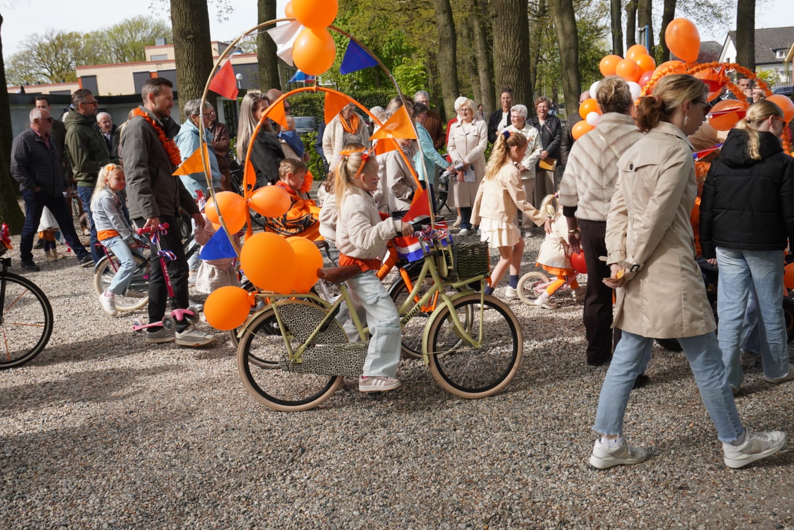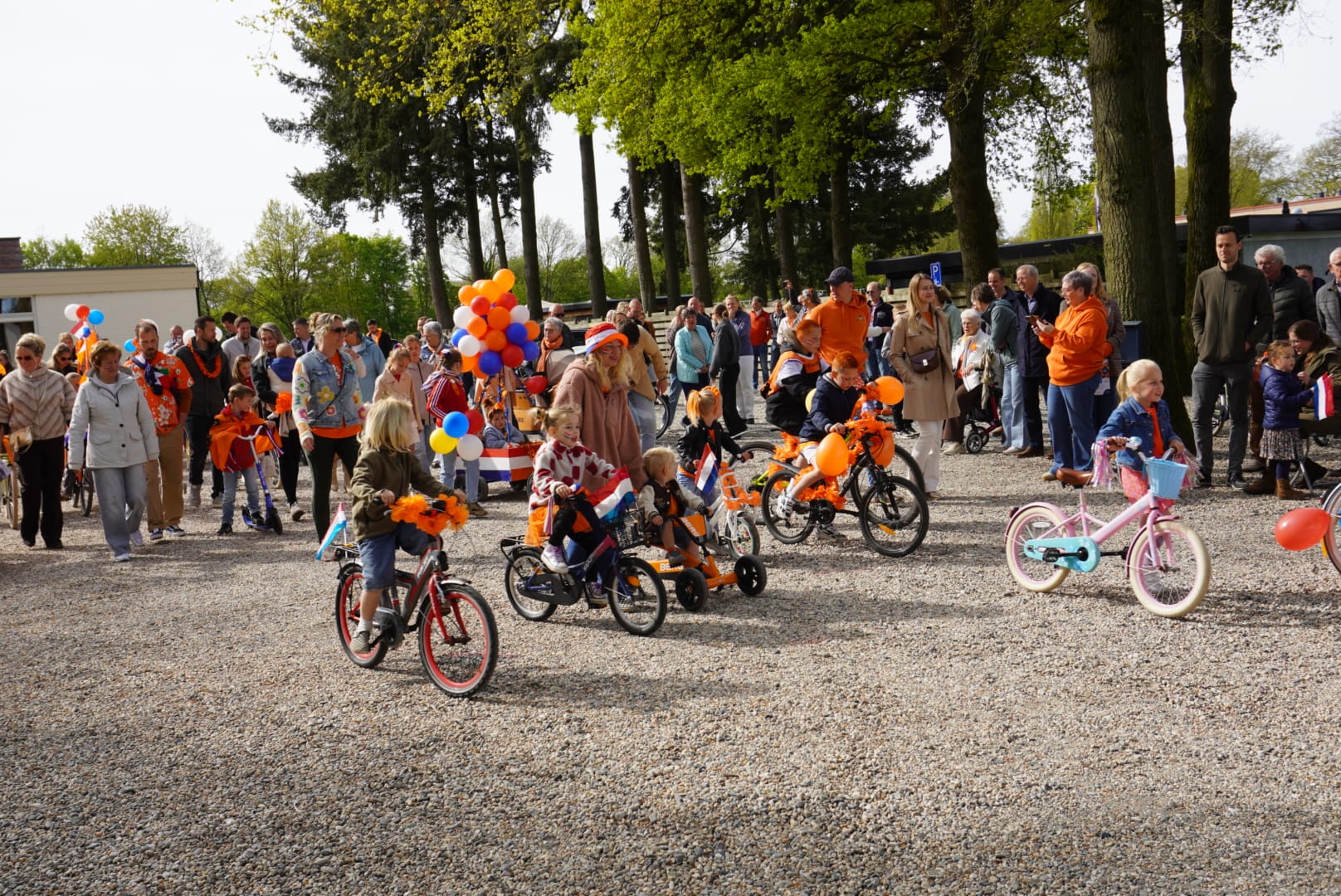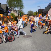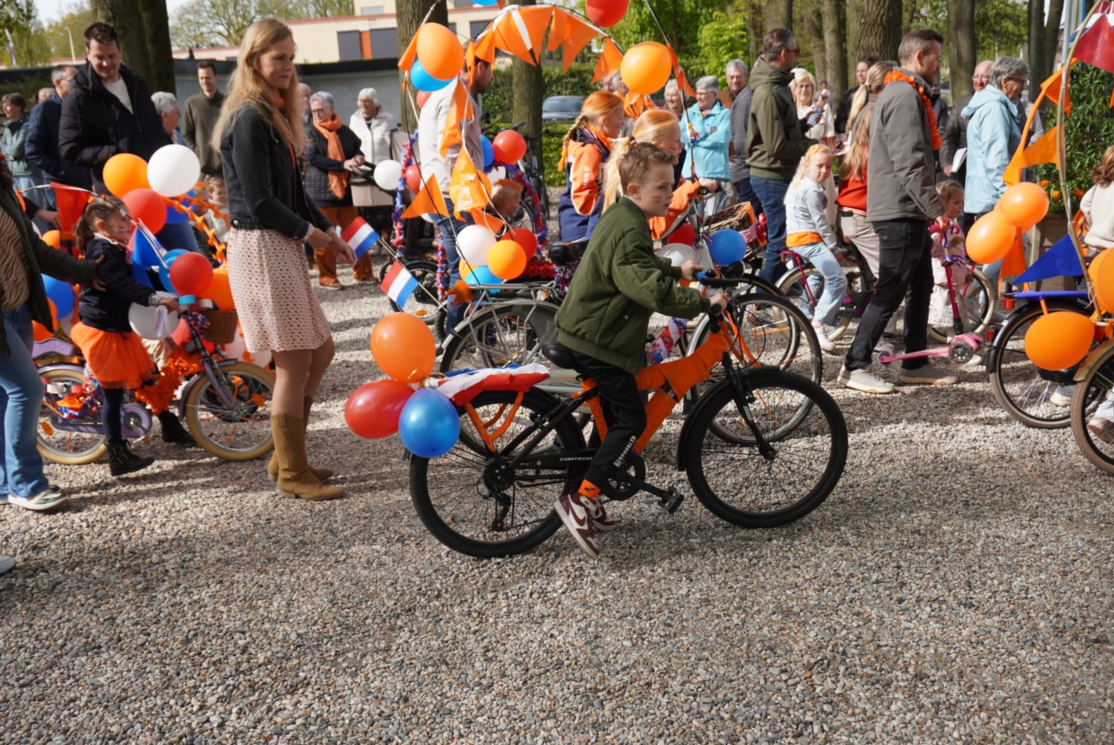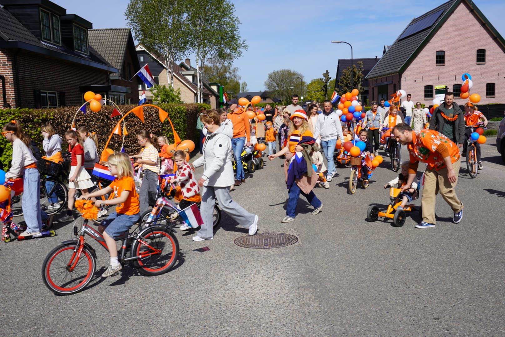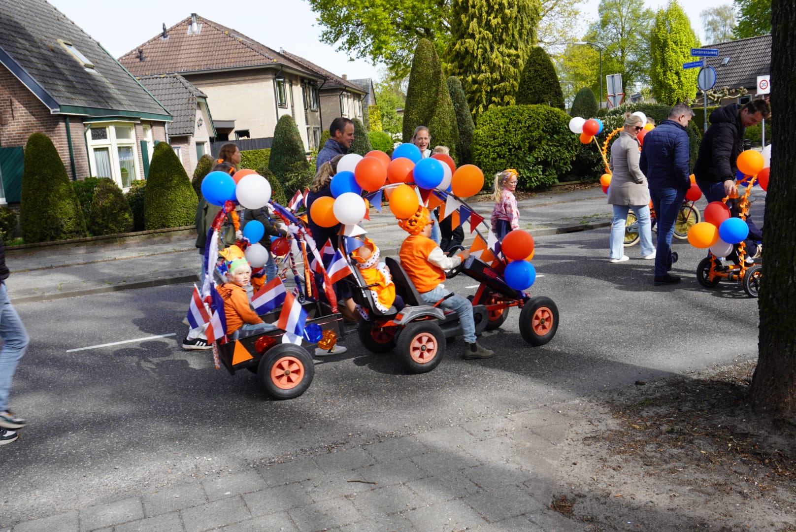 Na de aubade was er de optocht door het dorp met versierde fietsen en skelters voor en door de kinderen, ook onder de vrolijke klanken van Juliana uit Uddel met de gloednieuwe uniformen.