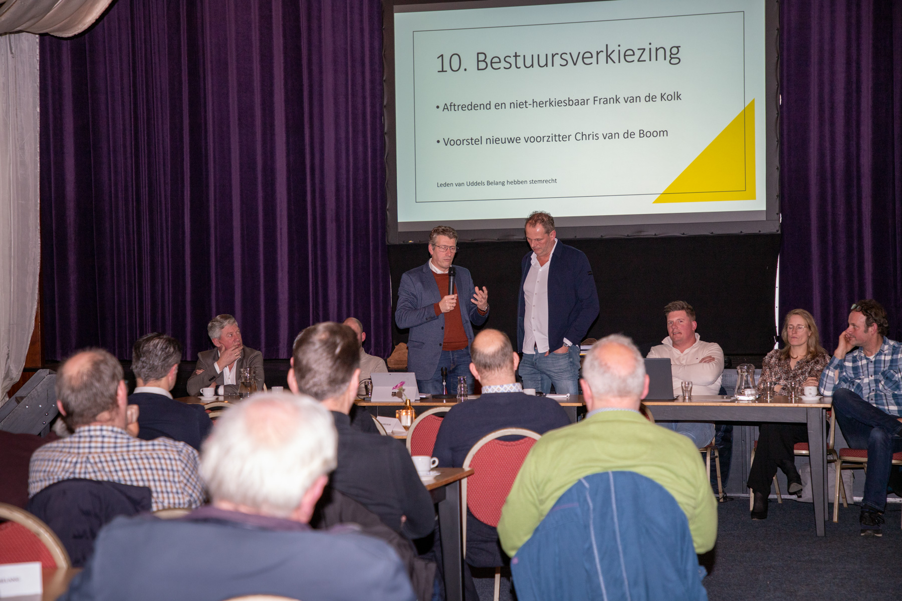 De ledenvergadering werd vervolgd met een bestuursverkiezing. Henri Kok is herkozen als bestuurslid. Peter Kok neemt afscheid en Henk Bronkhorst werd gekozen als nieuw bestuurslid. Ook moest er een nieuwe voorzitter gekozen worden, omdat Frank van de Kolk afscheid neemt. Chris van de Boom werd unaniem gekozen als nieuwe voorzitter. Tijdens de rondvraag mocht hij dan ook gelijk zijn nieuwe taak op zich nemen en ingaan op de vragen.