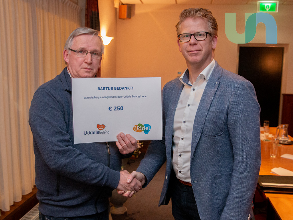 Tegen het eind van de vergadering wordt Bartus Vos nog even in het zonnetje gezet. Hij wordt bedankt voor zijn jarenlange en enorme inzet voor de welbekende website Uddel.info. Daarnaast zijn er nog enkele wisselingen in het bestuur van Uddels Belang. Gerard Schouten neemt na ruim 25 jaar bestuurswerk afscheid van Uddels Belang. Ook Herman van Rhee neemt afscheid als bestuurslid. Chris van de Boom en Reinard Schouten zijn beiden gekozen als bestuursleden.