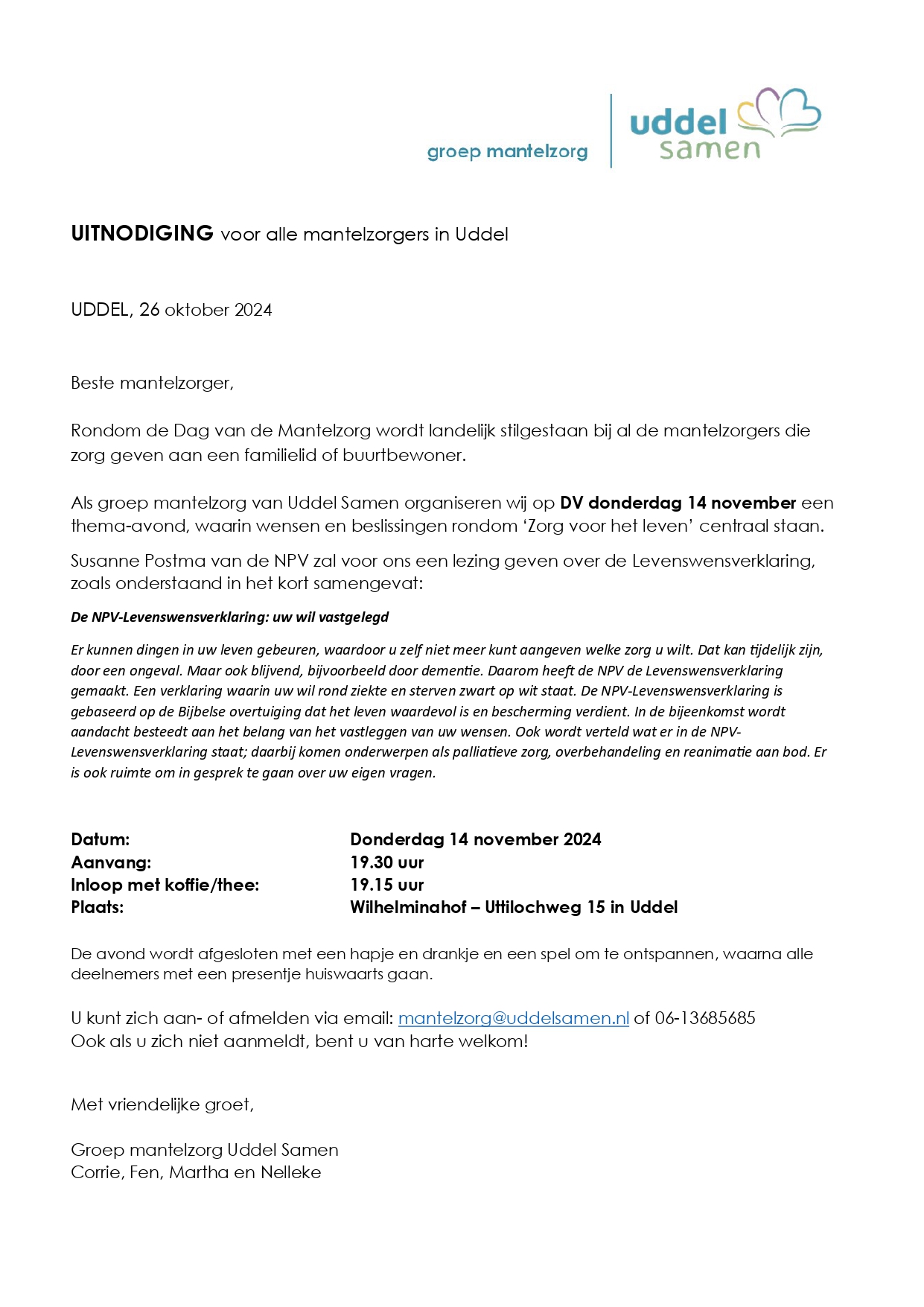 De avond is bedoeld voor mantelzorgers, ouders, familieleden en iedereen die zicht bij dit onderwerp betrokken voelt. Aanmelden kan via mantelzorg@uddelsamen.nl of 06-13685685