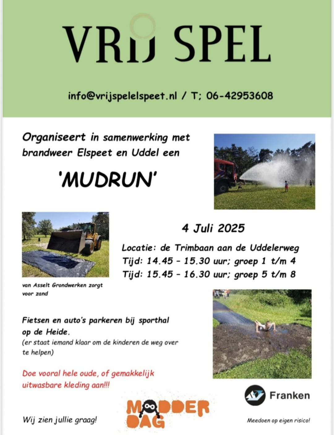 ELSPEET – Vrij Spel organiseert in samenwerking met Brandweer Elspeet en Brandweer Uddel weer een MUDRUN. Lees alle informatie op de flyer. Modder jij ook mee?
