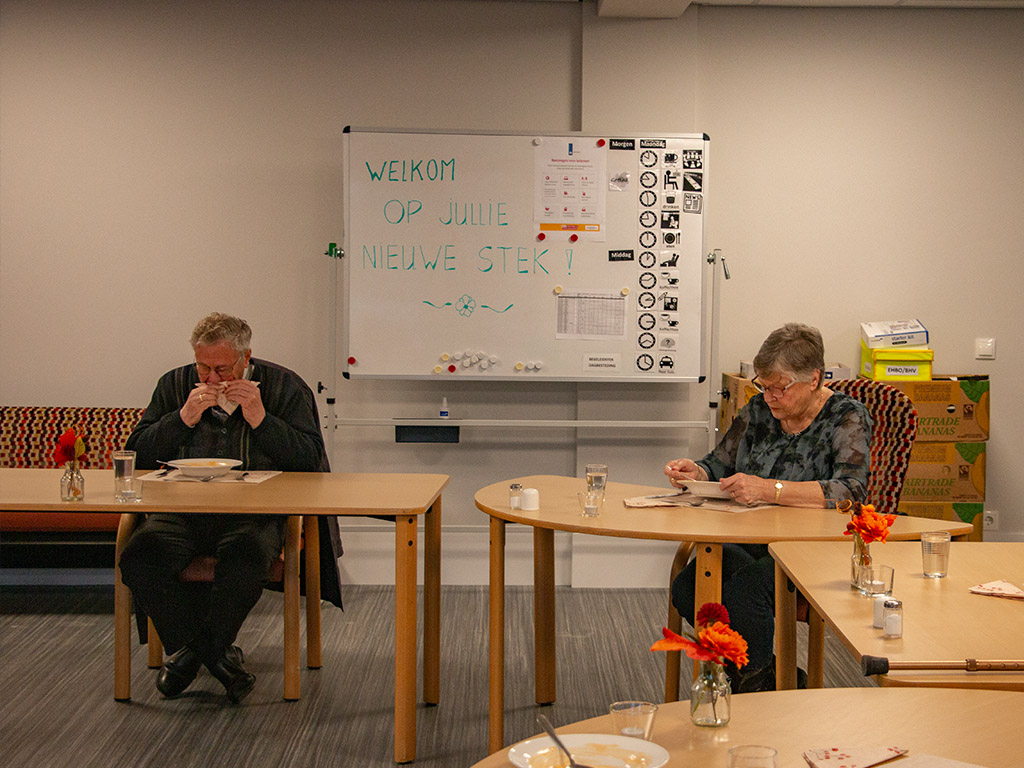 “Dankzij vele vrijwilligers konden we vlak voor het nieuwe jaar alles verhuizen vanaf het oude pand aan de Essenkamp,” vertelt Kees Zwaan, voorzitter van de Stichting Ontmoetingscentrum Koningin Wilhelminahof (SKWH). “De oude locatie is inmiddels verlaten en op 31 december opgeleverd aan Veluwewonen.”