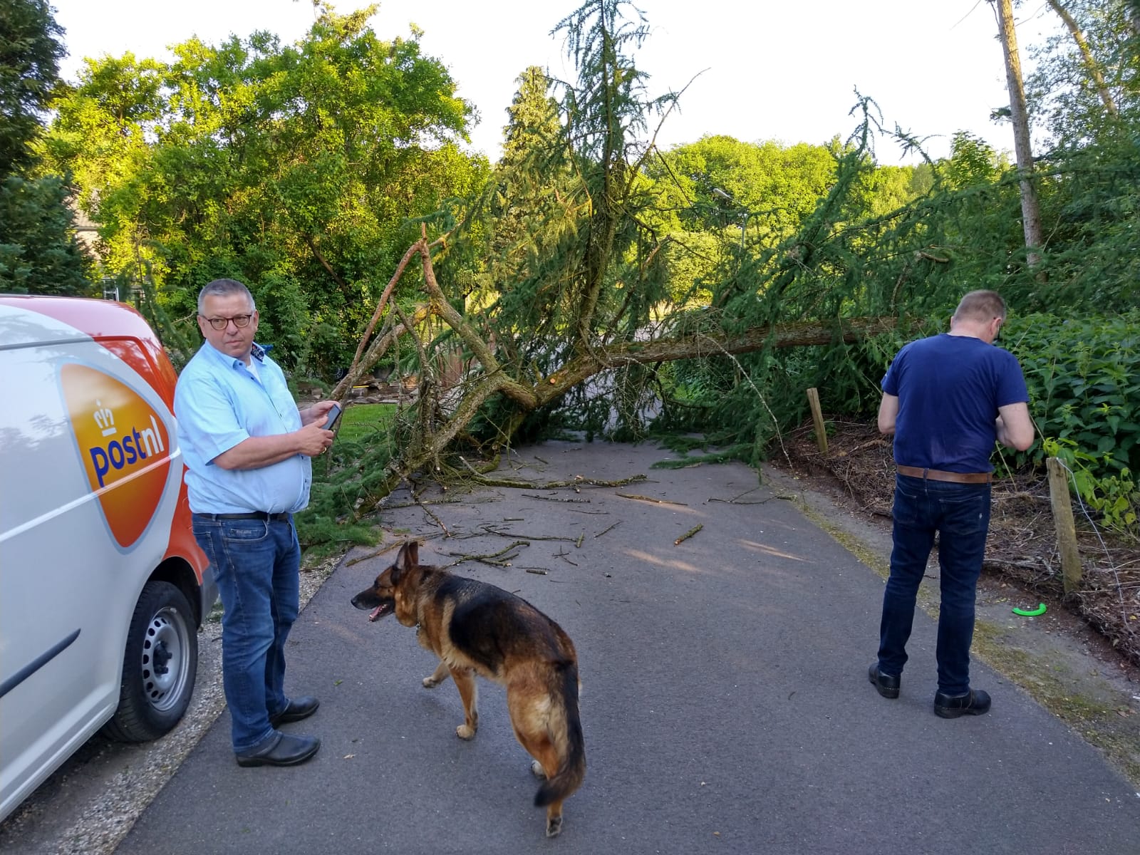 De boom was volgens omwonenden al aardig krom, maar hij viel vanavond nog vrij plotseling om. Daarbij miste de boom een auto van PostNL op een haar na.