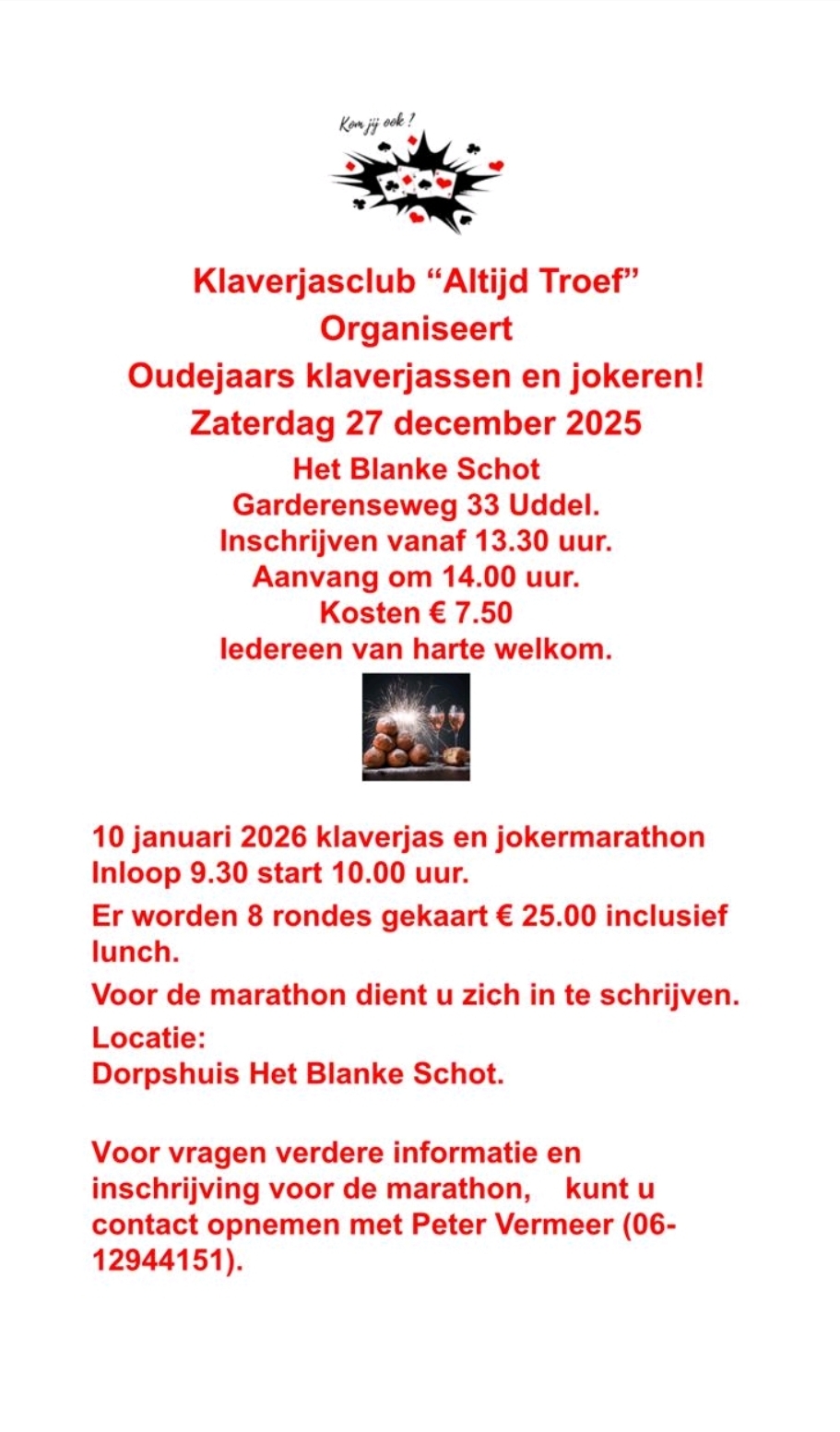 UDDEL – Hierboven treft u informatie over het Oudejaars klaverjassen en jokeren op zaterdag 27 december.