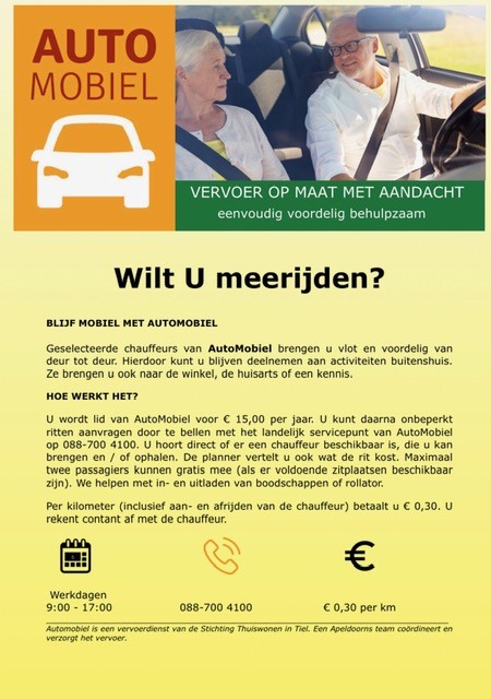 De start is vlekkeloos verlopen. Via het landelijke telefoonnummer 088-7004100 melden klanten zich aan als lid (€ 15,00 per jaar) en wordt de aangevraagde rit gepland. De klanten laten weten blij te zijn van huis opgehaald en na afloop van het bezoek weer veilig thuisgebracht te worden. AutoMobiel heeft intussen ongeveer 130 leden, in Apeldoorn, Hoenderloo, Ugchelen en Wenum Wiesel.
