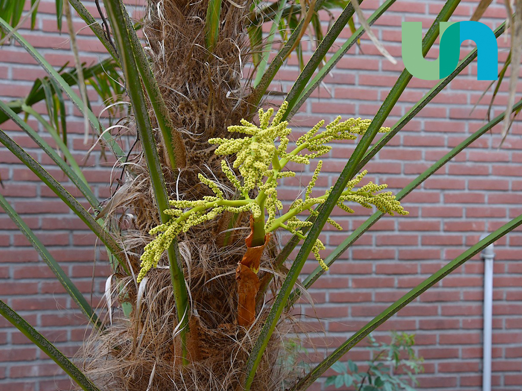 Wie er door de Koningin Wilhelminahof over de gangen wandelt en door de ramen naar buiten kijkt kan het niet missen: de prachtige palmboom die op dit moment in de bloei staat. Een boom die je niet direct verwacht in Uddel, verscholen achter de Wilhelminahof.