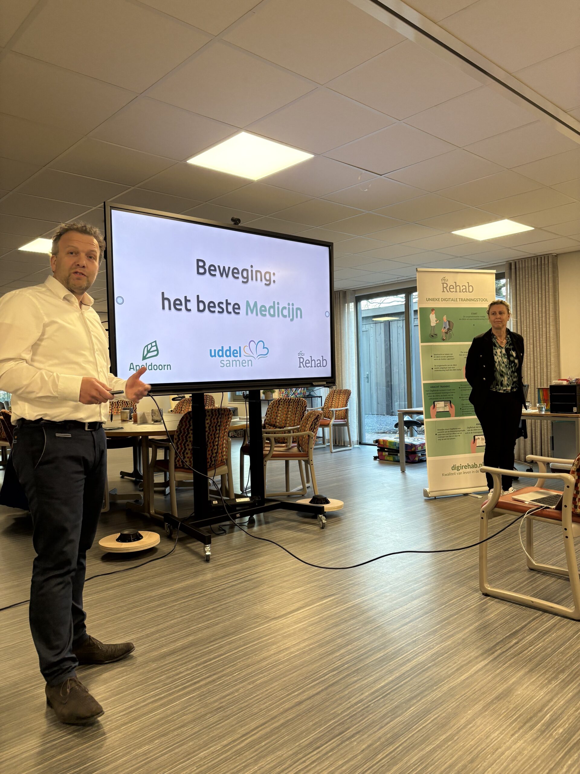 UDDEL – Woensdagavond 2 april vond in de Wilhelminahof de informatieavond plaats over het project Uddel Thuis in Beweging. Maar liefst 25 belangstellenden luisterden naar het verhaal van Arend Roos en Janine Davidse van DigiRehab. Het enthousiasme voor dit prachtige project was duidelijk merkbaar in de zaal.