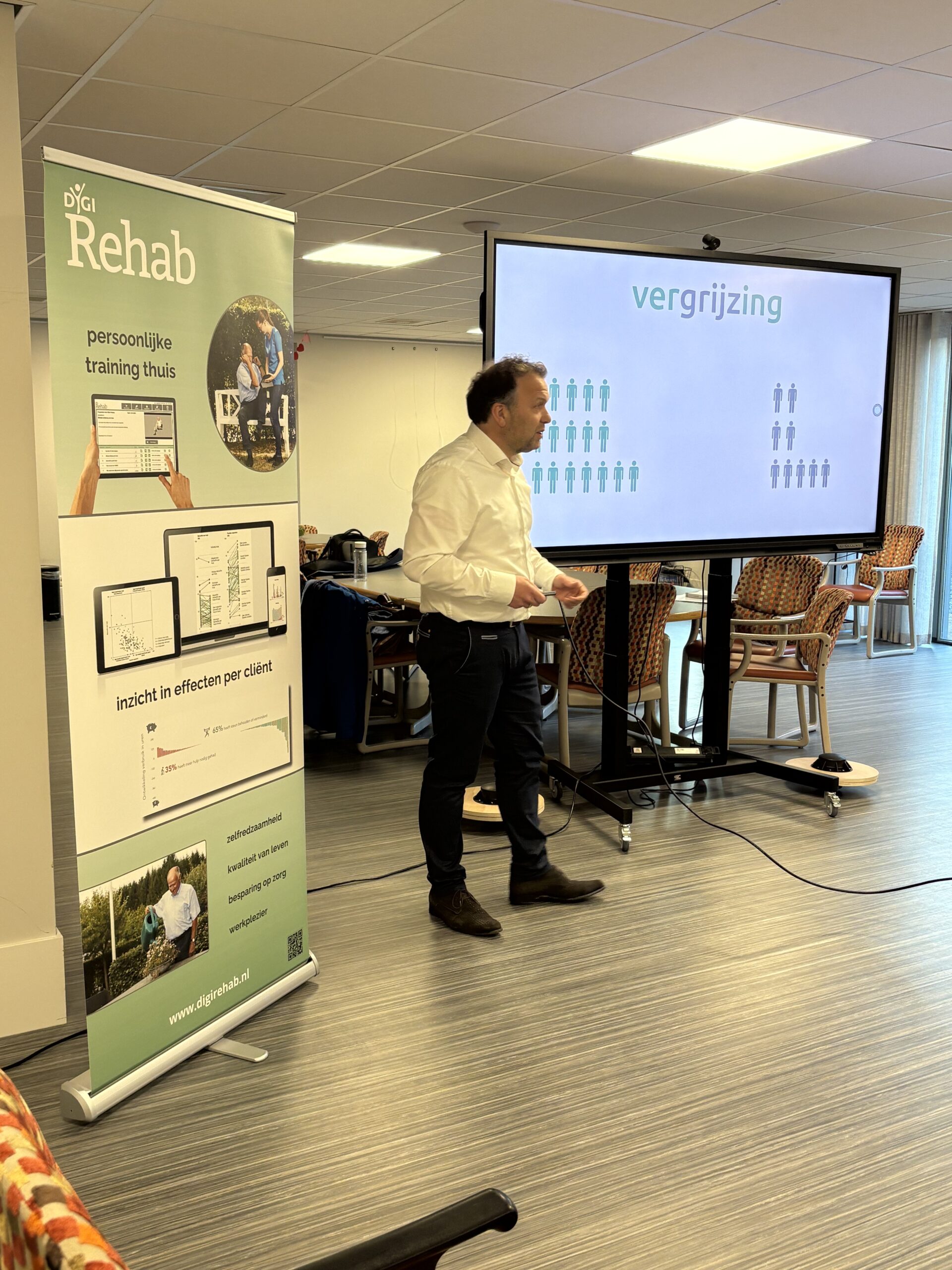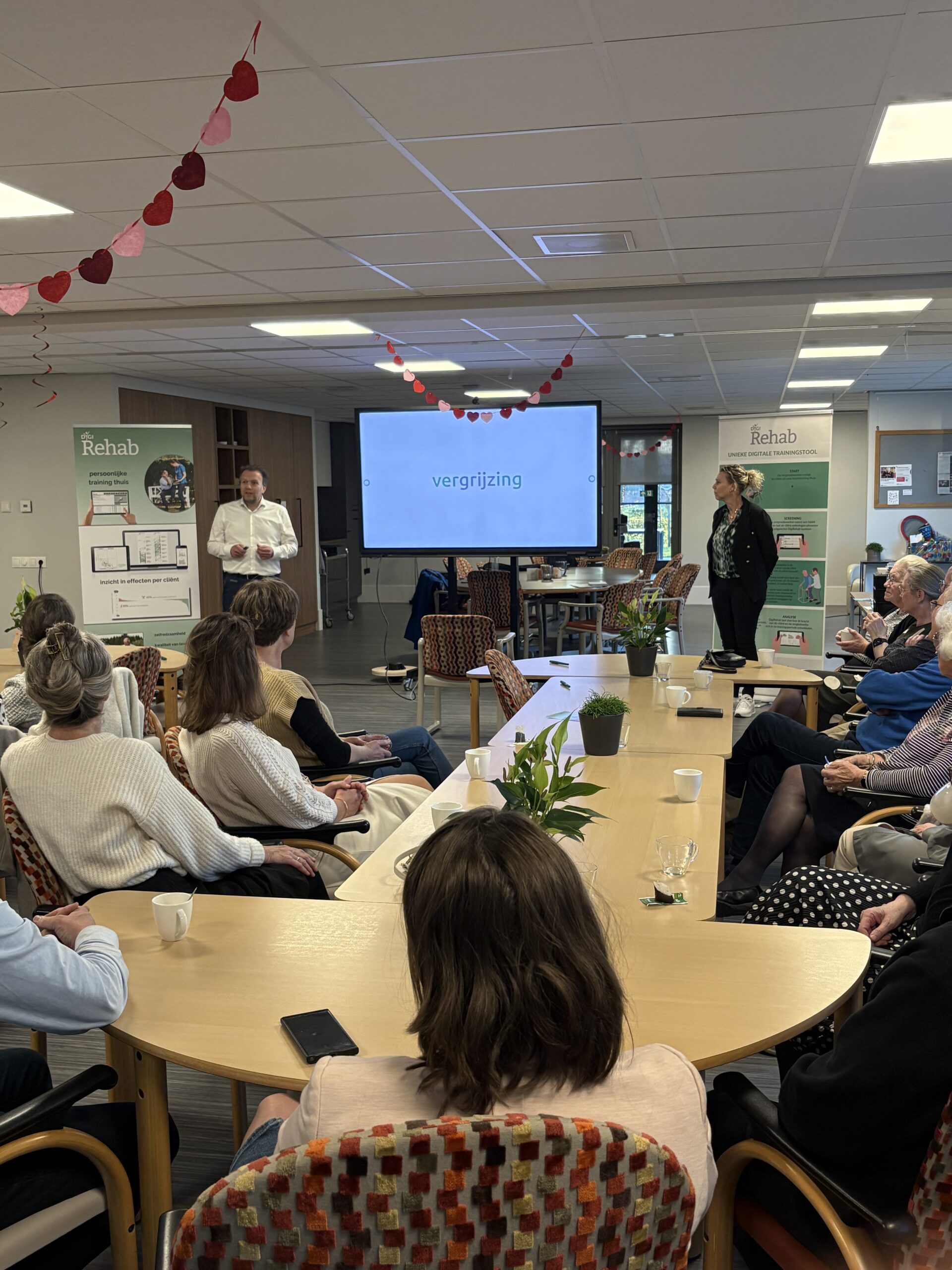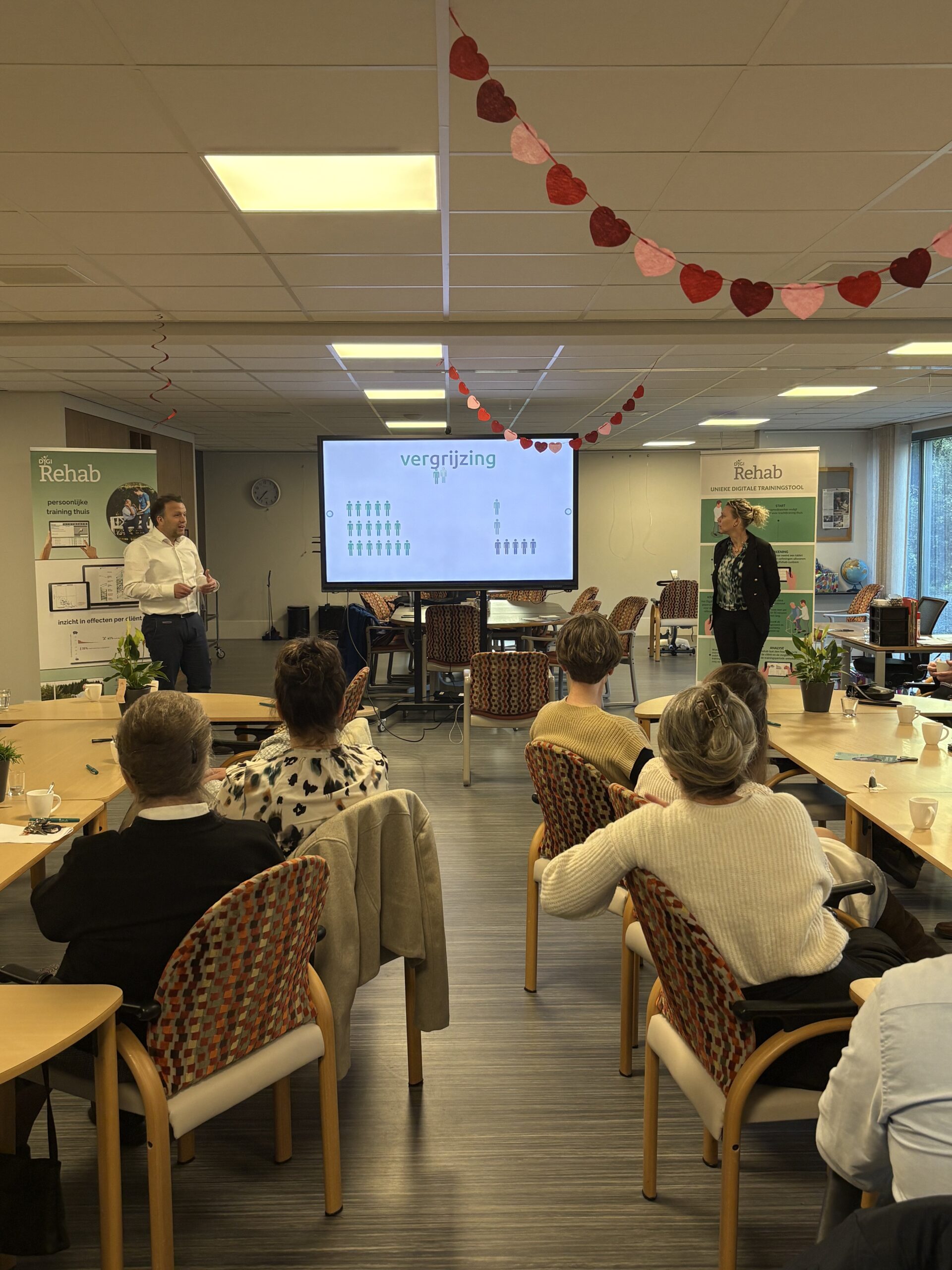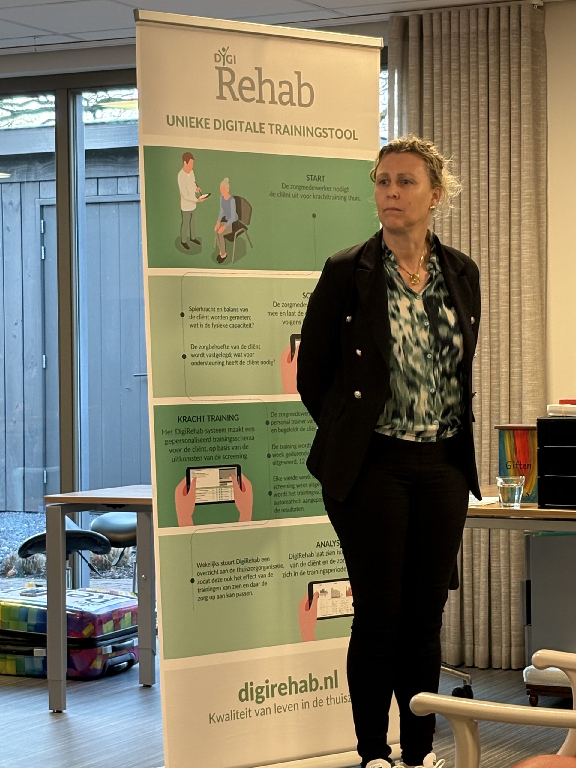Vervolgens demonstreerde Janine het oefenprogramma waarmee de trainer werkt. Ze maakte daarbij gebruik van een 74-jarig model zodat de demonstratie zo echt mogelijk was.