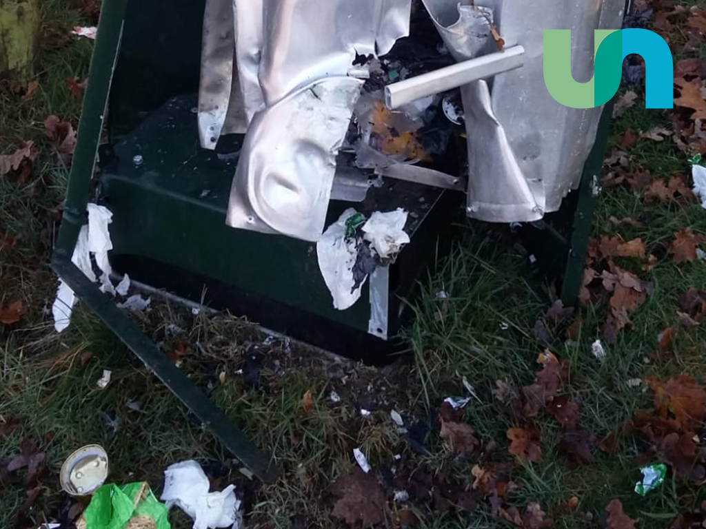 De inhoud van de prullenbak ligt her en der verspreid. Van de prullenbak zelf is weinig meer over. Mogelijk heeft er een ontploffing plaatsgevonden. Inmiddels is er ook melding gedaan van de schade bij de gemeente Nunspeet.
