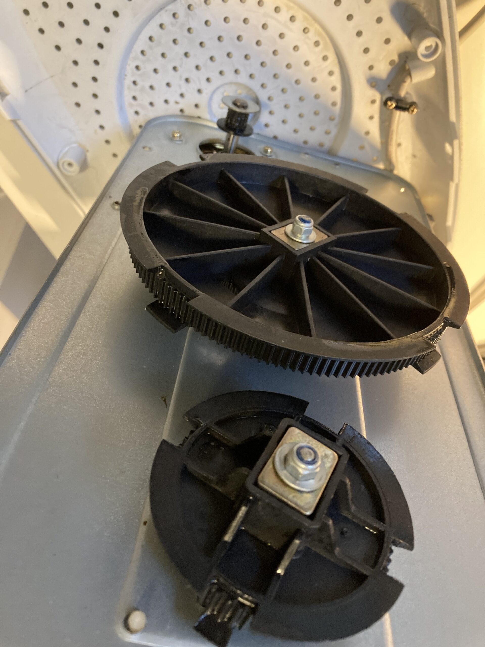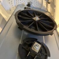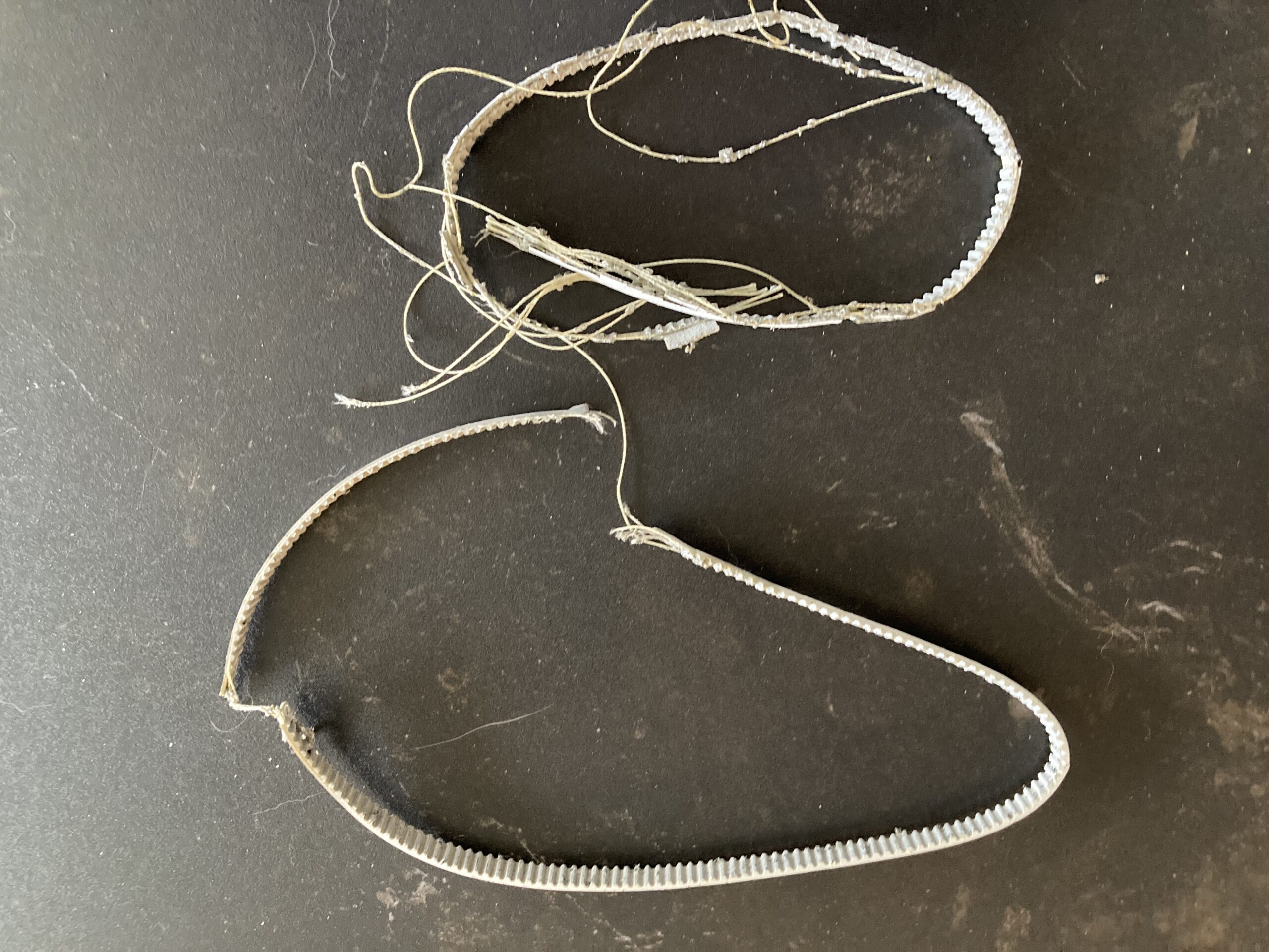We maakten de machine open en zagen dat de snaren volledig versleten waren (foto 2).