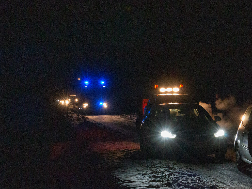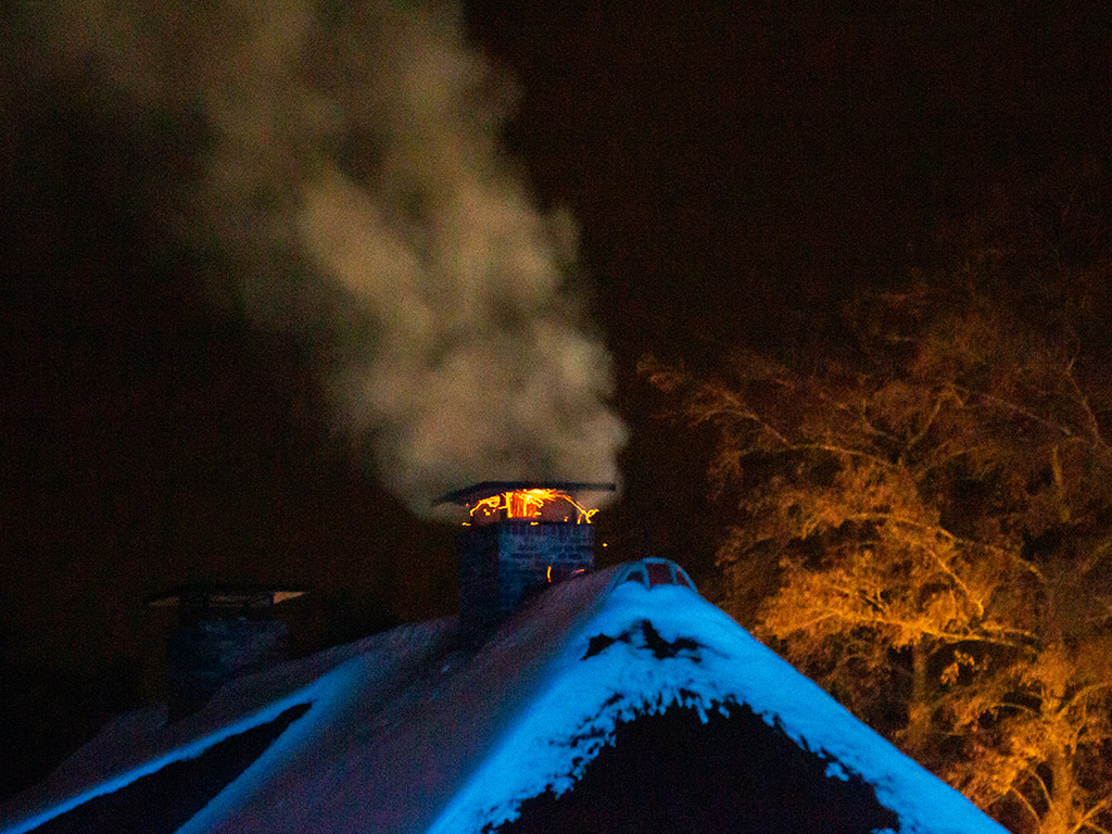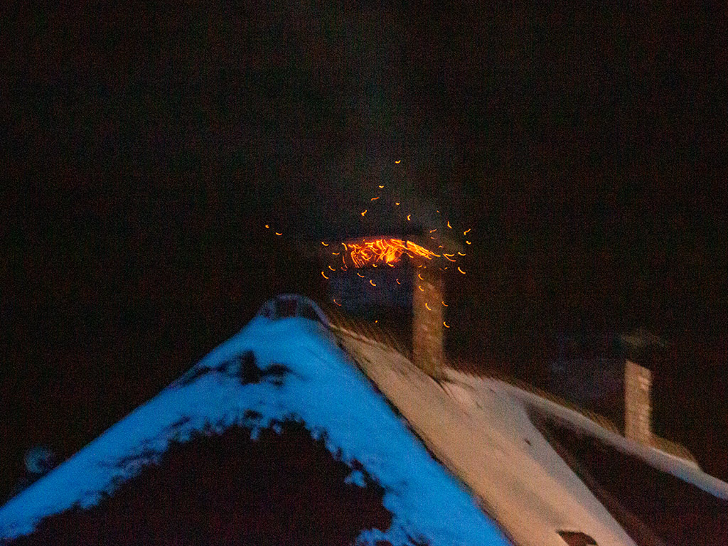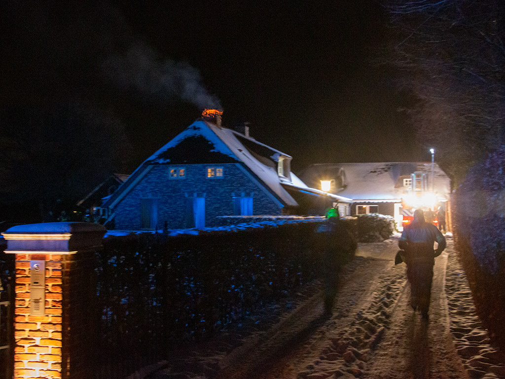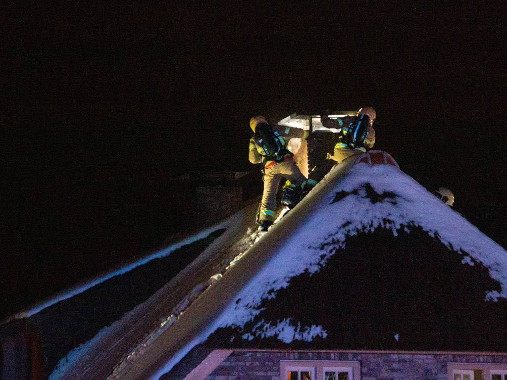 De rieten kap heeft dankzij de sneeuw geen vlam gevat. De woning is geventileerd.
