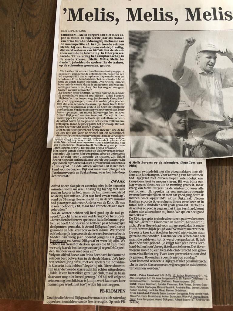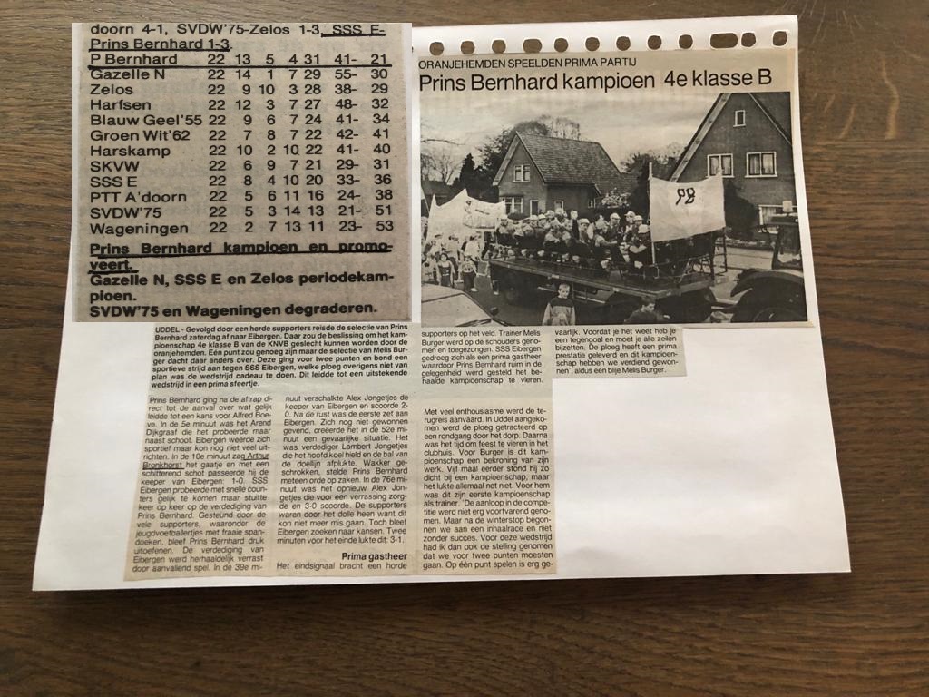 UDDEL – Veel van onze oudere leden en supporters zullen deze dag nog op het netvlies hebben staan. Spelers en supporters vertrokken met drie volle bussen achtervolgt door vele auto’s richting Eibergen waar Prins Bernhard het op moest nemen tegen S.S.S.E. Het toenmalig vlaggenschip wist daar het felbegeerde kampioenschap op de laatste speeldag veilig te stellen door de ploeg uit Eibergen te verslaan. Eindstand: 1-3.