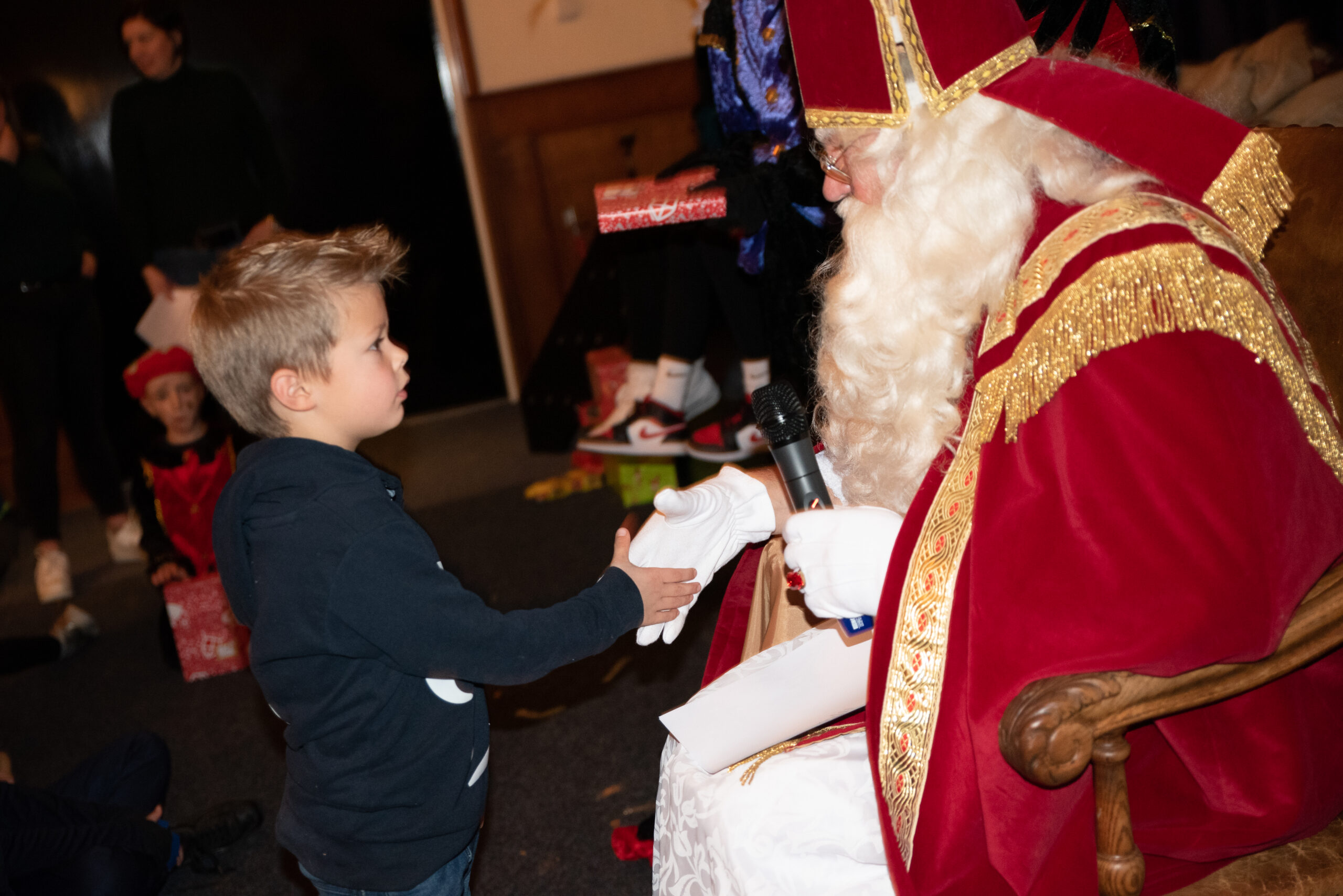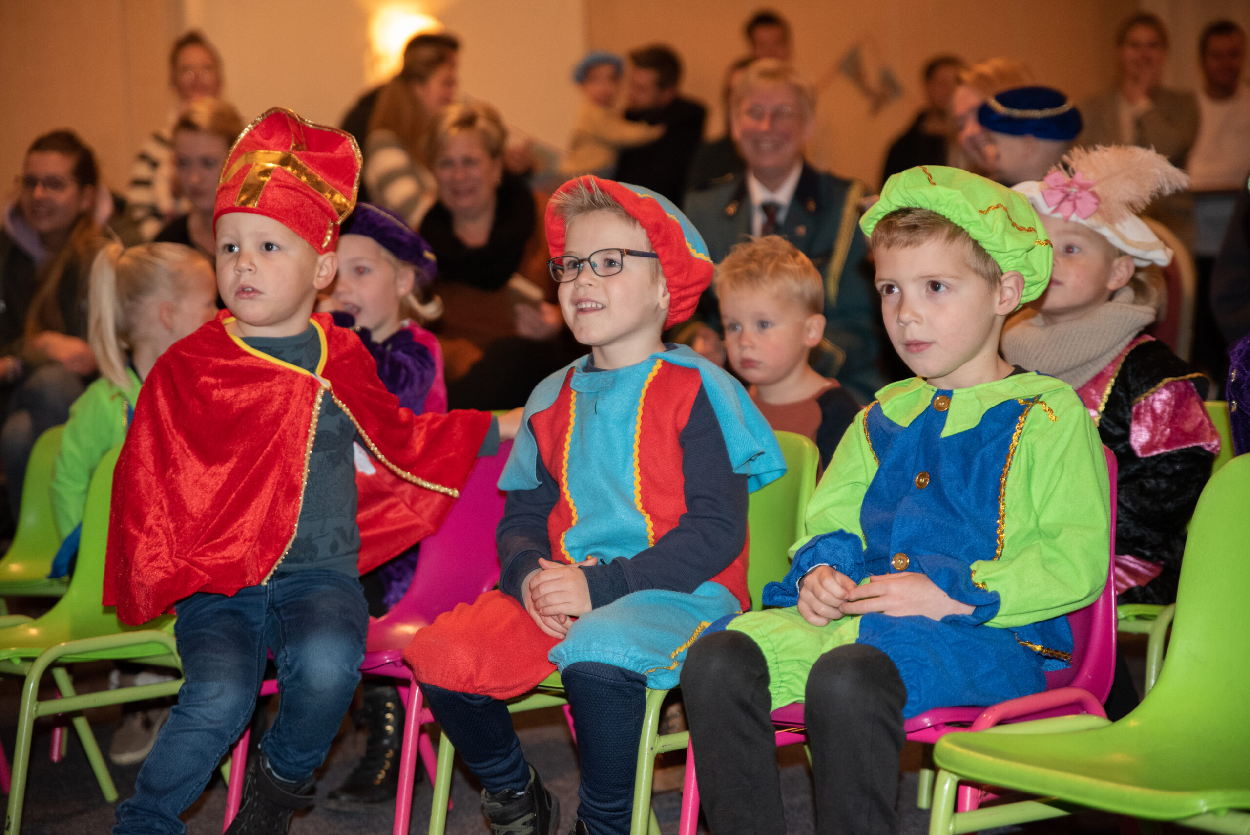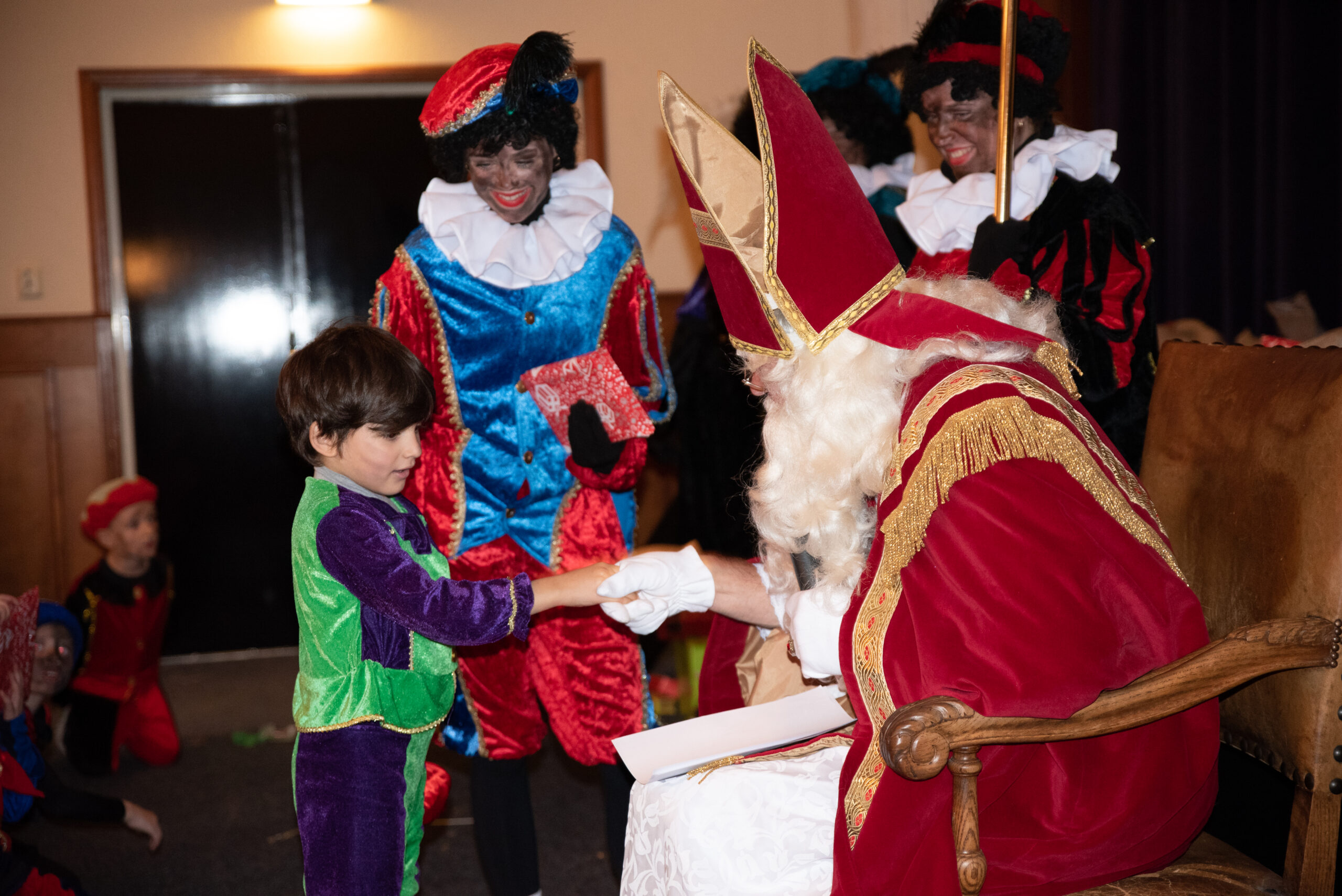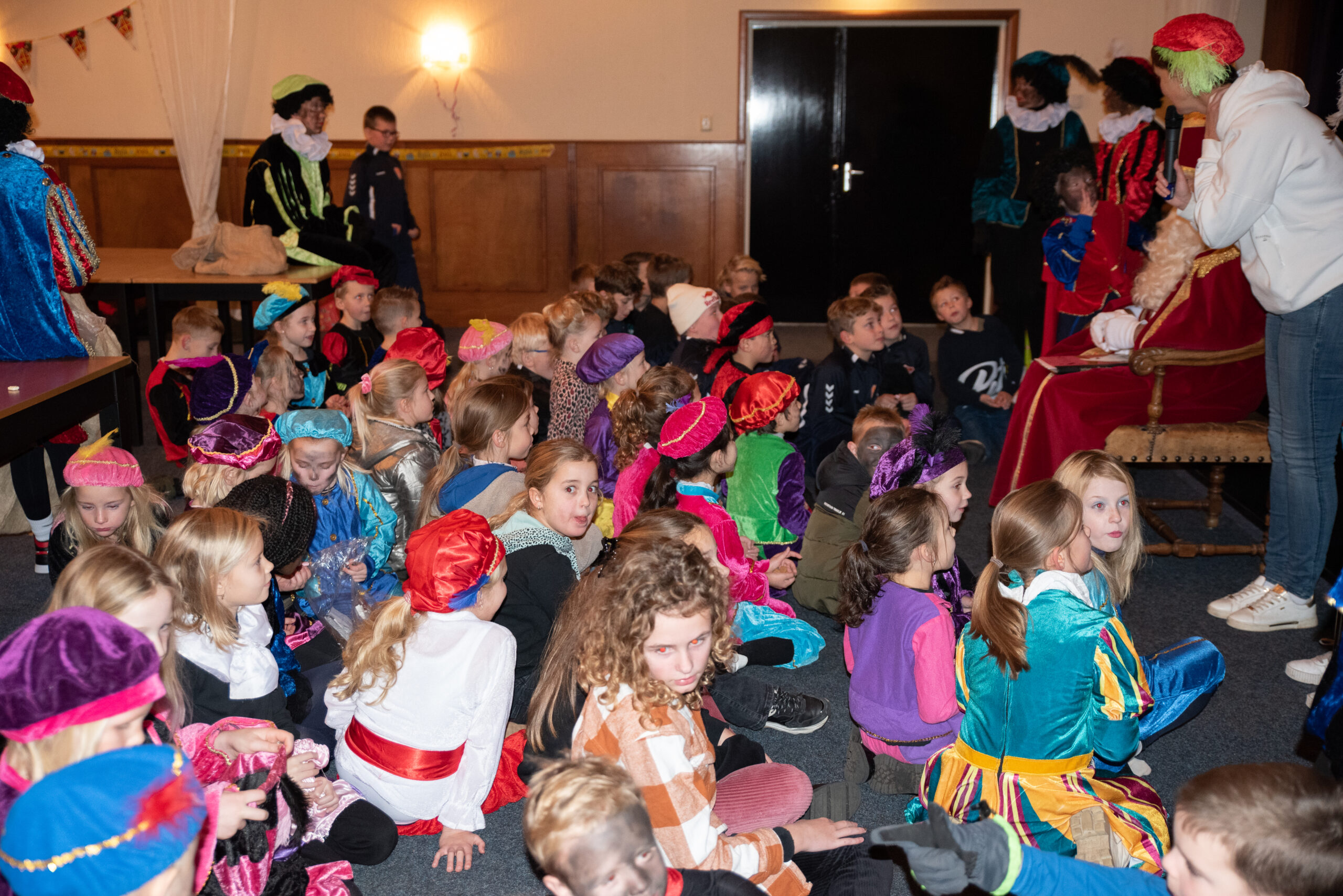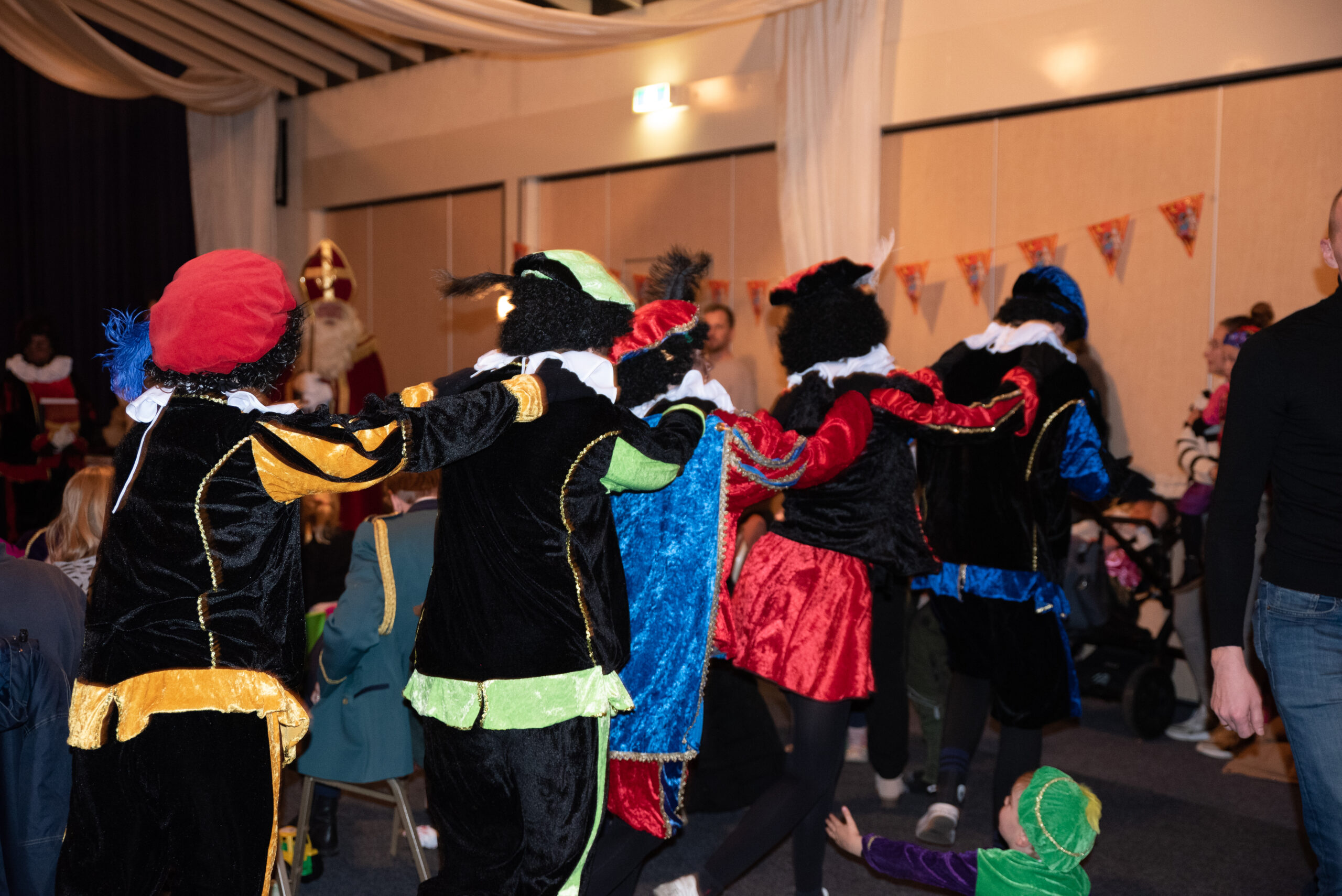 Om 10:30 begon het feest voor de kleinere kinderen. Sinterklaas heeft een stukje voorgelezen uit een mooi boek, de kinderen luisterden aandachtig. Daarna was het tijd om even een dansje te doen met de danspietjes.