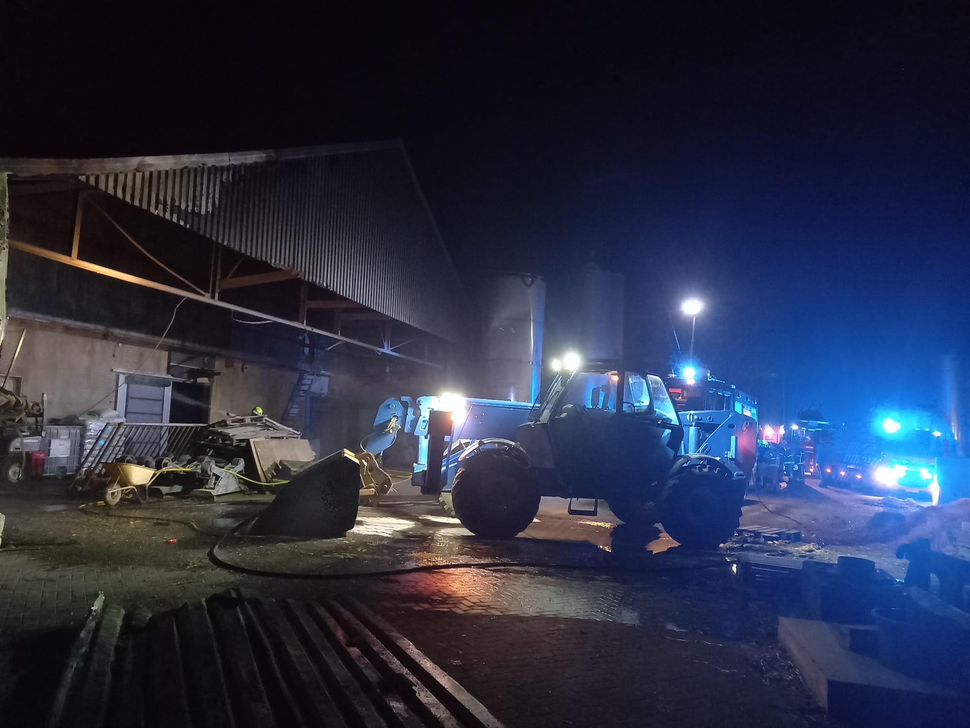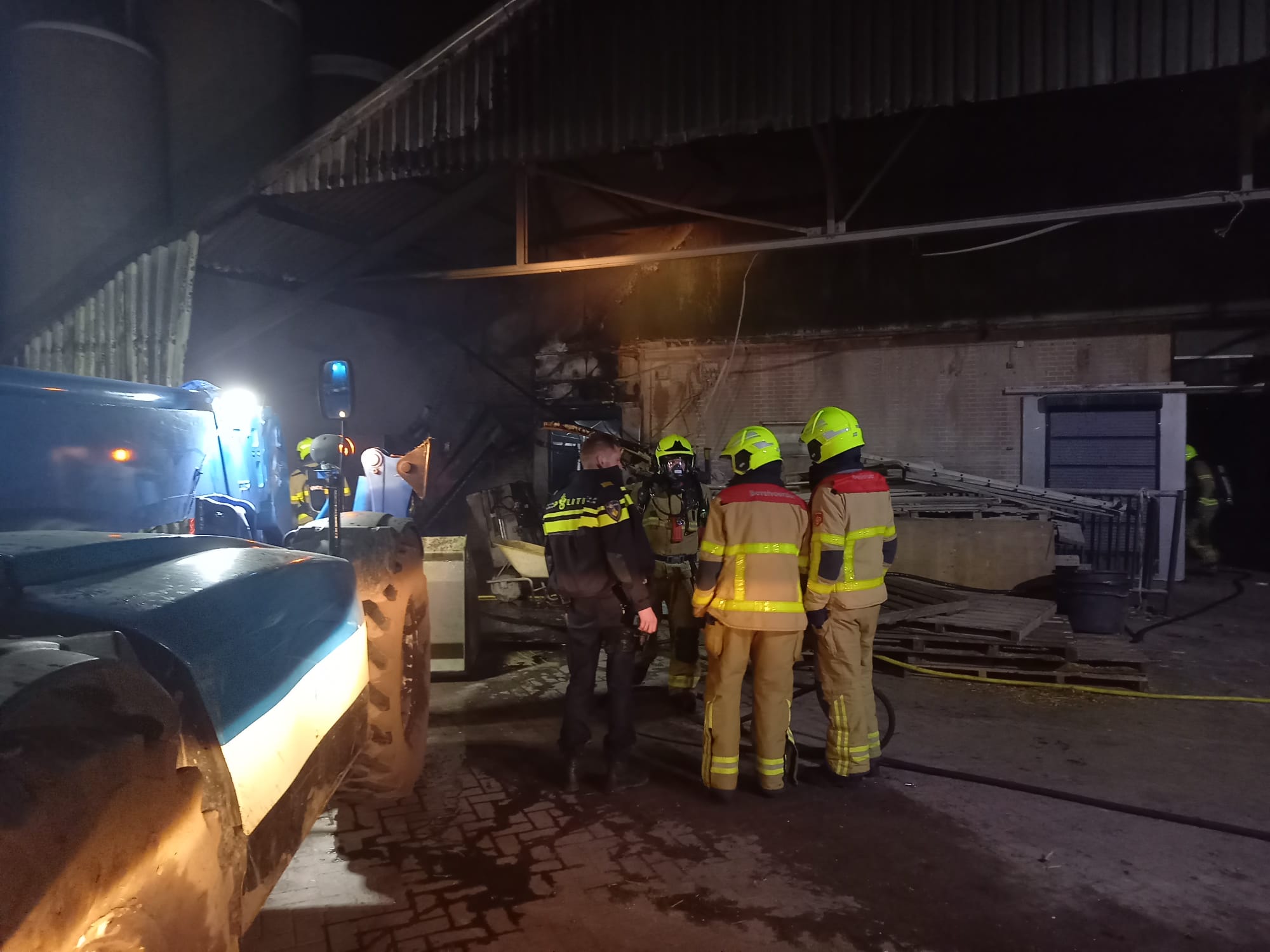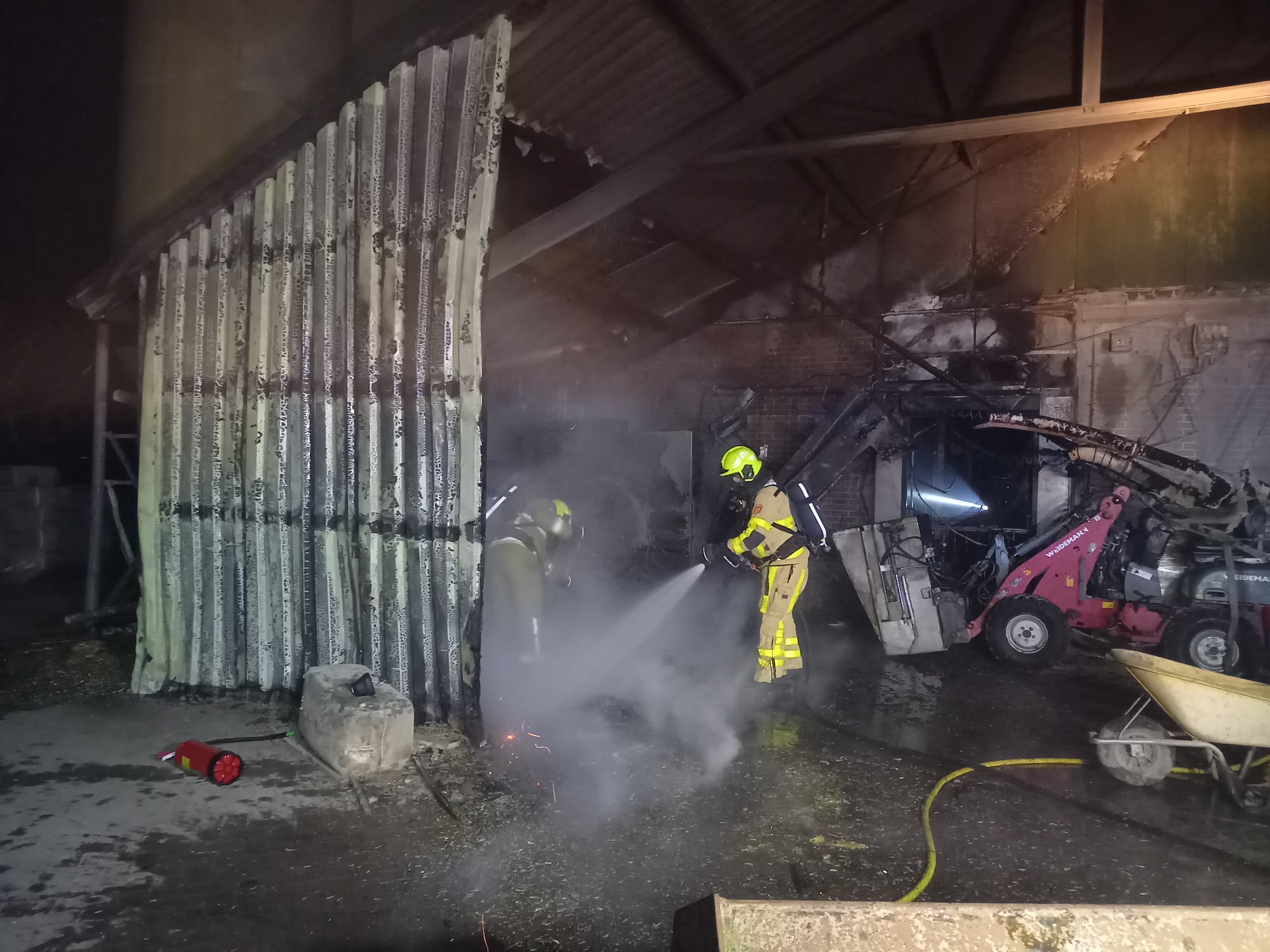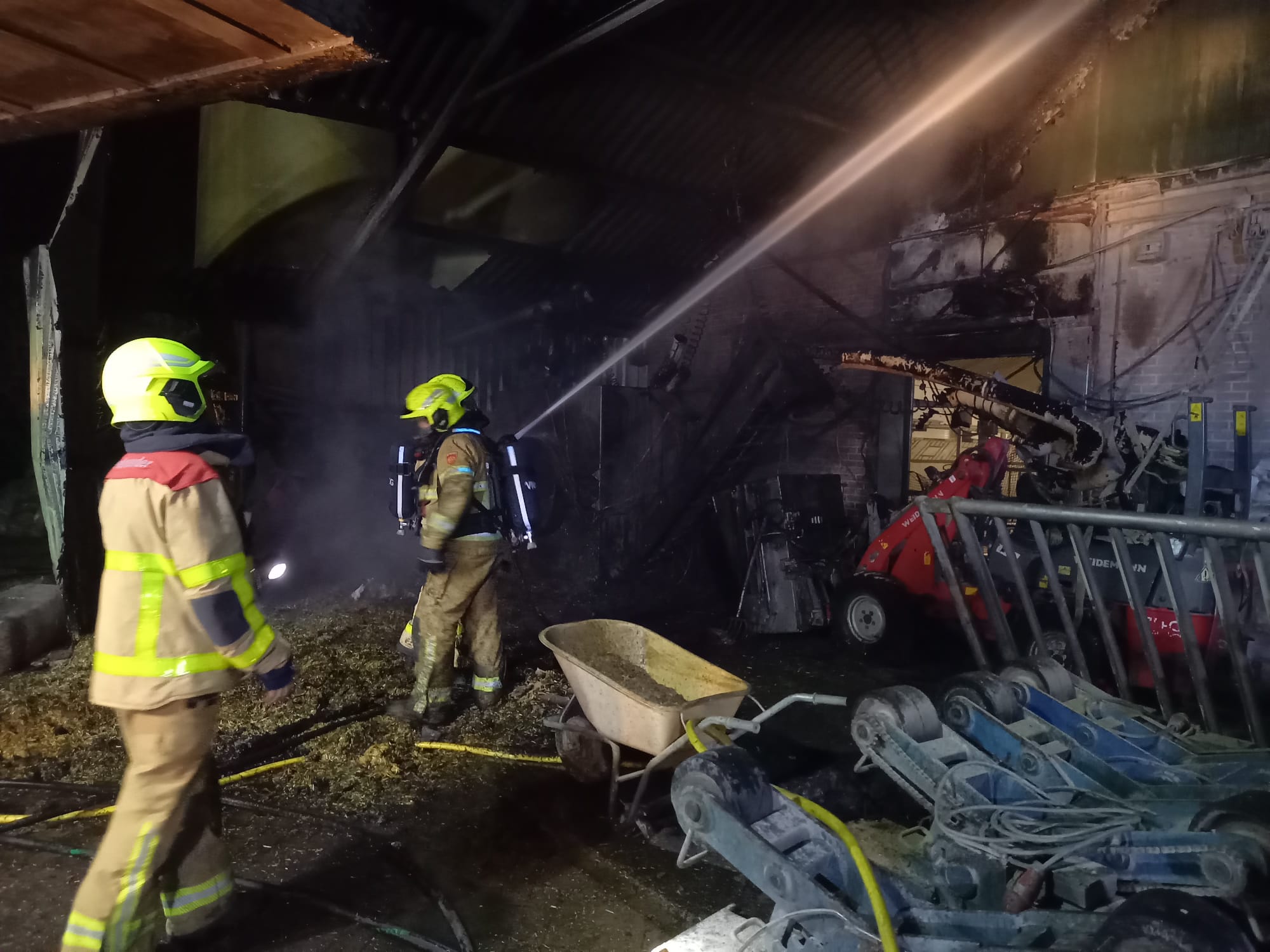 UDDEL – Zondagmorgen, 7 april, om 5.22 uur gingen de pagers van Brandweer Uddel voor een stalbrand aan het Uddelerveen in Uddel. Onderweg werd er door de meldkamer opgeschaald naar grote brand in verband met de hoeveelheid kalveren die daar aanwezig zijn. Ter plaatse bleek het te gaan om een brand onder een afdak waar stro en een voermachine in brand stonden. Door snel optreden werd voorkomen dat de brand zich uitbreidde naar de kalverschuur. De schade bleef beperkt tot enkele machines en schade aan de overkapping.