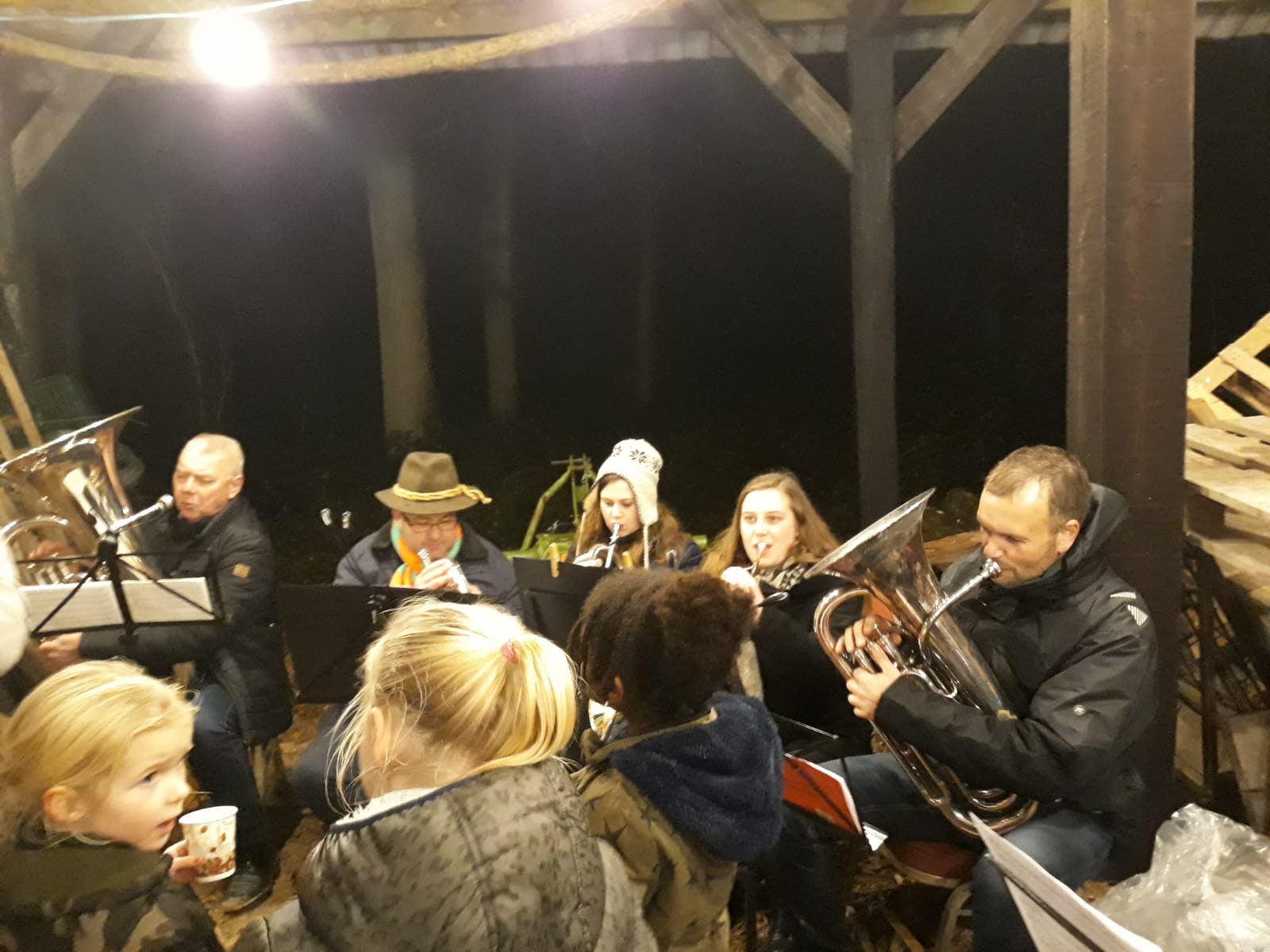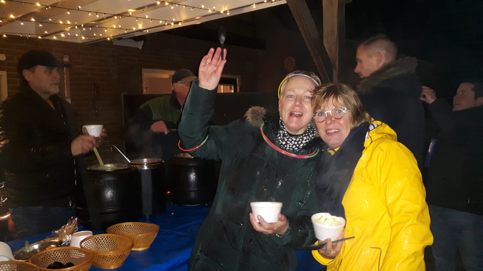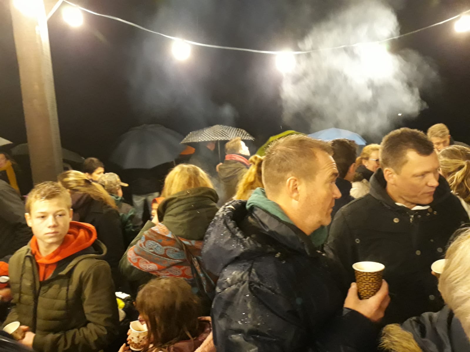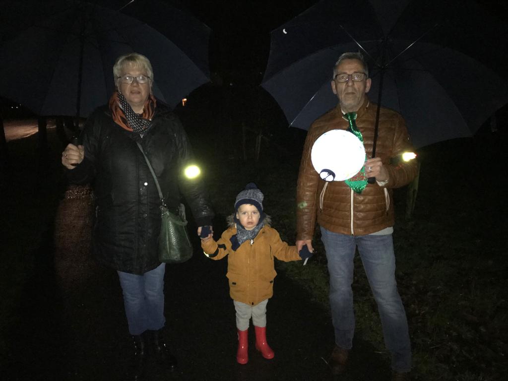 Gelukkig stopte de regen na een korte tijd, maar in de bossen werd het er niet beter op, helaas. Door de waterplassen van lampje naar lampje. Onderweg was het toch super gezellig en bij de eerste ‘muzikale’ stop kreeg men chocomel of glühwein en bij de tweede een heerlijk bakje erwtensoep om weer warm te worden. Tijdens deze stops bracht een ensemble van muziekvereniging Juliana sfeervolle muziek ten gehore, wat de gehele ervaring compleet maakte.