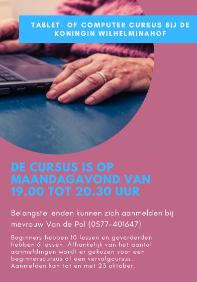 Na de herfstvakantie gaat er weer een tablet- of computercursus van start bij de Koningin Wilhelminahof. Belangstellenden kunnen zich hiervoor aanmelden bij mevrouw Van de Pol (0577-401647).