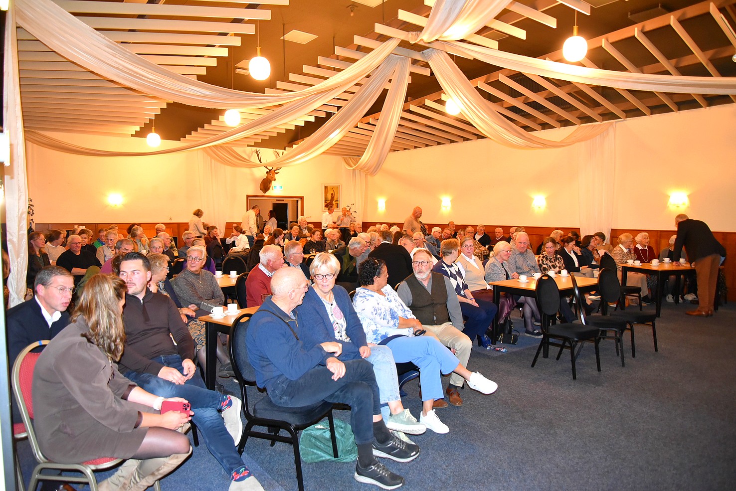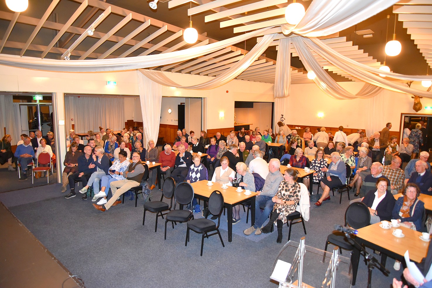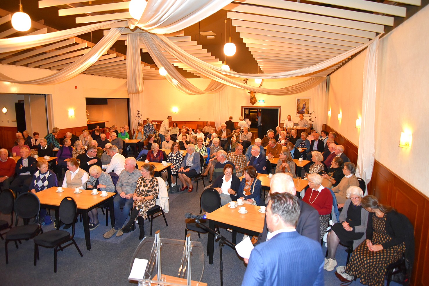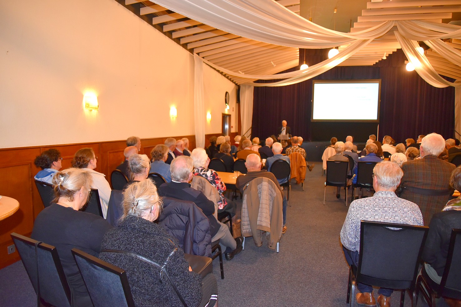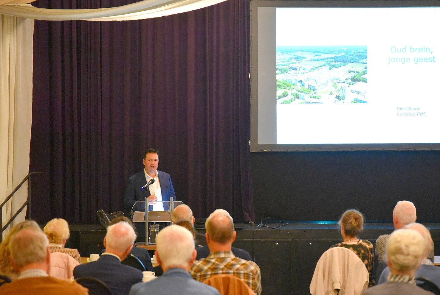De aanwezigen luisteren aandachtig naar de presentatie van dorpsgenoot professor doctor Elbert Geuze, hoogleraar Neurowetenschap van stress en trauma. Het thema is “Veranderingen in het brein bij het ouder worden”.