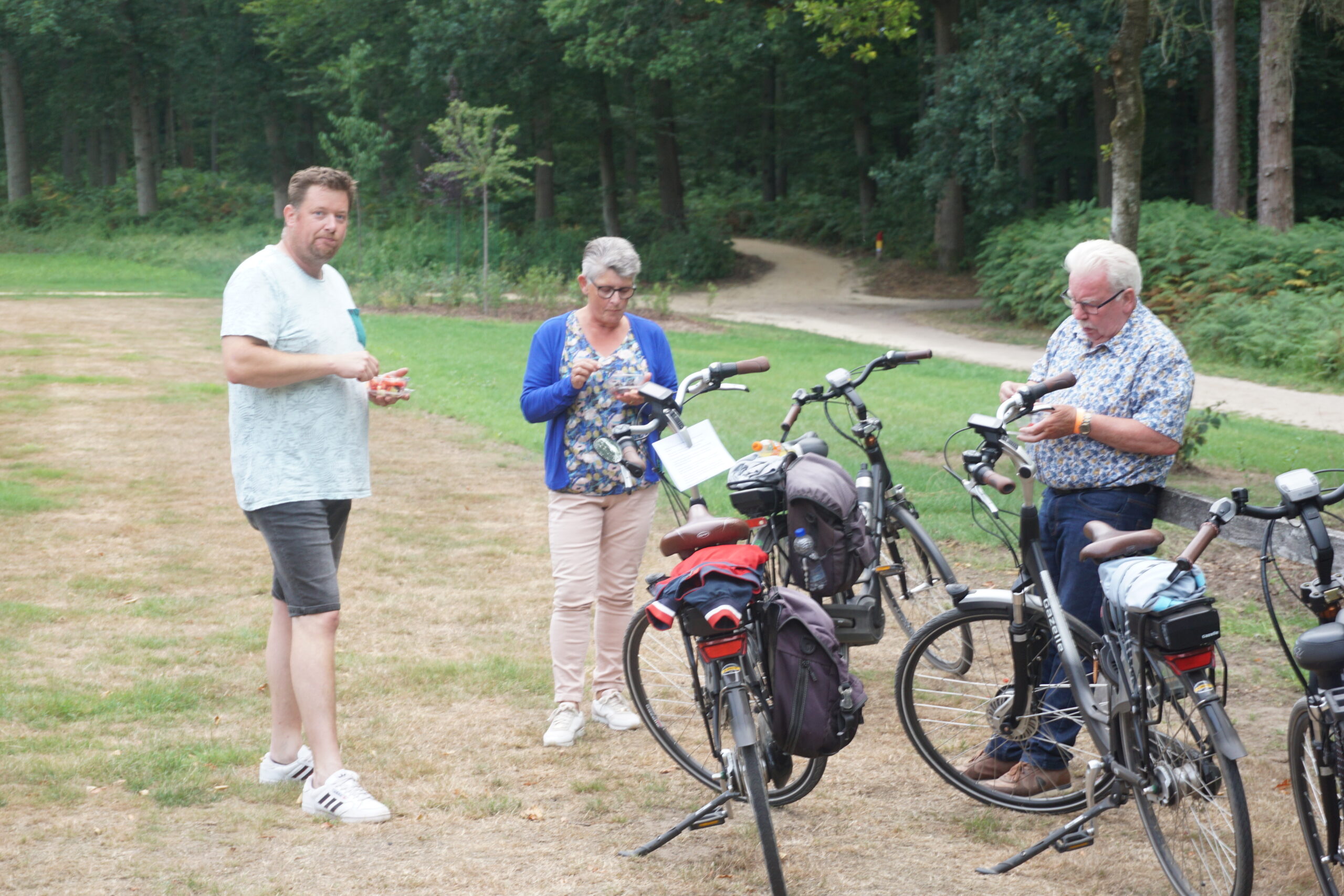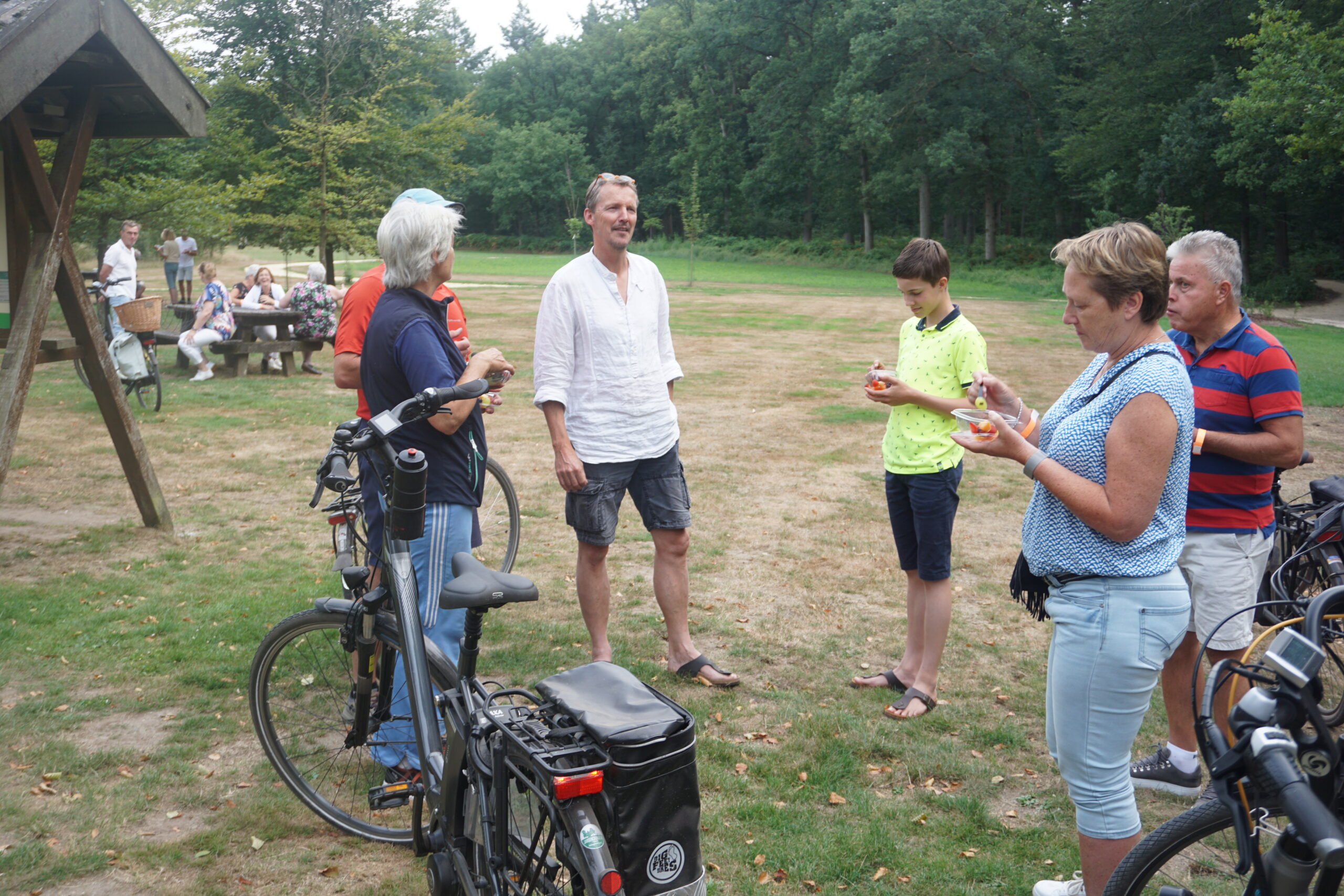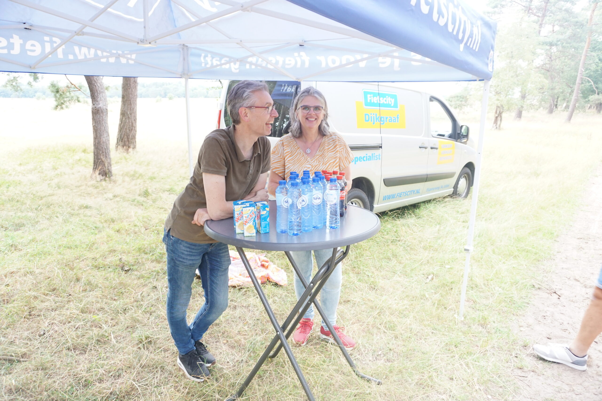 Hierna weer een pittig stukje fietsen over de heide met wat mullige paadjes, maar niet getreurd, er was ook aan de dorstige mens gedacht. Bij de vierde stop stond fietscity Dijkgraaf te wachten met een heerlijk flesje koud drinken, waar men wel aan toe was.