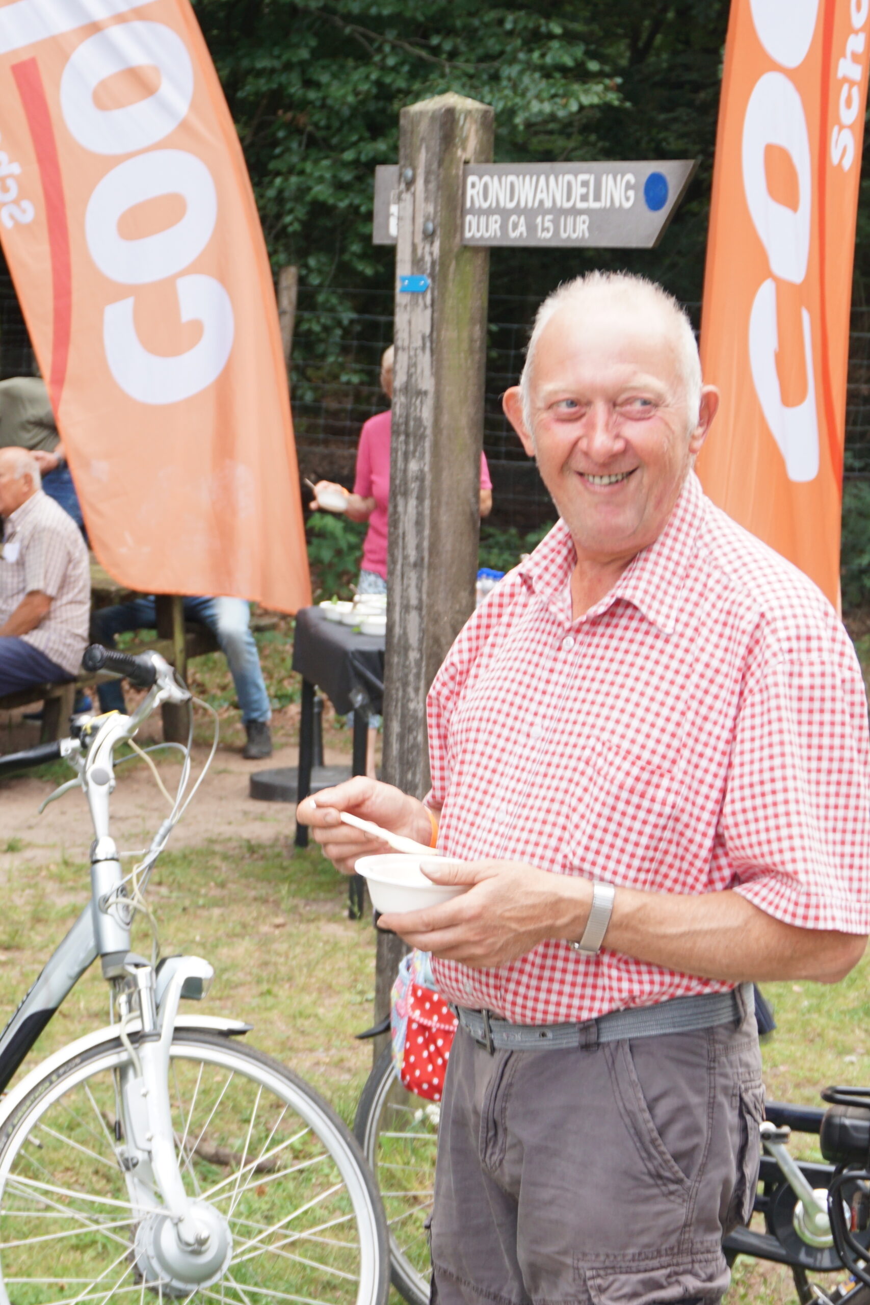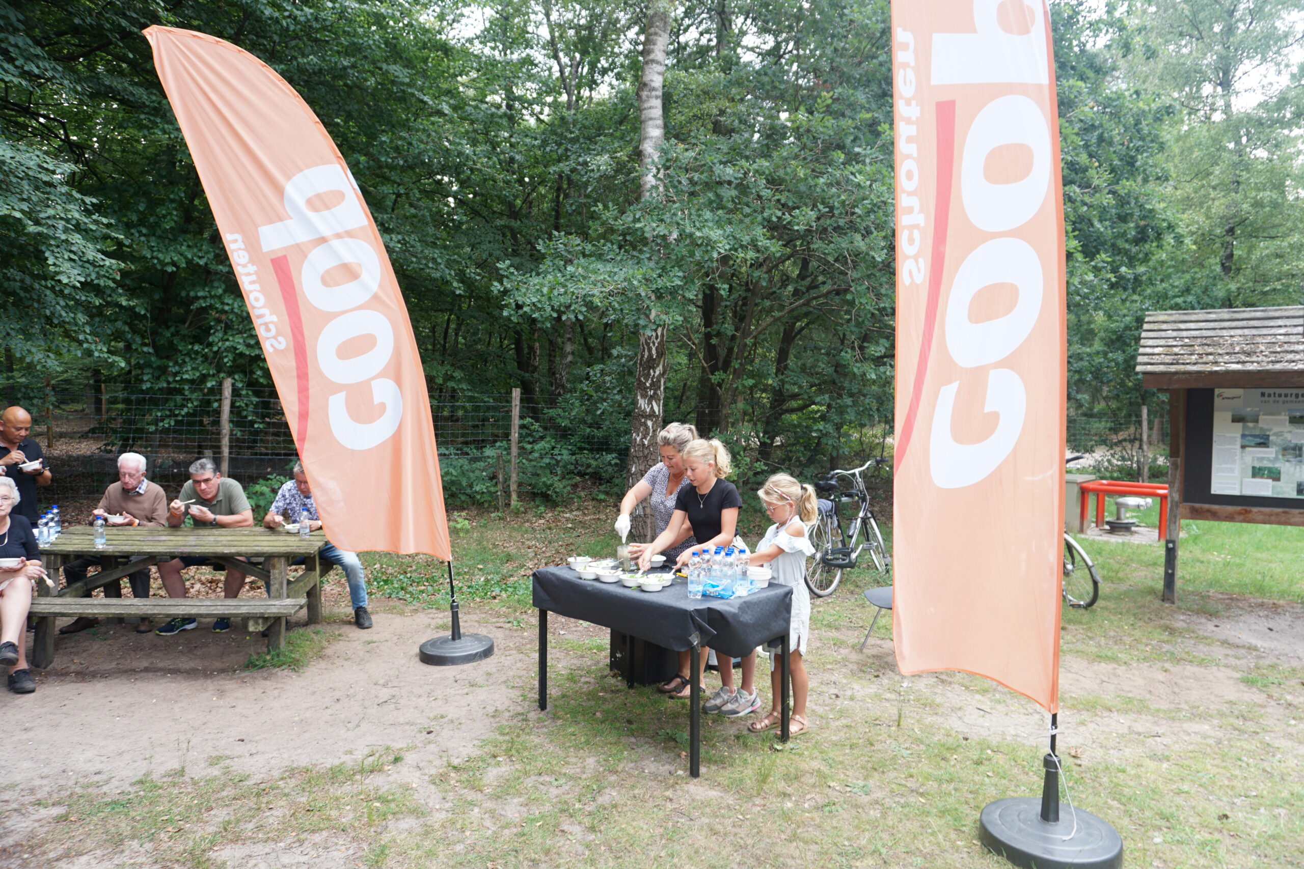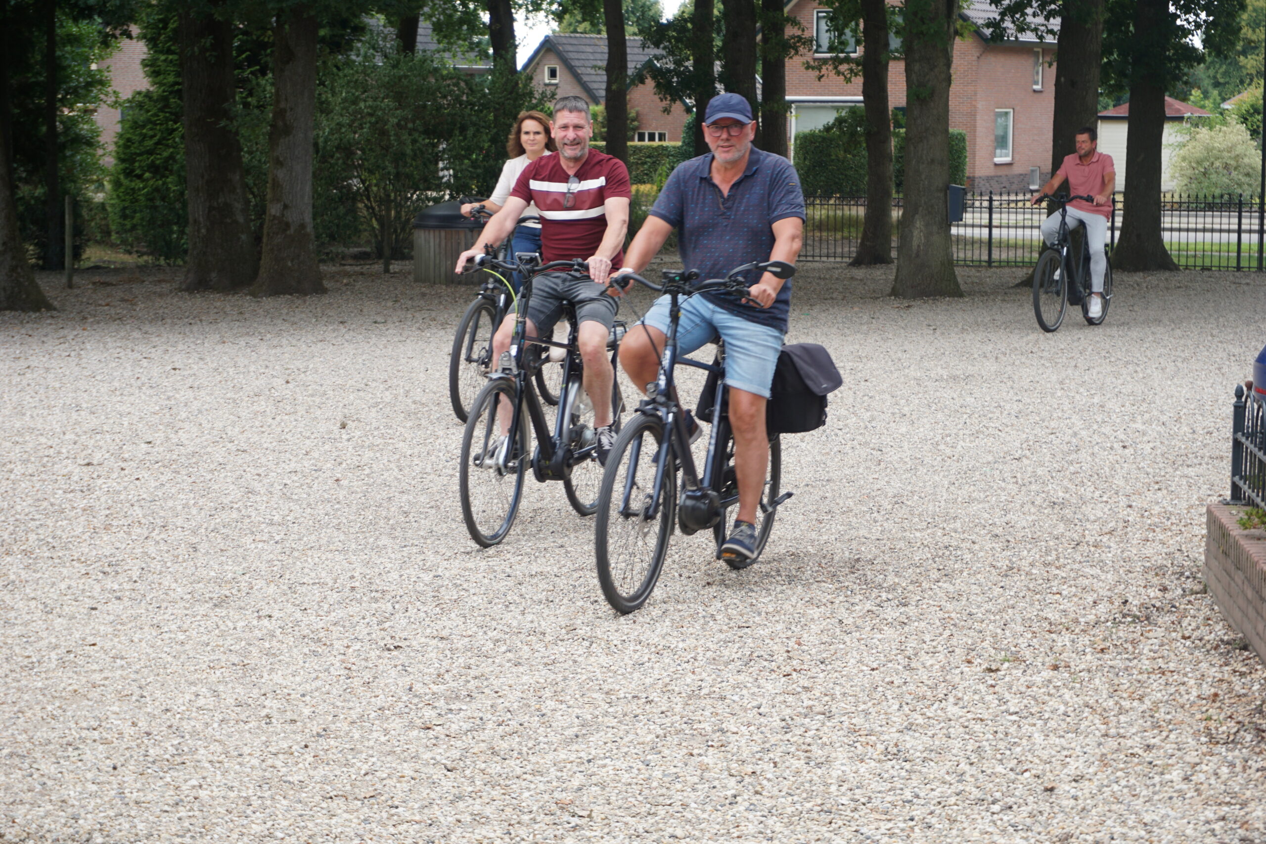 Hierna weer een pittig stukje fietsen over de heide met wat mullige paadjes, maar niet getreurd, er was ook aan de dorstige mens gedacht. Bij de vierde stop stond fietscity Dijkgraaf te wachten met een heerlijk flesje koud drinken, waar men wel aan toe was.