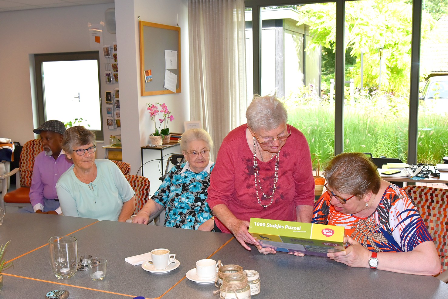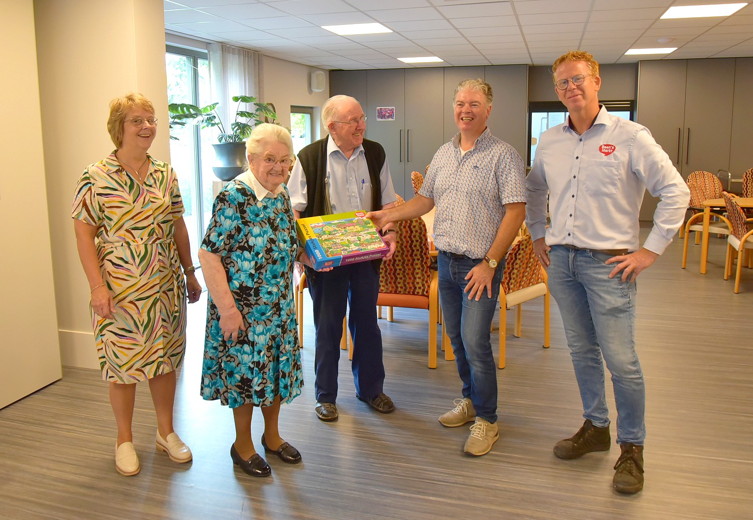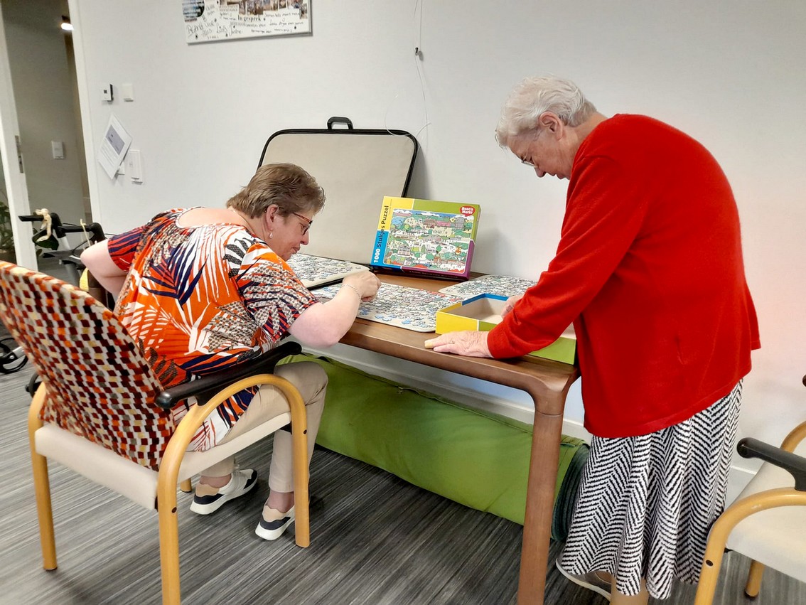 Woensdagmorgen 13 september kreeg deze prachtige actie een ‘officieel’ tintje. Jeanet Schouten en Evert-Jan van Egteren van Boon’s Markt Uddel waren naar de Wilhelminahof gekomen om het eerste exemplaar te overhandigen aan Kees Zwaan, voorzitter van Uddel Samen, en de oudste bezoekers van de dagbesteding, mevrouw Van den Broek en de heer Le Comte. Met deze puzzel kunnen de bezoekers van de dagbesteding in de Wilhelminahof hun hart ophalen en kijken of ze de afbeeldingen herkennen die er op de puzzel staan. En daar begonnen ze meteen mee. ’s Middags werd er al volop gepuzzeld.